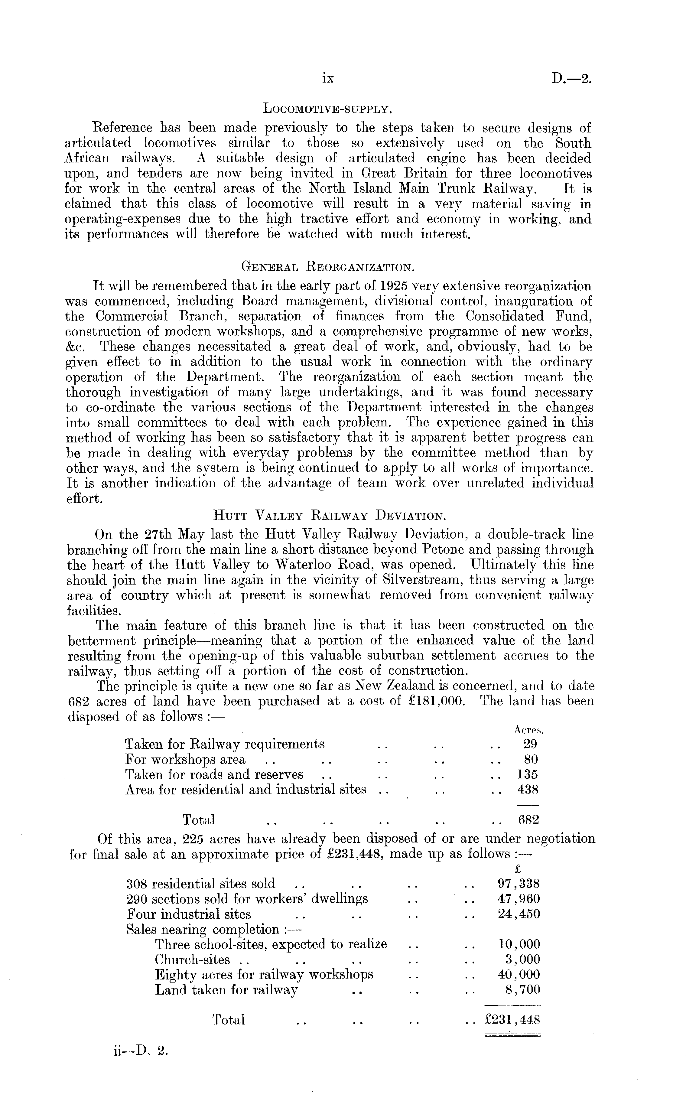 Locomotive-supply. Reference has been made previously to the steps taken to secure designs of articulated locomotives similar to those so extensively used on the South African railways. A suitable design of articulated engine has been decided upon, and tenders are now being invited in Great Britain for three locomotives for work in the central areas of the North Island Main Trunk Railway. It is claimed that this class of locomotive will result in a very material saving in operating-expenses due to the high tractive effort and economy in working, and its performances will therefore be watched with much interest. General Reorganization. It will be remembered that in the early part of 1925 very extensive reorganization was commenced, including Board management, divisional control, inauguration of the Commercial Branch, separation of finances from the Consolidated Fund, construction of modern workshops, and a comprehensive programme of new works, &c. These changes necessitated a great deal of work, and, obviously, had to be given effect to in addition to the usual work in connection with the ordinary operation of the Department. The reorganization of each section meant the thorough investigation of many large undertakings, and it was found necessary to co-ordinate the various sections of the Department interested in the changes into small committees to deal with each problem. The experience gained in this method of working has been so satisfactory that it is apparent better progress can be made in dealing with everyday problems by the committee method than by other ways, and the system is being continued to apply to all works of importance. It is another indication of the advantage of team work over unrelated individual effort. Hutt Valley Railway Deviation. On the 27th May last the Hutt Valley Railway Deviation, a double-track line branching off from the main line a short distance beyond Petone and passing through the heart of the Hutt Valley to Waterloo Road, was opened. Ultimately this line should join the main line again in the vicinity of Silverstream, thus serving a large area of country which at present is somewhat removed from convenient railway facilities. The main feature of this branch line is that it has been constructed on the betterment principle —meaning that a portion of the enhanced value of the land resulting from the opening-up of this valuable suburban settlement accrues to the railway, thus setting off a portion of the cost of construction. The principle is quite a new one so far as New Zealand is concerned, and to date 682 acres of land have been purchased at a cost of £181,000. The land has been disposed of as follows : — Acres. Taken for Railway requirements . . . . 29 For workshops area . . .. .. .. 80 Taken for roads and reserves .. .. . . 135 Area for residential and industrial sites . . . . . . 438 Total .. .. .. .. .. 682 Of this area, 225 acres have already been disposed of or are under negotiation for final sale at an approximate price of £231,448, made up as follows : — £ 308 residential sites sold .. . . .. .. 97,338 290 sections sold for workers' dwellings . . . . 47,960 Four industrial sites .. .. .. .. 24,450 Sales nearing completion : — Three school-sites, expected to realize .. .. 10,000 Church-sites .. . . .. . . . . 3,000 Eighty acres for railway workshops .. . . 40,000 Land taken for railway .. .. .. 8,700 Total .. .. .. .. £231,448