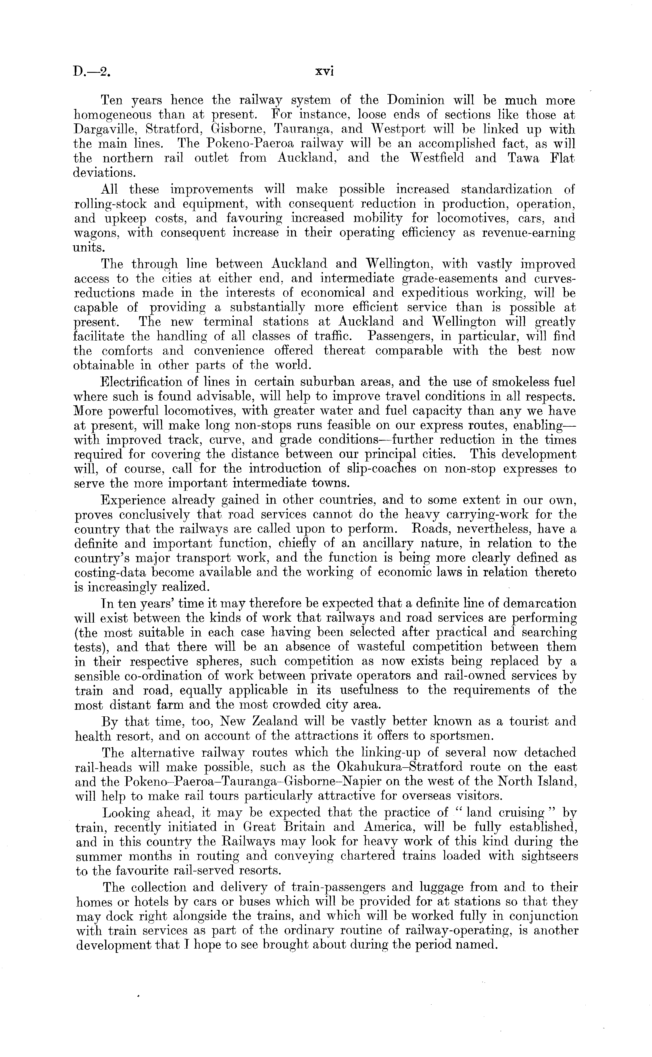 Ten years hence the railway system of the Dominion will be much more homogeneous than at present. For instance, loose ends of sections like those at Dargaville, Stratford, Gisborne, Tauranga, and Westport will be linked up with the main lines. The Pokeno-Paeroa railway will be an accomplished fact, as will the northern rail outlet from Auckland, and the Westfield and Tawa Flat deviations. All these improvements will make possible increased standardization of rolling-stock and equipment, with consequent reduction in production, operation, and upkeep costs, and favouring increased mobility for locomotives, cars, and wagons, with consequent increase in their operating efficiency as revenue-earning units. The through line between Auckland and Wellington, with vastly improved access to the cities at either end, and intermediate grade-easements and curvesreductions made in the interests of economical and expeditious working, will be capable of providing a substantially more efficient service than is possible at present. The new terminal stations at Auckland and Wellington will greatly facilitate the handling of all classes of traffic. Passengers, in particular, will find the comforts and convenience offered thereat comparable with the best now obtainable in other parts of the world. Electrification of lines in certain suburban areas, and the use of smokeless fuel where such is found advisable, will help to improve travel conditions in all respects. More powerful locomotives, with greater water and fuel capacity than any we have at present, will make long non-stops runs feasible on our express routes, enabling-— with improved track, curve, and grade conditions—further reduction in the times required for covering the distance between our principal cities. This development will, of course, call for the introduction of slip-coaches on non-stop expresses to serve the more important intermediate towns. Experience already gained in other countries, and to some extent in our own, proves conclusively that road services cannot do the heavy carrying-work for the country that, the railways are called upon to perform. Roads, nevertheless, have a definite and important function, chiefly of an ancillary nature, in relation to the country's major transport work, and the function is being more clearly defined as costing-data become available and the working of economic laws in relation thereto is increasingly realized. Tn ten years' time it may therefore be expected that a definite line of demarcation will exist between the kinds of work that railways and road services are performing (the most suitable in each case having been selected after practical and searching tests), and that there will be an absence of wasteful competition between them in their respective spheres, such competition as now exists being replaced by a sensible co-ordination of work between private operators and rail-owned services by train and road, equally applicable in its usefulness to the requirements of the most distant farm and the most crowded city area. By that time, too, New Zealand will be vastly better known as a tourist and health resort, and on account of the attractions it offers to sportsmen. The alternative railway routes which the linking-up of several now detached rail-heads will make possible, such as the Okahukura-Stratford route on the east and the Pokeno-Paeroa-Tauranga-Gisborne-Napier on the west of the North Island, will help to make rail tours particularly attractive for overseas visitors. Looking ahead, it may be expected that the practice of " land cruising " by train, recently initiated in Great Britain and America, will be fully established, and in this country the Railways may look for heavy work of this kind during the summer months in routing and conveying chartered trains loaded with sightseers to the favourite rail-served resorts. The collection and delivery of train-passengers and luggage from and to their homes or hotels by cars or buses which will be provided for at stations so that they may dock right alongside the trains, and which will be worked fully in conjunction with train services as part of the ordinary routine of railway-operating, is another development that T hope to see brought about during the period named.