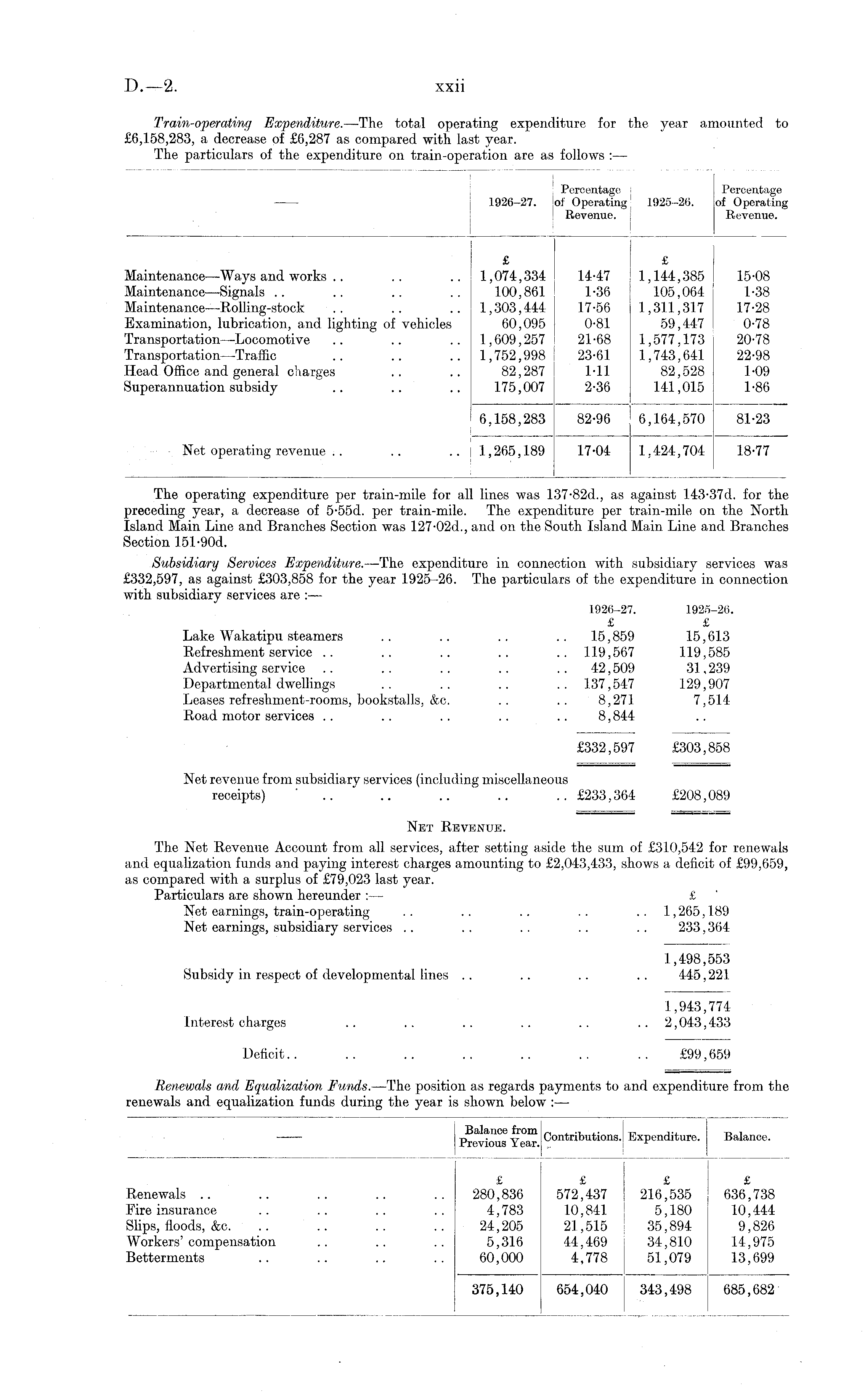 The operating expenditure per train-mile for all lines was 137-82 d., as against 143-37 d. for the preceding year, a decrease of 5-55 d. per train-mile. The expenditure per train-mile on the North Island Main Line and Branches Section was 127-02 d., and on the South Island Main Line and Branches Section 151-90 d. Subsidiary Services Expenditure.—The expenditure in connection with subsidiary services was £332,597, as against £303,858 for the year 1925-26. The particulars of the expenditure in connection with subsidiary services are : — 1926-27. 1925-26. £ £ Lake Wakatipu steamers .. .. .. .. 15,859 15,613 Refreshment service .. .. .. .. .. 119,567 119,585 Advertising service .. .. .. .. 42,509 31,239 Departmental dwellings .. .. .. .. 137,547 129,907 Leases refreshment-rooms, bookstalls, &c. .. .. 8,271 7,514 Road motor services .. .. . . .. .. 8,844 £332,597 £303,858 Net revenue from subsidiary services (including miscellaneous receipts) " .. .. .. £233,364 £208,089 Net Revenue. The Net Revenue Account from all services, after setting aside the sum of £310,542 for renewals and equalization funds and paying interest charges amounting to £2,043,433, shows a deficit of £99,659, as compared with a surplus of £79,023 last year. Particulars are shown hereunder :— £ Net earnings, train-operating .. .. .. .. .. 1,265,189 Net earnings, subsidiary services .. .. .. .. .. 233,364 1,498,553 Subsidy in respect of developmental lines .. .. .. . . 445,221 1,943,774 Interest charges .. .. .. .. .. 2,043,433 Deficit.. . . .. . . .. . . . . £99,659 Renewals and Equalization Funds.—The position as regards payments to and expenditure from the renewals and equalization funds during the year is shown below : —