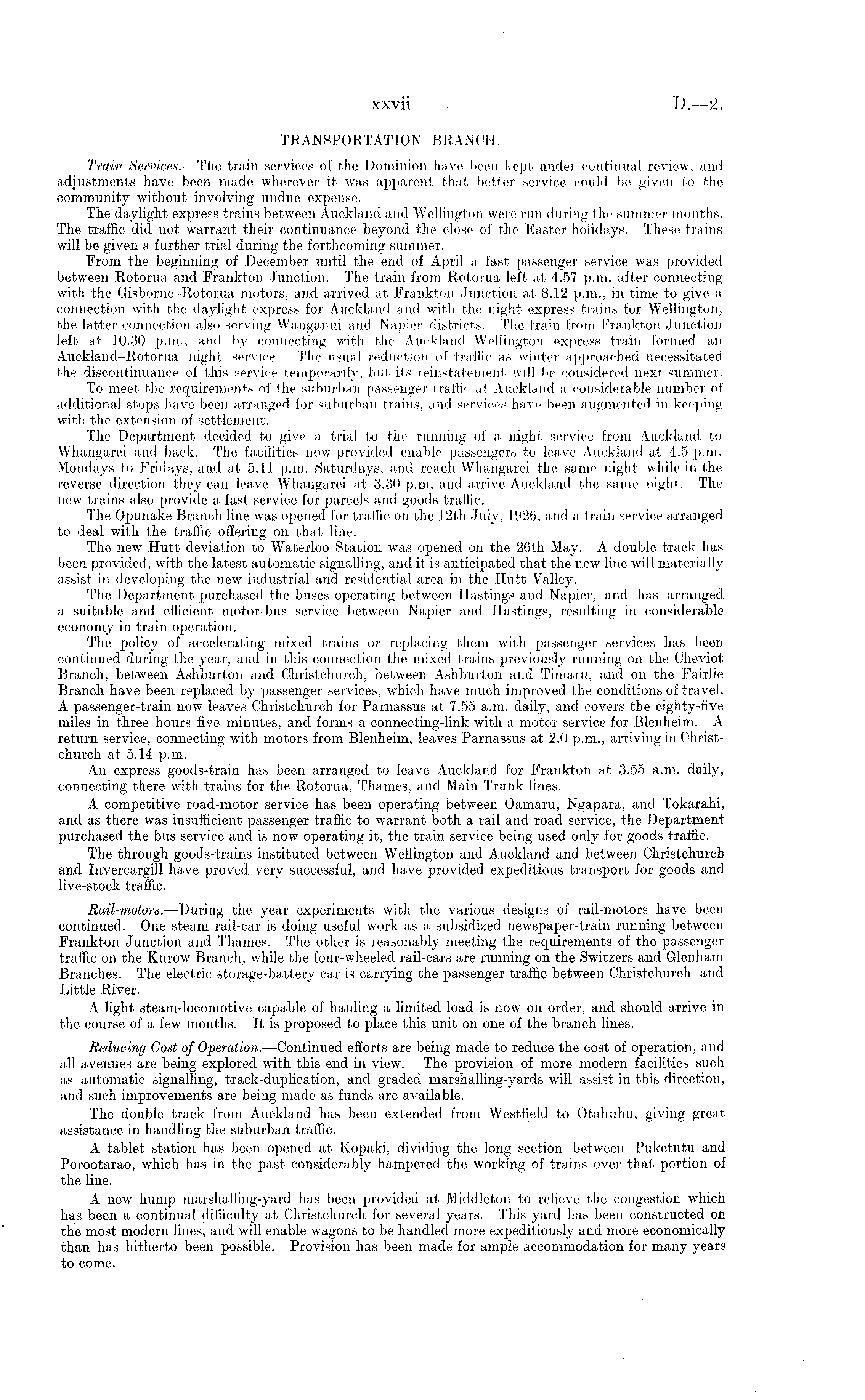 TRANSPORTATION BRANCH. Train Services.—The train services of the Dominion have been kept under continual review, and adjustments have been made wherever it was apparent that better service could be given to the community without involving undue expense. The daylight express trains between Auckland and Wellington were run during the summer months. The traffic did not warrant their continuance beyond the close of the Easter holidays. These trains will be given a further trial during the forthcoming summer. From the beginning of December until the end of April a fast passenger service was provided between Rotorua and Frankton Junction. The train from Rotorua left at 4.57 p.m. after connecting with the Gisborne-Rotorua motors, and arrived at Frankton Junction at 8.12 p.m., in time to give a connection with the daylight express for Auckland and with the night express trains for Wellington, the latter connection also serving Wanganui and Napier districts. The train from Frankton Junction left at 10.30 p.m., and by connecting with the Auckland Wellington express train formed an Auckland-Rotorua night service. The usual reduction of traffic as winter approached necessitated the discontinuance of this service temporarily, but its reinstatement will be considered next summer. To meet the requirements of the suburban passenger traffic at Auckland a considerable number of additional stops have been arranged for suburban trains, and services have been augmented in keeping with the extension of settlement. The Department decided to give a trial to the running of a night service from Auckland, to Whangarei and back. The facilities now provided enable passengers to leave Auckland at 4.5 p.m. Mondays to Fridays, and at 5.1 J p.m. Saturdays, and reach Whangarei the same night, while in the reverse direction they can leave Whangarei at 3.30 p.m. and arrive Auckland the same night. The new trains also provide a fast service for parcels and goods traffic. The Opunake Branch line was opened for traffic on the 12th July, 1926, and a train service arranged to deal with the traffic offering on that line. The new Hutt deviation to Waterloo Station was opened on the 26th May. A double track has been provided, with the latest automatic signalling, and it is anticipated that the new line will materially assist in developing the new industrial and residential area in the Hutt Valley. The Department purchased the buses operating between Hastings and Napier, and has arranged a suitable and efficient motor-bus service between Napier and Hastings, resulting in considerable economy in train operation. The policy of accelerating mixed trains or replacing them with passenger services has been continued during the year, and in this connection the mixed trains previously running on the Cheviot Branch, between Ashburton and Christchurch, between Ashburton and Timaru, and on the Fairlie Branch have been replaced by passenger services, which have much improved the conditions of travel. A passenger-train now leaves Christchurch for Parnassus at 7.55 a.m. daily, and covers the eighty-five miles in three hours five minutes, and forms a connecting-link with a motor service for Blenheim. A return service, connecting with motors from Blenheim, leaves Parnassus at 2.0 p.m., arriving in Christchurch at 5.14 p.m. An express goods-train has been arranged to leave Auckland for Frankton at 3.55 a.m. daily, connecting there with trains for the Rotorua, Thames, and Main Trunk lines. A competitive road-motor service has been operating between Oamaru, Ngapara, and Tokarahi, and as there was insufficient passenger traffic to warrant both a rail and road service, the Department purchased the bus service and is now operating it, the train service being used only for goods traffic. The through goods-trains instituted between Wellington and Auckland and between Christchurch and Invercargill have proved very successful, and have provided expeditious transport for goods and live-stock traffic. Rail-motors. —During the year experiments with the various designs of rail-motors have been continued. One steam rail-car is doing useful work as a subsidized newspaper-train running between Frankton Junction and Thames. The other is reasonably meeting the requirements of the passenger traffic on the Kurow Branch, while the four-wheeled rail-cars are running on the Switzers and Glenham Branches. The electric storage-battery car is carrying the passenger traffic between Christchurch and Little River. A light steam-locomotive capable of hauling a limited load is now on order, and should arrive in the course of a few months. It is proposed to place this unit on one of the branch lines. Reducing Cost of Operation.—Continued efforts are being made to reduce the cost of operation, and all avenues are being explored with this end in view. The provision of more modern facilities such as automatic signalling, track-duplication, and graded marshalling-yards will assist in this direction, and such improvements are being made as funds are available. The double track from Auckland has been extended from Westfield to Otahuhu, giving great assistance in handling the suburban traffic. A tablet station has been opened at Kopaki, dividing the long section between Puketutu and Porootarao, which has in the past considerably hampered the working of trains over that portion of the line. A new hump marshal! ing-yard has been provided at Middleton to relieve the congestion which has been a continual difficulty at Christchurch for several years. This yard has been constructed on the most modern lines, and will enable wagons to be handled more expeditiously and more economically than has hitherto been possible. Provision has been made for ample accommodation for many years to come.