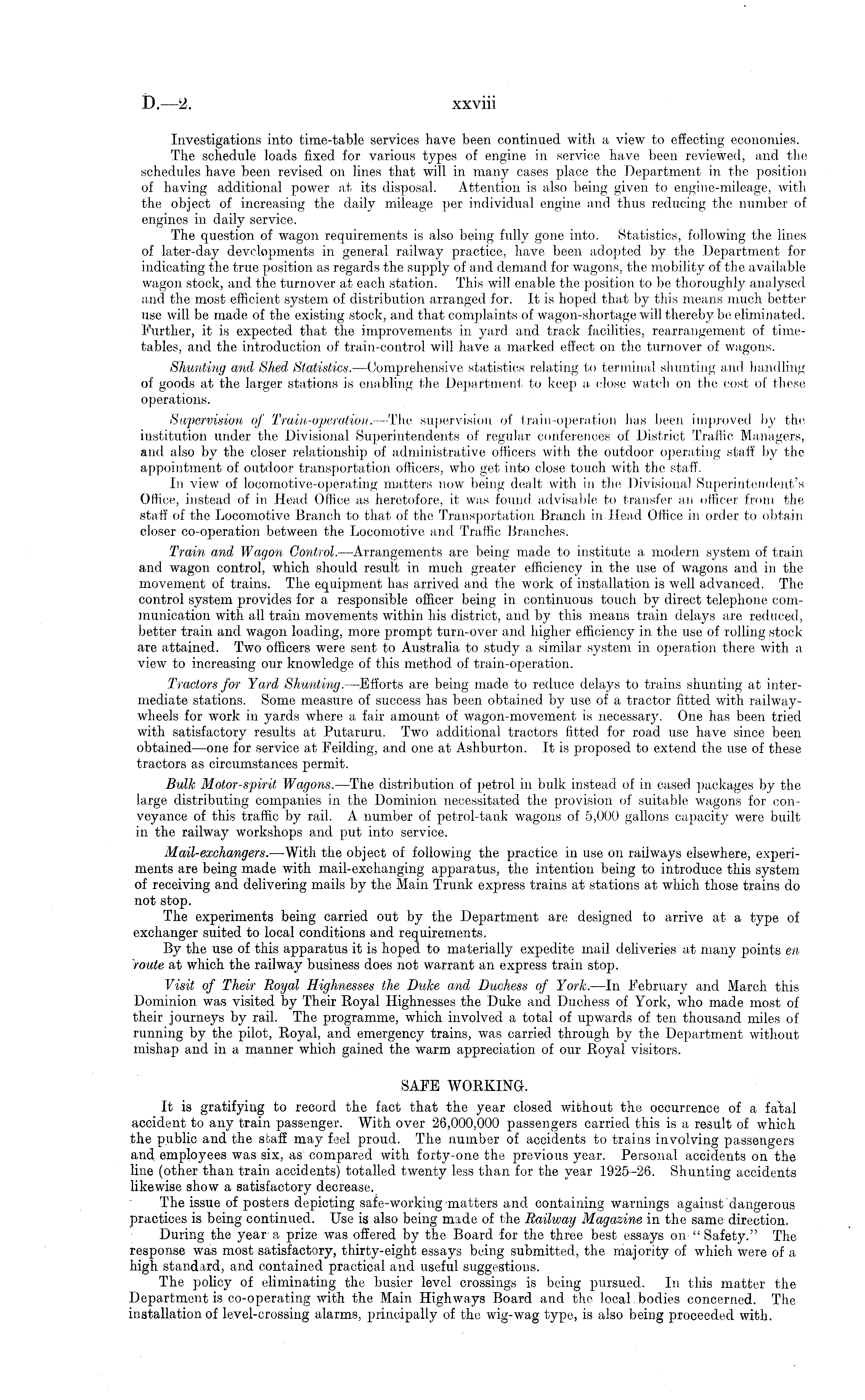 Investigations into time-table services have been continued with a view to effecting economies. The schedule loads fixed for various types of engine in service have been reviewed, and the schedules have been revised on lines that will in many cases place the Department in the position of having additional power at its disposal. Attention is also being given to engine-mileage, with the object of increasing the daily mileage per individual engine and thus reducing the number of engines in daily service. The question of wagon requirements is also being fully gone into. Statistics, following the lines of later-day developments in general railway practice, have been adopted by the Department for indicating the true position as regards the supply of and demand for wagons, the mobility of the available wagon stock, and the turnover at each station. This will enable the position to be thoroughly analysed and the most efficient system of distribution arranged for. It is hoped that by this means much better use will be made of the existing stock, and that complaints of wagon-shortage will thereby be eliminated. Further, it is expected that the improvements in yard and track facilities, rearrangement of timetables, and the introduction of train-control will have a marked effect on the turnover of wagons. Shunting and Shed Statistics. —Comprehensive statistics relating to terminal shunting and handling of goods at the larger stations is enabling the Department to keep a close watch on the cost of these operations. Supervision of Train-operation—The supervision of train-operation has been improved by the institution under the Divisional Superintendents of regular conferences of District Traffic Managers, and also by the closer relationship of administrative officers with the outdoor operating staff by the appointment of outdoor transportation officers, who get into close touch with the staff. In view of locomotive-operating matters now being dealt with in the Divisional Superintendent's Office, instead of in Head Office as heretofore, it was found advisable to transfer an officer from the staff of the Locomotive Branch to that of the Transportation Branch in Head Office in order to obtain closer co-operation between the Locomotive and Traffic Branches. Train and Wagon Control. —Arrangements are being made to institute a modern system of train and wagon control, which should result in much greater efficiency in the use of wagons and in the movement of trains. The equipment has arrived and the work of installation is well advanced. The control system provides for a responsible officer being in continuous touch by direct telephone communication with all train movements within his district, and by this means train delays are reduced, better train and wagon loading, more prompt turn-over and higher efficiency in the use of rolling stock are attained. Two officers were sent to Australia to study a similar system in operation there with a view to increasing our knowledge of this method of train-operation. Tractors for Yard Shunting.—Efforts are being made to reduce delays to trains shunting at intermediate stations. Some measure of success has been obtained by use of a tractor fitted with railwaywheels for work in yards where a fair amount of wagon-movement is necessary. One has been tried with satisfactory results at Putaruru. Two additional tractors fitted for road use have since been obtained —one for service at Feilding, and one at Ashburton. It is proposed to extend the use of these tractors as circumstances permit. Bulk Motor-spirit Wagons. —The distribution of petrol in bulk instead of in cased packages by the large distributing companies in the Dominion necessitated the provision of suitable wagons for conveyance of this traffic by rail. A number of petrol-tank wagons of 5,000 gallons capacity were built in the railway workshops and put into service. Mail-exchangers.—With the object of following the practice in use on railways elsewhere, experiments are being made with mail-exchanging apparatus, the intention being to introduce this system of receiving and delivering mails by the Main Trunk express trains at stations at which those trains do not stop. The experiments being carried out by the Department are designed to arrive at a type of exchanger suited to local conditions and requirements. By the use of this apparatus it is hoped to materially expedite mail deliveries at many points en route at which the railway business does not warrant an express train stop. Visit of Their Royal Highnesses the Duke and Duchess of York.—ln February and March this Dominion was visited by Their Royal Highnesses the Duke and Duchess of York, who made most of their journeys by rail. The programme, which involved a total of upwards of ten thousand miles of running by the pilot, Royal, and emergency trains, was carried through by the Department without mishap and in a manner which gained the warm appreciation of our Royal visitors. SAFE WORKING. It is gratifying to record the fact that the year closed without the occurrence of a fatal accident to any train passenger. With over 26,000,000 passengers carried this is a result of which the public and the staff may feel proud. The number of accidents to trains involving passengers and employees was six, as compared with forty-one the previous year. Personal accidents on the line (other than train accidents) totalled twenty less than for the year 1925-26. Shunting accidents likewise show a satisfactory decrease. The issue of posters depicting safe-working matters and containing warnings against dangerous practices is being continued. Use is also being made of the Railway Magazine in the same direction. During the year a prize was offered by the Board for the three best essays on " Safety." The response was most satisfactory, thirty-eight essays being submitted, the majority of which were of a high standard, and contained practical and useful suggestions. The 