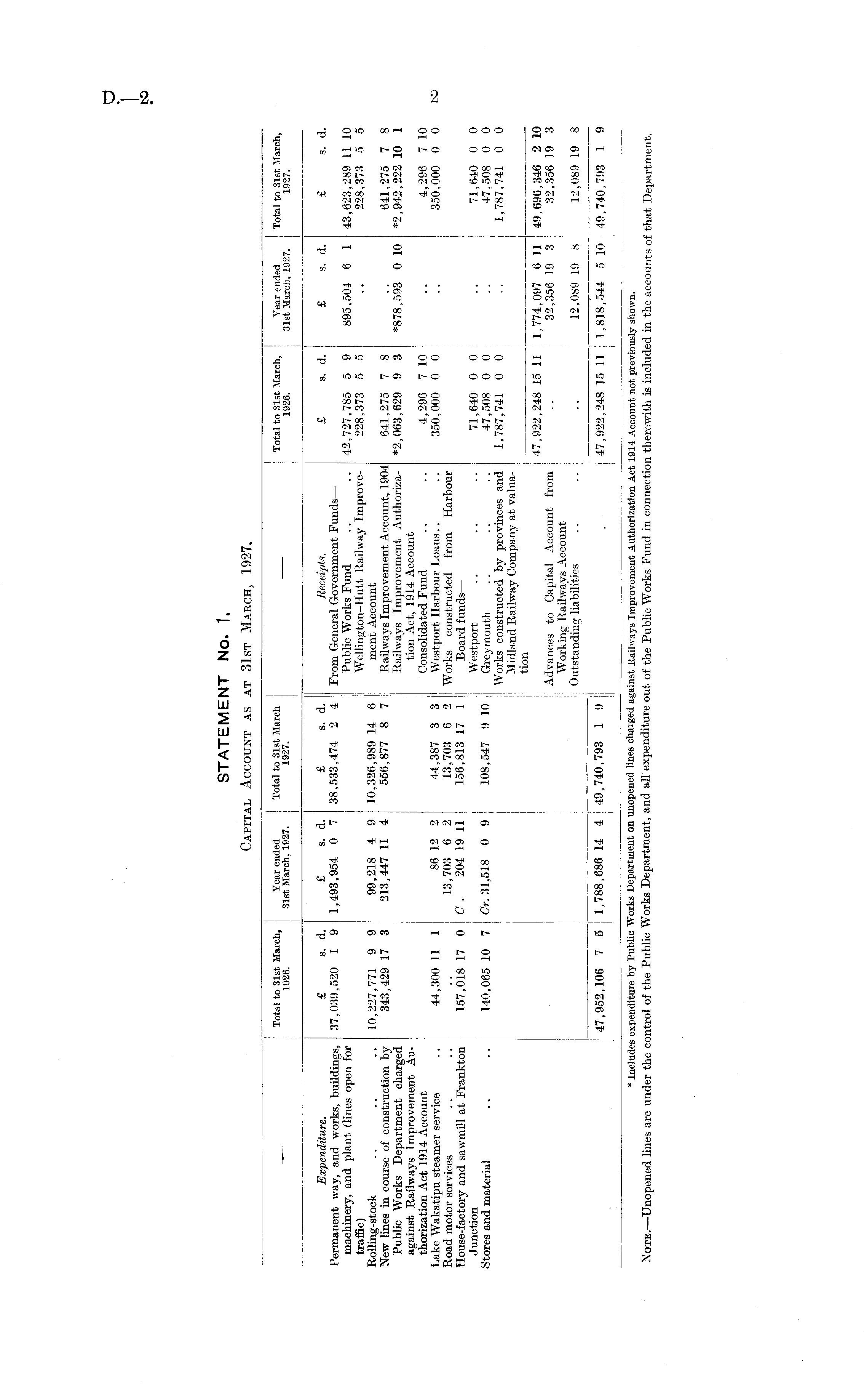 I I Total to 31st March, Year ended Total to 31st March Total to 31st March, Year ended Total to 31st March, 1926. ! 31st March, 1927. 1927. 1926. 31st March, 1927. 1927. I I I I I Expenditure. £ s. d. £ s. d. £ s. d. Receipts. £ s. d. £ s. d. £ s. d. Permanent way, and works, buildings, 37,039,520 1 9 1,493,954 0 7 38,533,474 2 4 From General Government Funds — machinery, and plant (lines open for Public Works Fund .. .. 42,727,785 5 9 895,504 6 1 43,623,289 11 10 traffic) Wellington— Hutt Railway Improve- 228,373 5 5 .. 228,373 5 5 Rolling-stock .. .. .. 10,227,771 9 9 99,218 4 9 10,326,989 14 6 ment Account New lines in course of construction by 343,429 17 3 213,447 11 4 556,877 8 7 Railways Improvement Account, 1904 641,275 7 8 .. 641,275 7 8 Public Works Department charged Railways Improvement Authoriza- *2,063,629 9 3 *878,593 0 10 *2,942,222 10 1 against Railways Improvement Au- tion Act, 1914 Account thorization Act 1914 Account Consolidated Fund .. .. 4,296 7 10 .. 4,296 7 10 Lake Wakatipu steamer service .. 44,300 11 1 86 12 2 44,387 3 3 Westport Harbour Loans.. .. 350,000 0 0 .. 350,000 0 0 Road motor services .. .. .. 13,703 6 2 13,703 6 2 Works constructed from Harbour House-factory and sawmill at Frankton 157,018 17 0 C . 204 19 11 156,813 17 1 Board funds — Junction j Westport .. .. .. 71,640 0 0 .. 71,640 0 0 Stores and material .. .. 140,065 10 7 Or. 31,518 0 9 108,547 9 10 Greymouth .. .. .. 47,508 0 0 .. 47,508 0 0 Works constructed by provinces and 1,787,741 0 0 .. 1,787,741 0 0 Midland Railway Company at valuation 47,922,248 15 11 1,774,097 6 11 49,696,346 2 10 Advances to Capital Account from .. 32,356 19 3 j 32,356 19 3 Working Railways Account Outstanding liabilities .. .. .. 12,089 19 8 12,089 19 8 47,952,106 7 5 1,788,686 14 4 49,740,793 1 9 47,922,248 15 11 1,818,544 5 10 49,740,793 1 9 I I * Includes expenditure by Public Works Department on unopened lines charged against Railways Improvement Authorization Act 1914 Account not previously shown. Note. —Unopened lines are under the control of the Public Works Department, and all expenditure out of the Public Works Fund in connection therewith is included in the accounts of that Department.