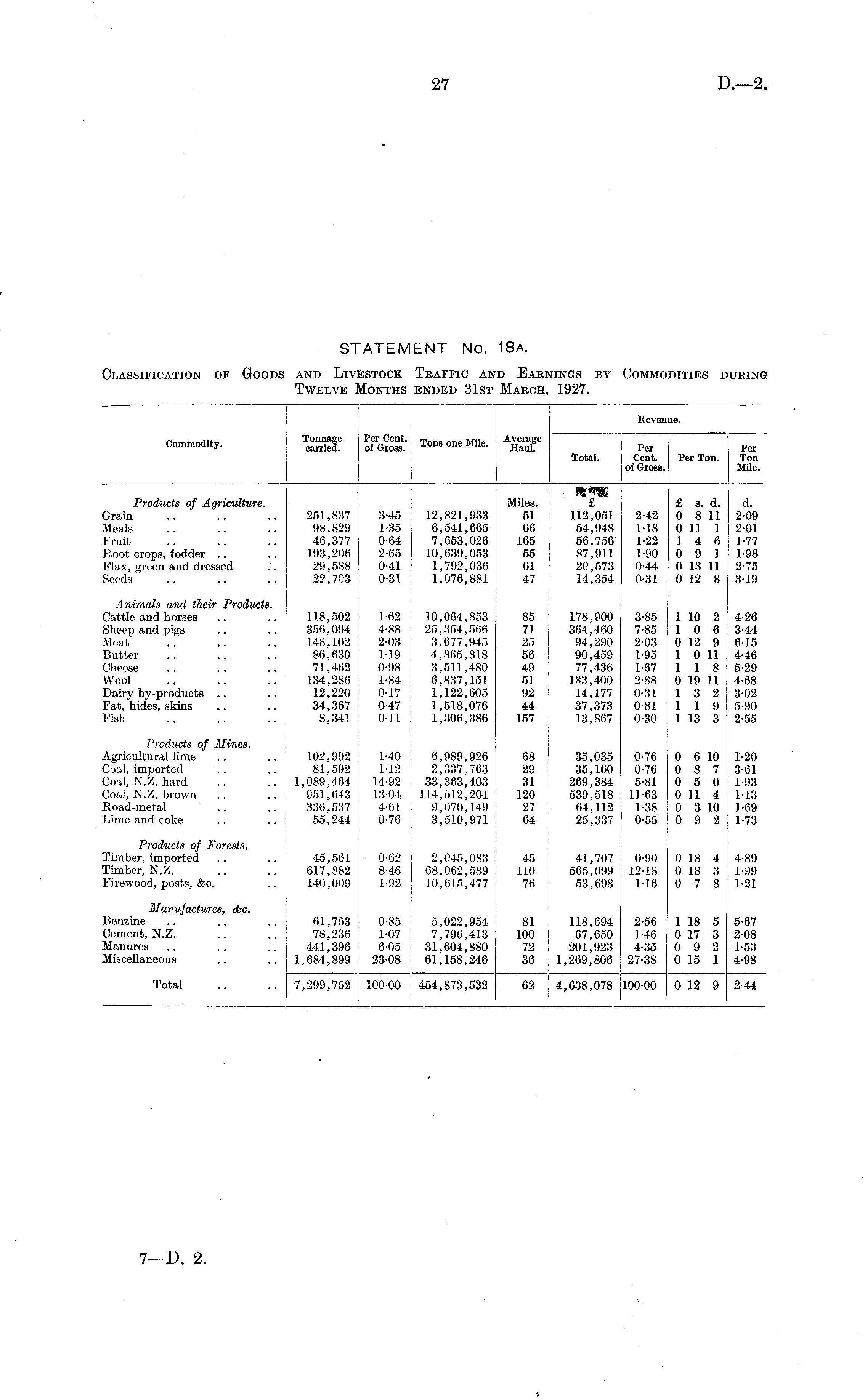Revenue. fWrnnriifv Tonnage Per Cent. T n _„ Mil Average 1 ~ Commodity. carried. of Gross. 10ns one Mlle ' Haul. Per Per Total. | Cent. Per Ton. Ton I of Gross. Mile. I I : mm Products of Agriculture. Miles. £ £ s. d. d. Grain .. .. .. 251,837 3-45 12,821,933 51 112,051 2-42 0 8 11 2-09 Meals .. .. .. 98,829 1-35 6,541,665 66 54,948 1-18 0 11 1 2-01 Fruit .. .. .. 46,377 0-64 7,653,026 165 56,756 1-22 1 4 6 1-77 Boot crops, fodder .. .. 193,206 2-65 10,639,053 55 87,911 1-90 0 9 1 1-98 FJax, green and dressed 29,588 0-41 1,792,036 61 20,573 0-44 0 13 11 2-75 Seeds .. .. .. 22,703 0-31 1,076,881 47 14,354 0-31 0 12 8 3-19 Animals and their Products. Cattle and horses .. .. 118,502 1-62 10,064,853 85 178,900 3-85 1 10 2 4-26 Sheep and pigs .. .. 356,094 4-88 25,354,566 71 364,460 7-85 1 0 6 3-44 Meat .. .. .. 148,102 2-03 3,677,945 25 94,290 2-03 0 12 9 6-15 Butter .. .. .. 86,630 1-19 4,865,818 56 90,459 1-95 1 0 11 4-46 Cheese .. .. .. 71,462 0-98 3,511,480 49 77,436 1-67 1 1 8 5-29 Wool .. .. .. 134,286 1-84 6,837,151 51 133,400 2-88 0 19 11 4-68 Dairy by-produets .. .. 12,220 0-17 1,122,605 92 14,177 0-31 1 3 2 3-02 Fat, hides, skins .. .. 34,367 0-47 1,518,076 44 37,373 0-81 1 1 9 5-90 Fish .. .. .. 8,341 0-11 1,306,386 157 13,867 0-30 1 13 3 2-55 Products of Mines, Agricultural lime .. .. 102,992 1-40 6,989,926 68 35,035 0-76 0 6 10 1-20 Coal, imported .. .. 81,592 1 12 2,337.763 29 35,160 0-76 0 8 7 3-61 Coal, N.Z. hard .. .. 1,089,464 14-92 33,363,403 31 ! 269,384 5-81 0 5 0 1-93 Coal, N.Z. brown .. .. 951,643 13-04 114,512,204 120 539,518 11-63 0 11 4 1-13 Road-metal .. .. 336,537 4-61 9,070,149 27 j 64,112 1-38 0 3 10 1-69 Lime and coke .. .. 55,244 0-76 3,510,971 64 : 25,337 0-55 0 9 2 1-73 Products of Forests. Timber, imported .. .. 45,561 0-62 2,045,083 45 41,707 0-90 0 18 4 4-89 Timber, N.Z. .. .. 617,882 8-46 68,062,589 110 565,099 12-18 0 18 3 1-99 Firewood, posts, &o. .. 140,009 1-92 10,615,477 76 53,698 1-16 0 7 8 1-21 Manufactures, &c. Benzine .. .. .. 61,753 0-85 5,022,954 81 118,694 2-56 1 18 5 5-67 Cement, N.Z. .. .. 78,236 1-07 7,796,413 100 67,650 1-46 0 17 3 2-08 Manures .. .. .. 441,396 6-05 31,604,880 72 201,923 4-35 0 9 2 1-53 Miscellaneous .. .. 1,684,899 23-08 61,158,246 36 1,269,806 27-38 0 15 1 4-98 Total .. .. 7,299,752 100 00 454,873,532 62 4,638,078 100-00 0 12 9 2-44