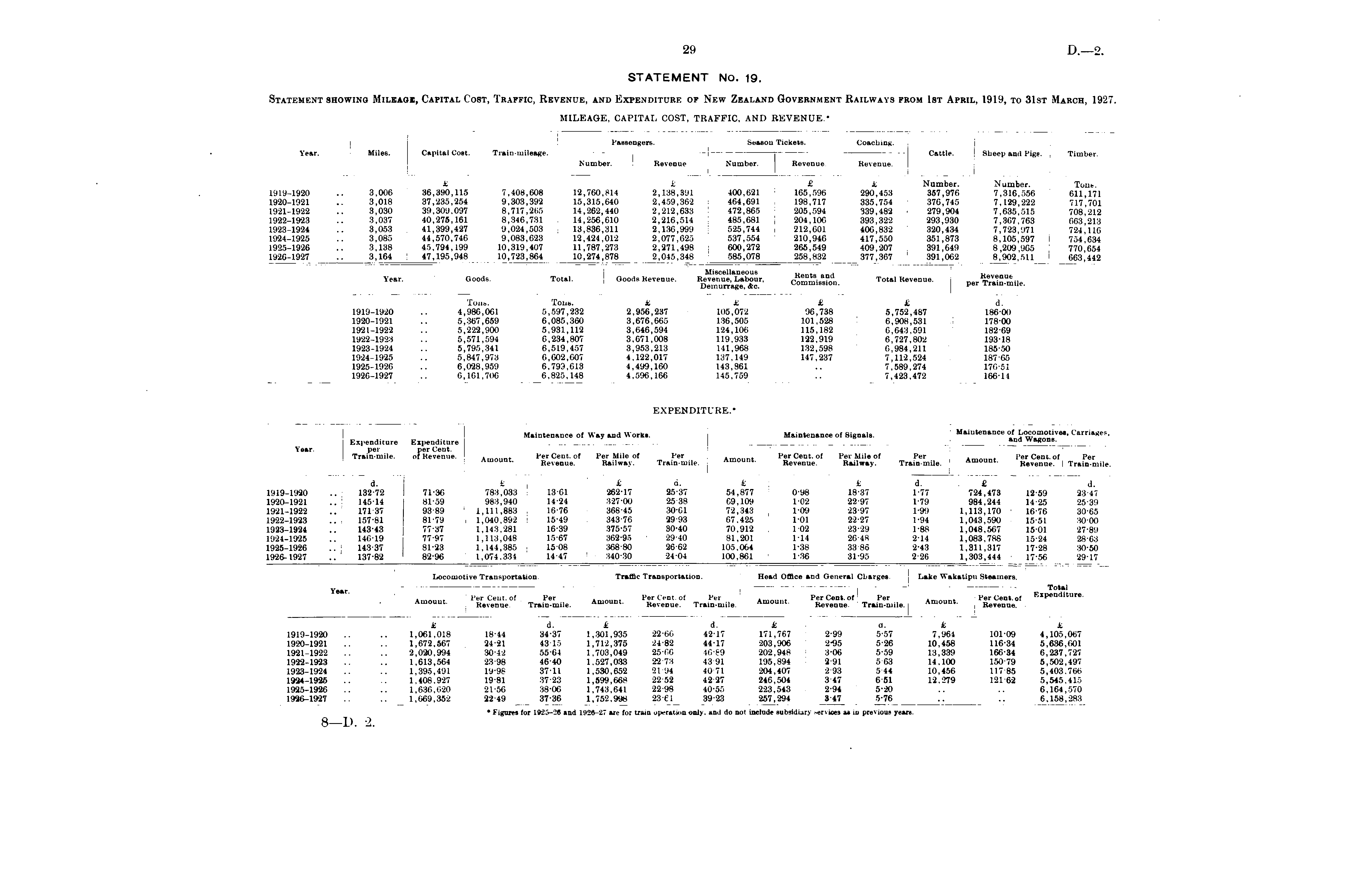 STATEMENT No. 19. Statement showing Mileage, Capital Cost, Traffic, Revenue, and Expenditure of New Zealand Government Railways from 1st April, 1919, to 31st March, 1927. MILEAGE, CAPITAL COST, TRAFFIC, AND REVENUE.*