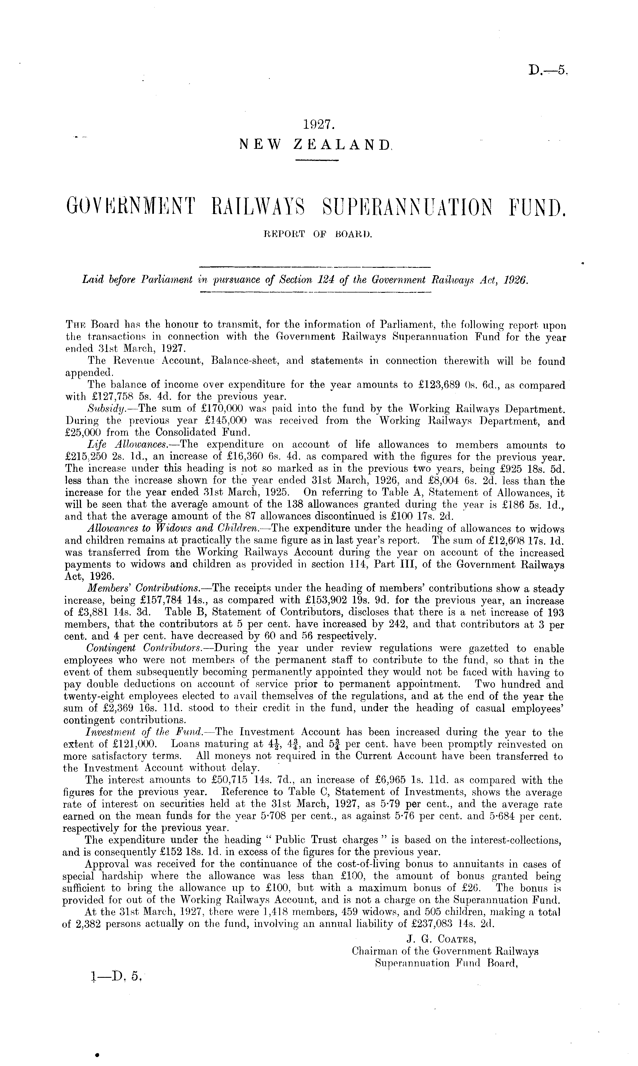 The Board has the honour to transmit, for the information of Parliament, the following report upon the transactions in connection with the Government Railways Superannuation Fund for the year ended 31st March, 1927. The Revenue Account, Balance-sheet, and statements in connection therewith will be found appended. The balance of income over expenditure for the year amounts to £123,689 Os. 6d., as compared with £127,758 ss. 4d. for the previous year. Subsidy. —The sum of £170,000 was paid into the fund by the Working Railways Department. During the previous year £145,000 was received from the Working Railways Department, and £25,000 from the Consolidated Fund. Life Allowances. —The expenditure on account of life allowances to members amounts to £215,250 2s. Id., an increase of £16,360 6s. 4d. as compared with the figures for the previous year. The increase under this heading is not so marked as in the previous two years, being £925 18s. sd. less than the increase shown for the year ended 31st March, 1926, and £8,004 6s. 2d. less than the increase for the year ended 31st March, 1925. On referring to Table A, Statement of Allowances, it will be seen that the average amount of the 138 allowances granted during the year is £186 ss. Id., and that the average amount of the 87 allowances discontinued is £100 17s. 2d. Allowances to Widows and Children. —The expenditure under the heading of allowances to widows and children remains at practically the same figure as in last year's report. The sum of £12,608 17s. Id. was transferred from the Working Railways Account during the year on account of the increased payments to widows and children as provided in section 114, Part 111, of the Government Railways Act, 1926. Members' Contributions. —The receipts under the heading of members' contributions show a steady increase, being £157,784 145., as compared with £153,902 19s. 9d. for the previous year, an increase of £3,881 14s. 3d. Table B, Statement of Contributors, discloses that there is a net increase of 193 members, that the contributors at 5 per cent, have increased by 242, and that contributors at 3 per cent, and 4 per cent, have decreased by 60 and 56 respectively. Contingent Contributors. —During the year under review regulations were gazetted to enable employees who were not members of the permanent staff to contribute to the fund, so that in the event of them subsequently becoming permanently appointed they would not be faced with having to pay double deductions on account of service prior to permanent appointment. Two hundred and twenty-eight employees elected to avail themselves of the regulations, and at the end of the year the sum of £2,369 16s. lid. stood to their credit in the fund, under the heading of casual employees' contingent contributions. Investment of the Fund. —The Investment Account has been increased during the year to the extent of £121,000. Loans maturing at 4f, 4f, and 5f per cent, have been promptly reinvested on more satisfactory terms. All moneys not required in the Current Account have been transferred to the Investment Account without delay. The interest amounts to £50,715 14s. 7d., an increase of £6,965 Is. lid. as compared with the figures for the previous year. Reference to Table C, Statement of Investments, shows the average rate of interest on securities held at the 31st March, 1927, as 5-79 per cent., and the average rate earned on the mean funds for the year 5-708 per cent., as against 5-76 per cent, and 5-684 per cent, respectively for the previous year. The expenditure under the heading " Public Trust charges " is based on the interest-collections, and is consequently £152 18s. Id. in excess of the figures for the previous year. Approval was received for the continuance of the cost-of-living bonus to annuitants in cases of special hardship where the allowance was less than £100, the amount of bonus granted being sufficient to bring the allowance up to £100, but with a maximum bonus of £26. The bonus is provided for out of the Working Railways Account, and is not a charge on the Superannuation Fund. At the 31st March, 1927, there were 1,418 members, 459 widows, and 505 children, making a total of 2,382 persons actually on the fund, involving an annual liability of £237,083 14s. 2d. J. G. Coaths, Chairman of the Government Railways Superannuation Fund Board,