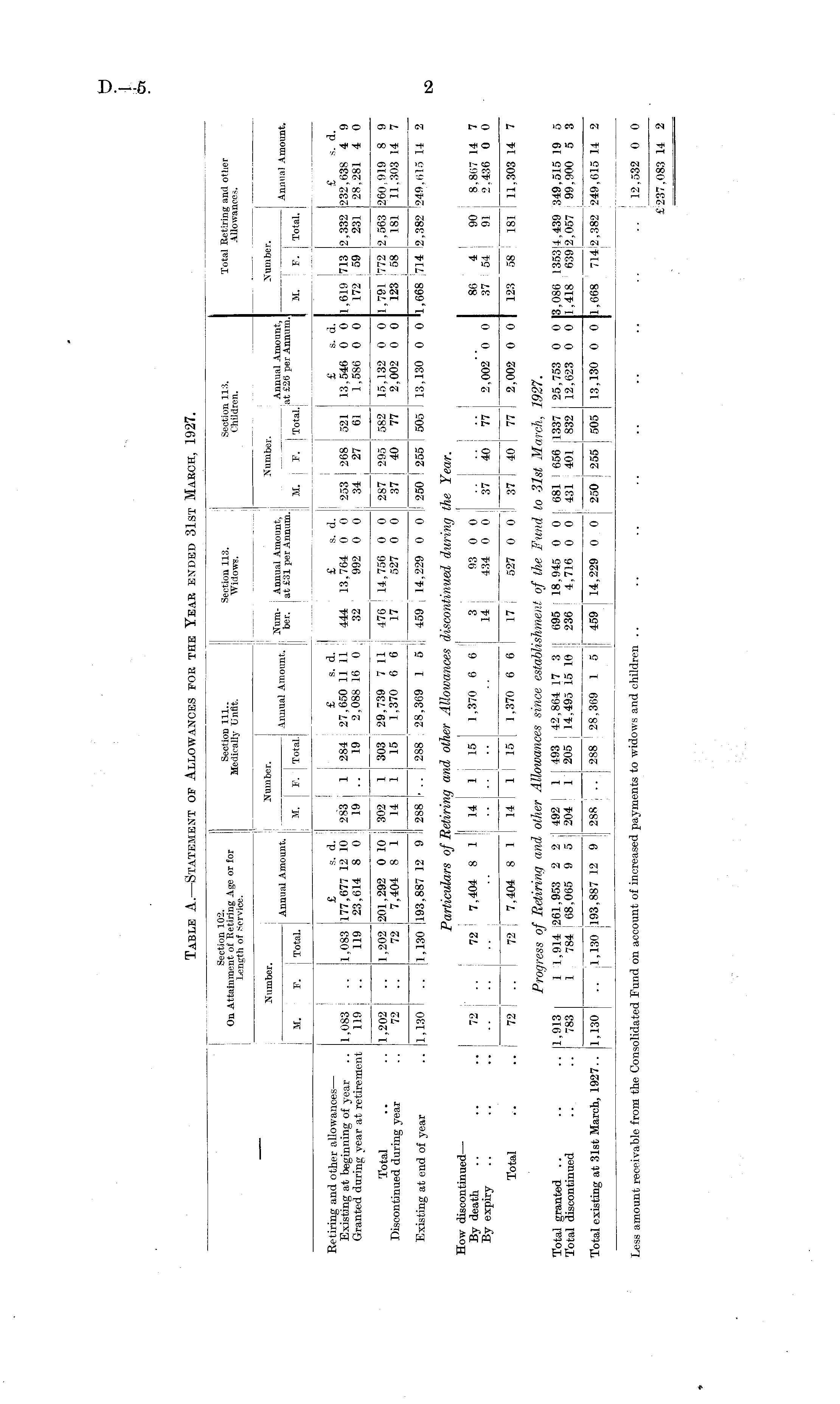 A+4 . . _ Seetion l02. Section 111.. Section 113. Section 113. Total Retiring and other On Attainment of Retiring Age or for Medically Unfit. Widow?. Children. Allowances. Length of service. J Number. I Number. Number. Number* 1 Annual Amount. Annua. Amount. j ~ Annua. Amount. M. F. ! Total. M. F. Total. I M. F. Total.; M. F. Total. Retiring and other allowances — £ s. d. £ s. d. £ s. d. £ s. d. £ s. d. Existing at beginning of year .. 1,083 .. 1,083 177,677 12 10 283 1 284 27.650 11 11 444 13,764 0 0 253 268 521 13,546 0 0 1,619 713 2,332 232,638 4 9 Granted during year at retirement 119 .. 119 23,614 8 0 19 .. 19 2,088 16 0 32 992 0 0 34 27 61 1,586 0 0 172 59 231 28,281 4 0 Total .. .. 1,202 .. 1,202 201,292 0 10 302 1 303 29,739 7 11 476 14,756 0 0 287 295 582 15,132 0 0 1,791 772 2,563 260.919 8 9 Discontinued during year .. 72 .. 72 7,404 8 1 14 1 15 1,370 6 6 17 527 0 0 37 40 77 2,002 0 0 123 58 181 11.303 14 7 Existing at end of year .. 1,130 .. 1,130 193,887 12 9 288 •.. 288 28,369 1 5 459 14,229 0 0 250 255 505 13,130 0 0 'l,668 714 2,382 249.615 14 2 Particulars of Retiring and other Allowances discontinued during the Year. How discontinued —• By death .. .. .. 72 72 7,404 8 1 14 1 15 1,370 6 6 3 93 0 0 .. 86 4 90 8.867 14 7 By expiry .. .. j .. •• j 14 434 0 0 j 37 40 77 2,002 0 0 37 54 91 2,436 0 0 Total .. 72 i 72 j 7,404 8 1 14 1 15 1,370 6 6 17 527 0 0 : 37 40 77 2,002 0 0 123 58 > 181 11,303 14 7 Progress of Retiring and other Allowances since establishment of the Fund to 31st March, 1927. Total granted .. .. .. 1,913 1 1,914 261,953 2 2 492 i 1 493 i 42,864 17 3 695 18,945 0 0 681 656 1337 25,753 0 0 3,086 13534,439 349,515 19 5 Total discontinued .. .. 783 1 784 68,065 9 5 204 1 205 14,495 15 10 236 4,716 0 0 431 401 832 12,623 0 0 1,418 639 2,057 99.900 5 3 Total existing at 31st March, 1927.. 1,130 .. 1,130 193,887 12 9 288 .. 288 28,369 1 5 459 14,229 0 0 250 255 505 13,130 0 0 1,668 714|2, 382 249,615 14 2 1 ! 1 ' ' ; ' 1: ) 1 [ Less amount receivable from the Consolidated Fund on account of increased payments to widows and children .. .. .. .. .. .. .. .. .. 12,532 0 0 £1237,083 14 2