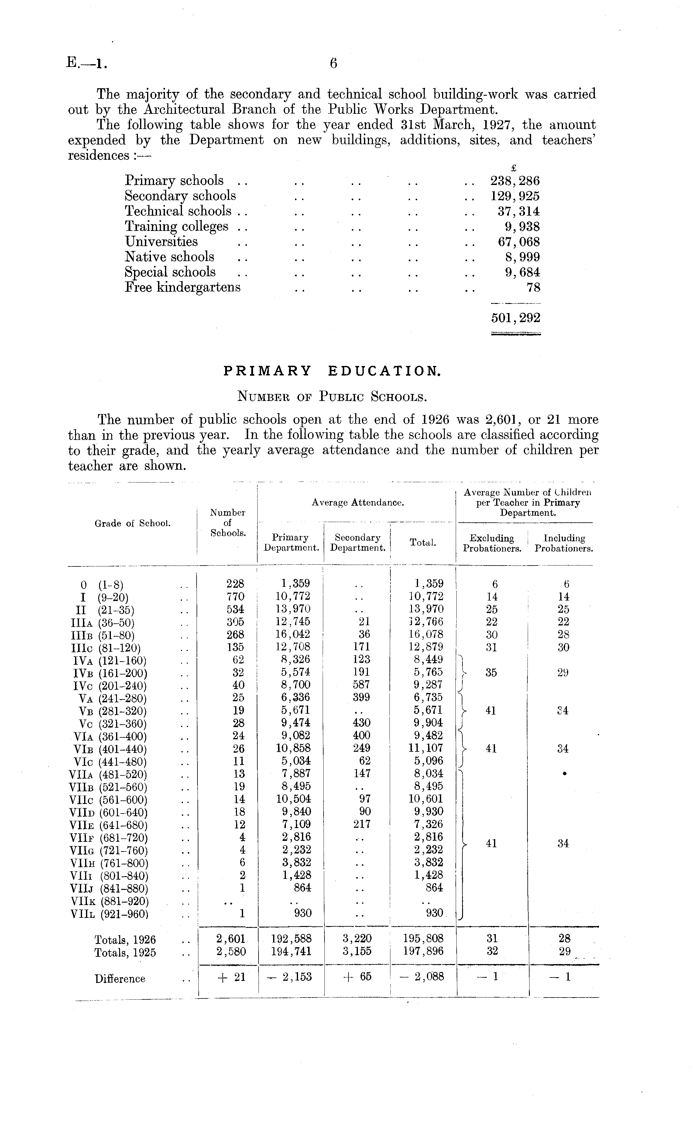 The majority of the secondary and technical school building-work was carried out by the Architectural Branch of the Public Works Department. The following table shows for the year ended 31st March, 1927, the amount expended by the Department on new buildings, additions, sites, and teachers' residences : — £ Primary schools .. .. .. .. .. 238,286 Secondary schools .. .. .. .. 129,925 Technical schools . . .. .. .. .. 37,314 Training colleges .. .. .. .. .. 9,938 Universities .. .. .. .. .. 67,068 Native schools .. .. .. .. .. 8,999 Special schools .. .. .. .. .. 9,684 Free kindergartens .. .. . . . . 78 501,292 PRIMARY EDUCATION. Number of Public Schools. The number of public schools open at the end of 1926 was 2,601, or 21 more than in the previous year. In the following table the schools are classified according to their grade, and the yearly average attendance and the number of children per teacher are shown.