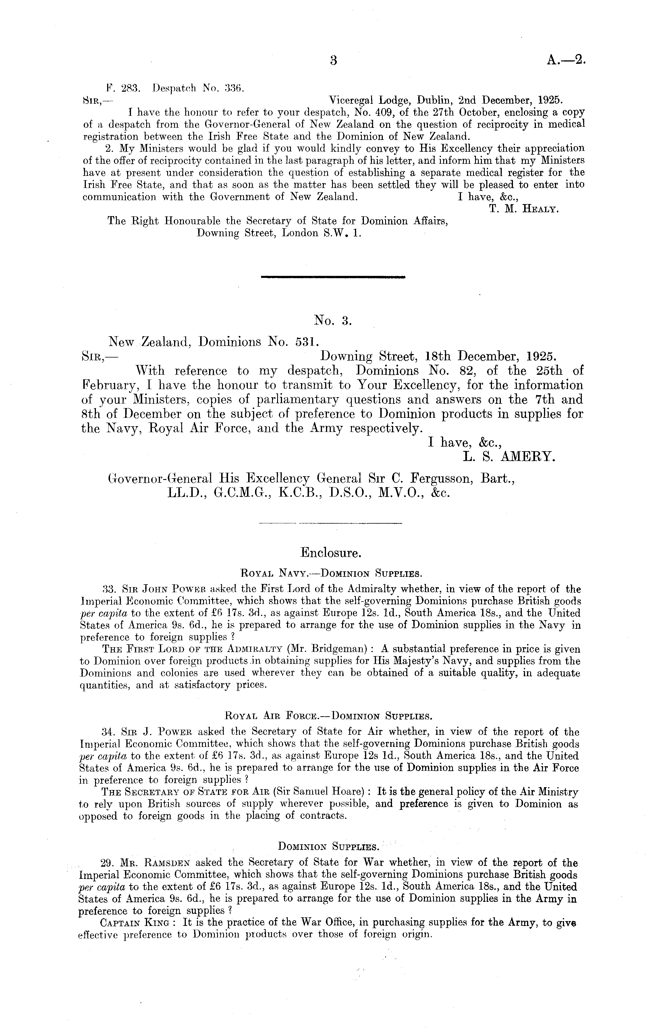 No. 3. New Zealand, Dominions No. 531. Sir, — Downing Street, 18th December, 1925. With reference to my despatch, Dominions No. 82, of the 25th of February, I have the honour to transmit to Your Excellency, for the information of your Ministers, copies of parliamentary questions and answers on the 7th and Bth of December on the subject of preference to Dominion products in supplies for the Navy, Royal Air Force, and the Army respectively. I have, &c., L. S. AMERY. Governor-General His Excellency General Sir C. Fergusson, Bart., LL.D., G.C.M.G., K.C.8., D.5.0., M.Y.0., &c.