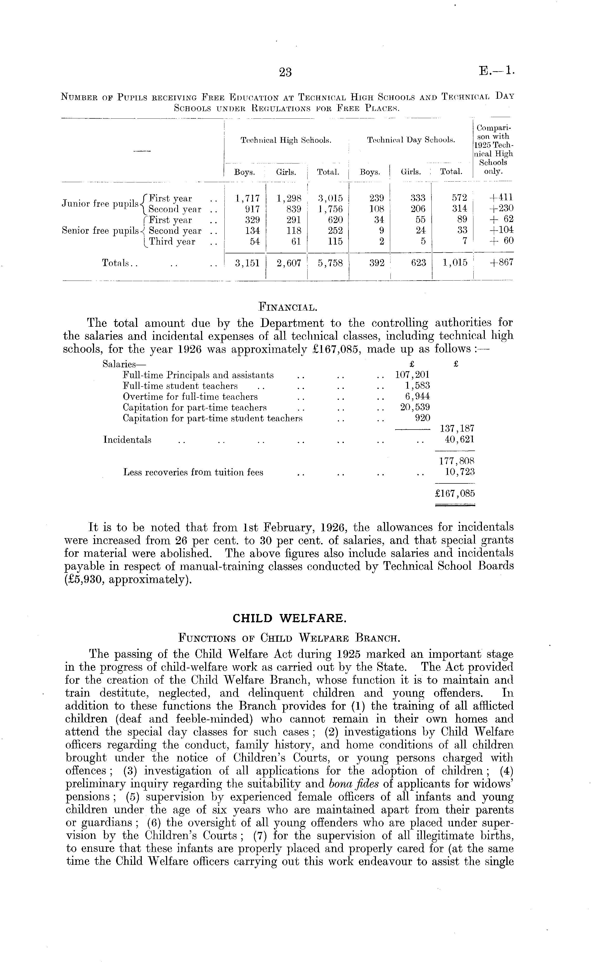 Financial. The total amount due by the Department to the controlling authorities for the salaries and incidental expenses of all technical classes, including technical high schools, for the year 1926 was approximately £167,085, made up as follows : — Salaries— £ £ Full-time Principals and assistants .. .. .. 107,201 Full-time student teachers .. .. .. .. 1,583 Overtime for full-time teachers .. .. .. 6,944 Capitation for part-time teachers .. .. .. 20,539 Capitation for part-time student teachers .. .. 920 137,187 Incidentals .. .. .. .. .. .. .. 40,621 177,808 Less recoveries from tuition fees .. .. .. .. 10,723 £167,085 It is to be noted that from Ist February, 1926, the allowances for incidentals were increased from 26 per cent, to 30 per cent, of salaries, and that special grants for material were abolished. The above figures also include salaries and incidentals payable in respect of manual-training classes conducted by Technical School Boards (£5,930, approximately). CHILD WELFARE. Functions of Child Welfare Branch. The passing of the Child Welfare Act during 1925 marked an important stage in the progress of child-welfare work as carried out by the State. The Act provided for the creation of the Child Welfare Branch, whose function it is to maintain and train destitute, neglected, and delinquent children and young offenders. In addition to these functions the Branch provides for (1) the training of all afflicted children (deaf and feeble-minded) who cannot remain in their own homes and attend the special day classes for such cases ; (2) investigations by Child Welfare officers regarding the conduct, family history, and home conditions of all children brought under the notice of Children's Courts, or young persons charged with offences ; (3) investigation of all applications for the adoption of children ; (4) preliminary inquiry regarding the suitability and bona fides of applicants for widows' pensions ; (5) supervision by experienced female officers of all infants and young children under the age of six years who are maintained apart from their parents or guardians ; (6) the oversight of all young offenders who are placed under supervision by the Children's Courts ; (7) for the supervision of all illegitimate births, to ensure that these infants are properly placed and properly cared for (at the same time the Child Welfare officers carrying out this work endeavour to assist the single
