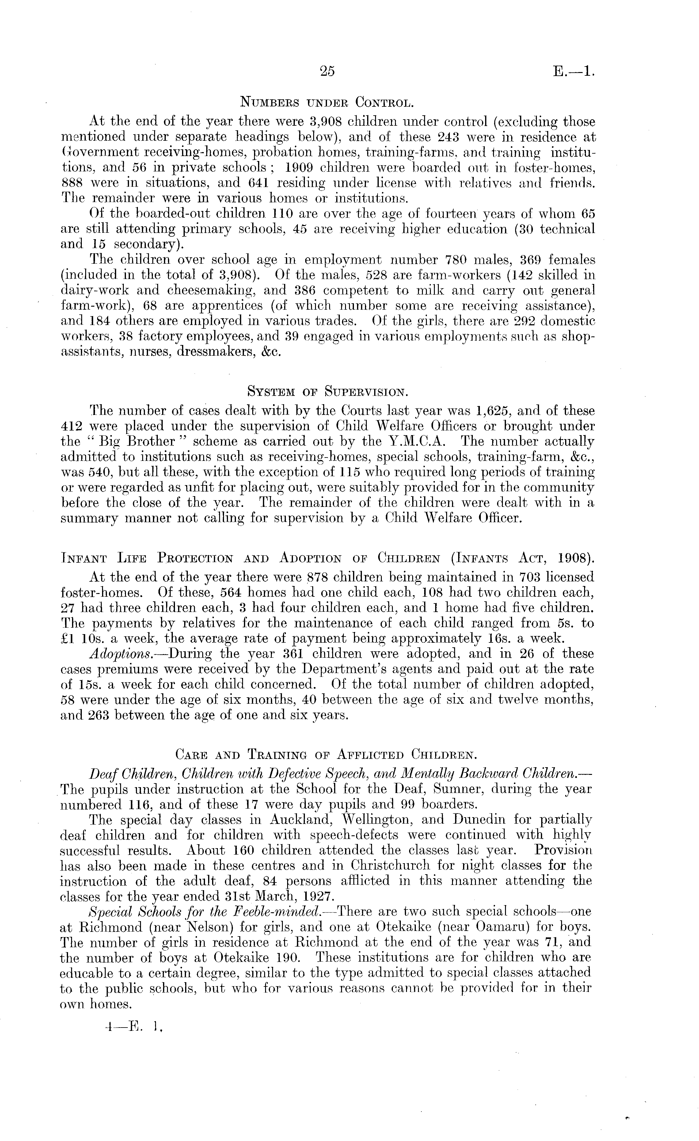 Numbers under Control. At the end of the year there were 3,908 children under control (excluding those mentioned under separate headings below), and of these 243 were in residence at Government receiving-homes, probation homes, training-farms, and training institutions, and 56 in private schools ; 1909 children were boarded out in foster-homes, 888 were in situations, and 641 residing under license with relatives and friends. The remainder were in various homes or institutions. Of the boarded-out children 110 are over the age of fourteen years of whom 65 are still attending primary schools, 45 are receiving higher education (30 technical and 15 secondary). The children over school age in employment number 780 males, 369 females (included in the total of 3,908). Of the males, 528 are farm-workers (142 skilled in dairy-work and cheesemaking, and 386 competent to milk and carry out general farm-work), 68 are apprentices (of which number some are receiving assistance), and 184 others are employed in various trades. Of the girls, there are 292 domestic workers, 38 factory employees, and 39 engaged in various employments such as shopassistants, nurses, dressmakers, &c. System of Supervision. The number of cases dealt with by the Courts last year was 1,625, and of these 412 were placed under the supervision of Child Welfare Officers or brought under the " Big Brother " scheme as carried out by the Y.M.C.A. The number actually admitted to institutions such as receiving-homes, special schools, training-farm, &c., was 540, but all these, with the exception of 115 who required long periods of training or were regarded as unfit for placing out, were suitably provided for in the community before the close of the year. The remainder of the children were dealt, with in a summary manner not calling for supervision by a Child Welfare Officer. Infant Life Protection and Adoption of Children (Infants Act, 1908). At the end of the year there were 878 children being maintained in 703 licensed foster-homes. Of these, 564 homes had one child each, 108 had two children each, 27 had three children each, 3 had four children each, and 1 home had five children. The payments by relatives for the maintenance of each child ranged from ss. to £l 10s. a week, the average rate of payment being approximately 16s. a week. Adoptions. —During the year 361 children were adopted, and in 26 of these cases premiums were received by the Department's agents and paid out at the rate of 15s. a week for each child concerned. Of the total number of children adopted, 58 were under the age of six months, 40 between the age of six and twelve months, and 263 between the age of one and six years. Care and Training of Afflicted Children. Deaf Children, Children with, Defective S-peech, and Mentally Backward Children. — The pupils under instruction at the School for the Deaf, Sumner, during the year numbered 116, and of these 17 were day pupils and 99 boarders. The special day classes in Auckland, Wellington, and Dunedin for partially deaf children and for children with speech-defects were continued with highly successful results. About 160 children attended the classes last year. Provision has also been made in these centres and in Christchurch for night classes for the instruction of the adult deaf, 84 persons afflicted in this manner attending the classes for the year ended 31st March, 1927. Special Schools for the Feeble-minded. —There are two such special schools —one at Richmond (near Nelson) for girls, and one at Otekaike (near Oamaru) for boys. The number of girls in residence at Richmond at the end of the year was 71, and the number of boys at Otekaike 190. These institutions are for children who are educable to a certain degree, similar to the type admitted to special classes attached to the public schools, but who for various reasons cannot be provided for in their own homes.