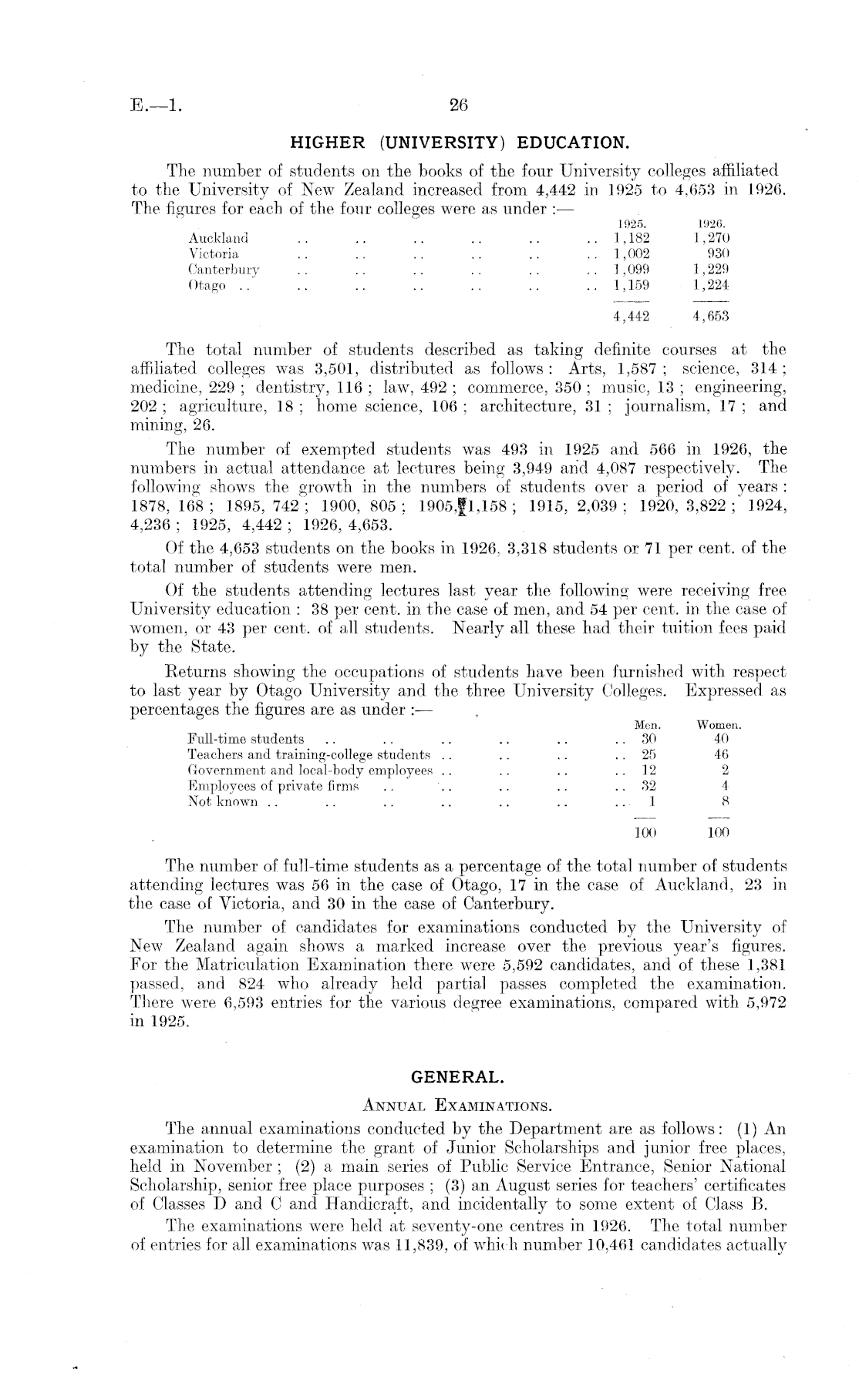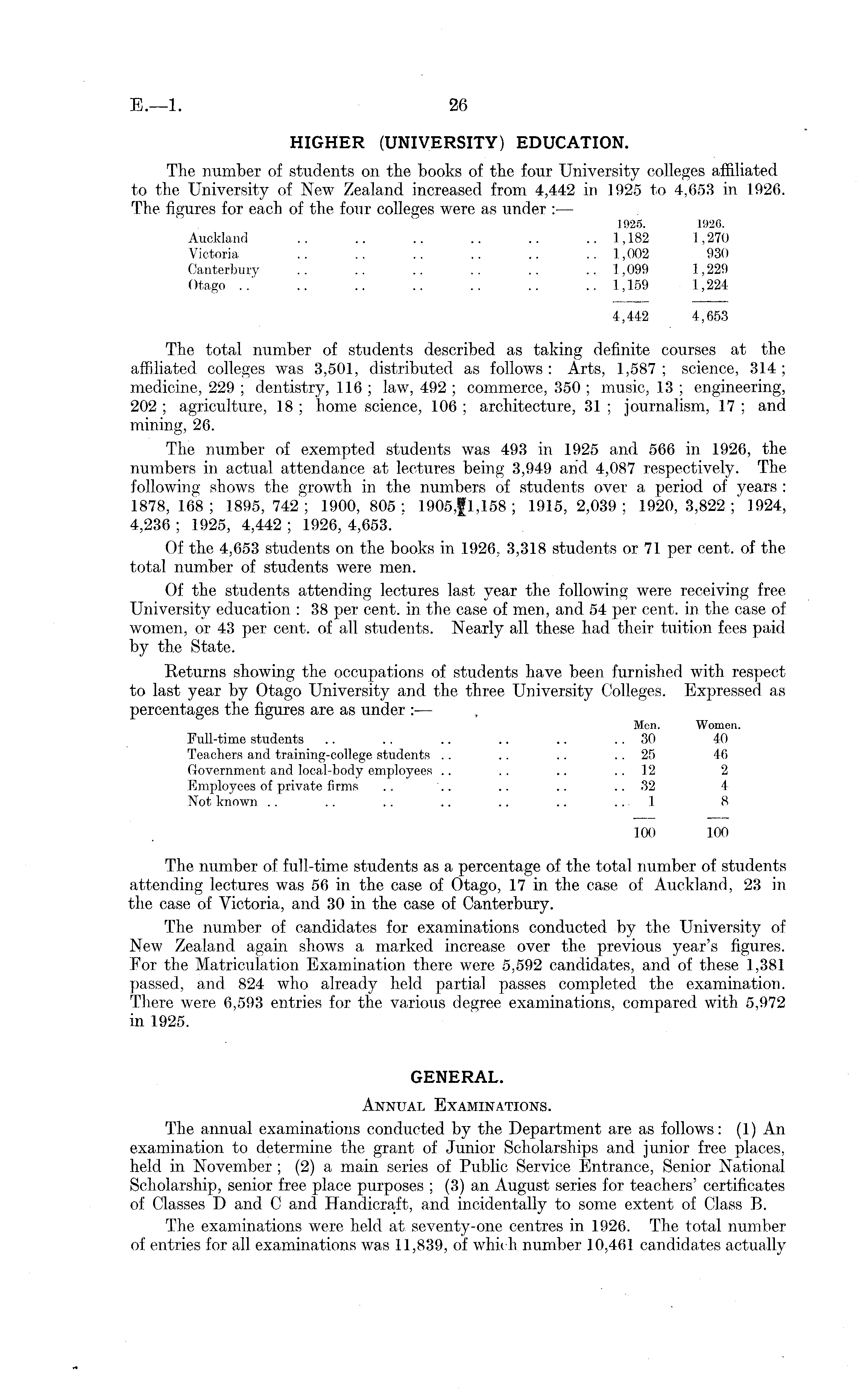 HIGHER (UNIVERSITY) EDUCATION. The number of students on the books of the four University colleges affiliated to the University of New Zealand increased from 4,442 in 1925 to 4,653 in 1926. The figures for each of the four colleges were as under : — 1925. 1926. Auckland .. .. .. .. .. .. 1,182 1,270 Victoria .. .. .. .. .. 1,002 930 Canterbury .. .. .. .. .. .. 1,099 1,229 Otago ..' .. .. .. .. .. .. 1,159 1,224 4,442 4,653 The total number of students described as taking definite courses at the affiliated colleges was 3,501, distributed as follows : Arts, 1,587 ; science, 314 ; medicine, 229 ; dentistry, 116 ; law, 492 ; commerce, 350 ; music, 13 ; engineering, 202 ; agriculture, 18 ; home science, 106 ; architecture, 31 ; journalism, 17 ; and mining, 26. The number of exempted students was 493 in 1925 and 566 in 1926, the numbers in actual attendance at lectures being 3,949 and 4,087 respectively. The following shows the growth in the numbers of students over a period of years : 1878, 168 ; 1895, 742 ; 1900, 805 ; 1905,g1, 158 ; 1915, 2,039 ; 1920, 3,822 ; 1924, 4,236 ; 1925, 4,442 ; 1926, 4,653. Of the 4,653 students on the books in 1926, 3,318 students or 71 per cent, of the total number of students were men. Of the students attending lectures last year the following were receiving free University education : 38 per cent, in the case of men, and 54 per cent, in the case of women, or 43 per cent, of all students. Nearly all these had their tuition fees paid by the State. Returns showing the occupations of students have been furnished with respect to last year by Otago University and the three University Colleges. Expressed as percentages the figures are as under : — Men. Women. Full-time students .. .. .. .. .. 30 40 Teachers and training-college students .. .. .. 25 46 Government and local-body employees .. .. .. 12 2 Employees of private firms .. .. .. .. 32 4 Not known .. .. .. .. .. .. .. 1 8 100 100 The number of full-time students as a percentage of the total number of students attending lectures was 56 in the case of Otago, 17 in the case of Auckland, 23 in the case of Victoria, and 30 in the case of Canterbury. The number of candidates for examinations conducted by the University of New Zealand again shows a marked increase over the previous year's figures. For the Matriculation Examination there were 5,592 candidates, and of these 1,381 passed, and 824 who already held partial passes completed the examination. There were 6,593 entries for the various degree examinations, compared with 5,972 in 1925. GENERAL. Annual Examinations. The annual examinations conducted by the Department are as follows: (1) An examination to determine the grant of Junior Scholarships and junior free places, held in November ; (2) a main series of Public Service Entrance, Senior National Scholarship, senior free place purposes ; (3) an August series for teachers' certificates of Classes D and C and Handicraft, and incidentally to some extent of Class B. The examinations were held at seventy-one centres in 1926. The total number of entries for all examinations was 11,839, of which number 10,461 candidates actually