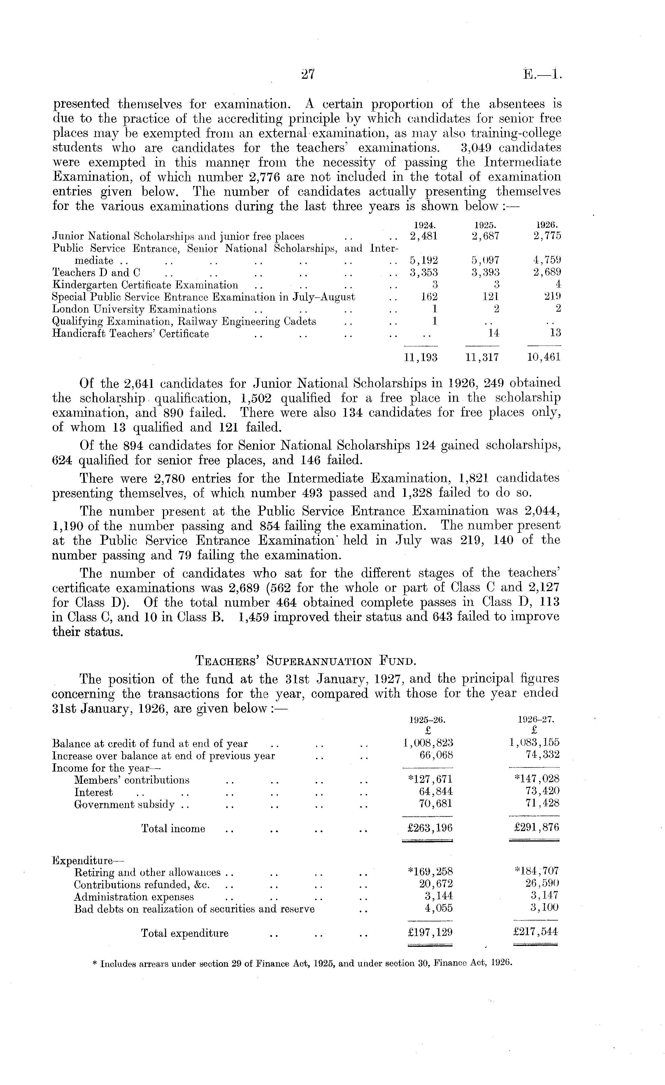 presented themselves for examination. A certain proportion of the absentees is due to the practice of the accrediting principle by which candidates for senior free places may be exempted from an external examination, as may also training-college students who are candidates for the teachers' examinations. 3,049 candidates were exempted in this manner from the necessity of passing the Intermediate Examination, of which number 2,776 are not included in the total of examination entries given below. The number of candidates actually presenting themselves for the various examinations during the last three years is shown below : —- 1924. 1925. 192(5. Junior National Scholarships and junior free places .. .. 2,481 2,687 2,775 Public Service Entrance, Senior National Scholarships, and Intermediate .. .. .. .. .. .. .. 5,192 5,097 4,759 Teachers D and C .. .. .. .. .. .. 3,353 3,393 2,689 Kindergarten Certificate Examination .. .. .. .. 3 3 4 Special Public Service Entrance Examination in July-August . . 162 121 219 London University Examinations .. .. . . . . 1 2 2 Qualifying Examination, Railway Engineering Cadets . . .. 1 Handicraft Teachers' Certificate .. .. .. .. .. 14 13 11,193 11,317 10,461 Of the 2,641 candidates for Junior National Scholarships in 1926, 249 obtained the scholarship qualification, 1,502 qualified for a free place in the scholarship examination, and 890 failed. There were also 134 candidates for free places only, of whom 13 qualified and 121 failed. Of the 894 candidates for Senior National Scholarships 124 gained scholarships, 624 qualified for senior free places, and 146 failed. There were 2,780 entries for the Intermediate Examination, 1,821 candidates presenting themselves, of which number 493 passed and 1,328 failed to do so. The number present at the Public Service Entrance Examination was 2,044, 1,190 of the number passing and 854 failing the examination. The number present at the Public Service Entrance Examination held in July was 219, 140 of the number passing and 79 failing the examination. The number of candidates who sat for the different stages of the teachers' certificate examinations was 2,689 (562 for the whole or part of Class C and 2,127 for Class D). Of the total number 464 obtained complete passes in Class D, 113 in Class C, and 10 in Class B. 1,459 improved their status and 643 failed to improve their status. Teachers' Superannuation Fund. The position of the fund at the 31st January, 1927, and the principal figures concerning the transactions for the year, compared with those for the year ended 31st January, 1926, are given below : — 1925-26. 1926-27. £ £ Balance at credit of fund at end of year .. .. .. 1,008,823 1,083,155 Increase over balance at end of previous year .. .. 66,068 74,332 Income for the year — Members'contributions .. .. .. .. *127,671 *147,028 Interest .. .. .. .. .. .. 64,844 73,420 Government subsidy .. .. .. .. .. 70,681 71,428 Total income .. .. .. .. £263,196 £291,876 Expenditure — Retiring and other allowances .. .. .. .. *169,258 *184,707 Contributions refunded, &c. .. .. .. .. 20,672 26,590 Administration expenses .. .. .. .. 3,144 3,147 Bad debts on realization of securities and reserve .. 4,055 3,100 Total expenditure .. .. .. £197,129 £217,544 * Includes arrears under section 29 of Finance Act, 1925, and under section 30, Finance Act, 1926.