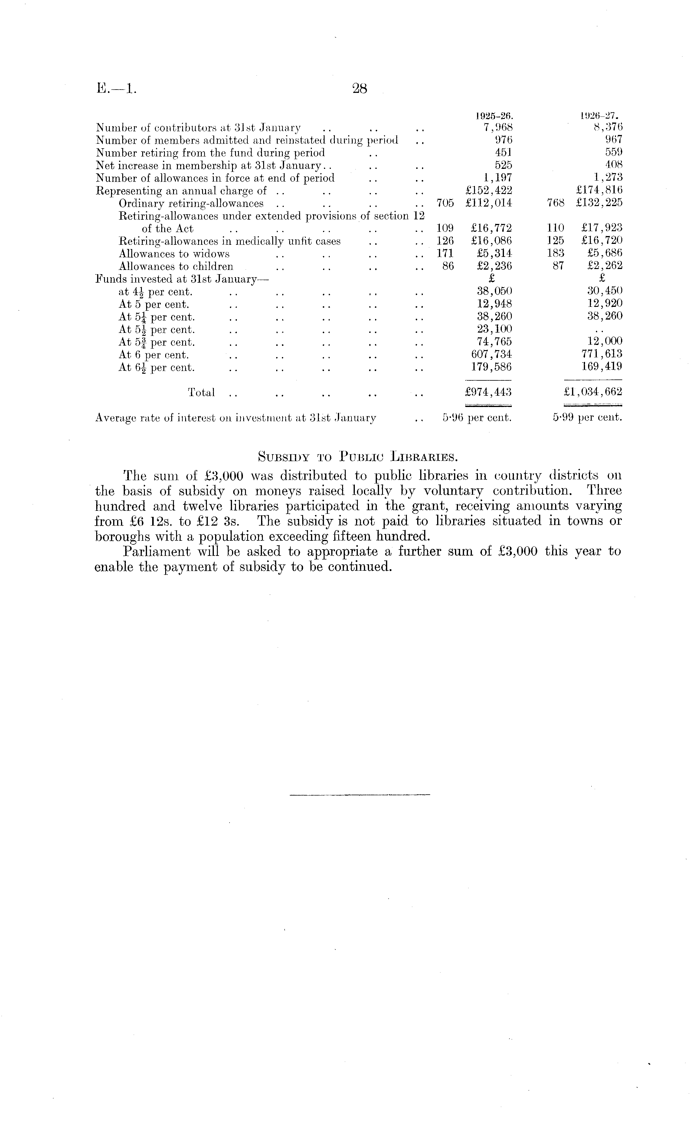 1925-26. 1926-27. Number of contributors at 31 st January .. .. .. 7,968 8,376 Number of members admitted and reinstated during period .. 976 967 Number retiring from the fund during period .. 451 559 Net increase in membership at 31st January. . .. .. 525 408 Number of allowances in force at end of period .. .. 1,197 1,273 Representing an annual charge of .. .. .. .. £152,422 £174,816 Ordinary retiring-allowances .. .. .. .. 705 £112,014 768 £132,225 Retiring-allowances under extended provisions of section 12 of the Act .. .. .. .. ..109 £16,772 110 £17,923 Retiring-allowances in medically unfit cases .. .. 126 £16,086 125 £16,720 Allowances to widows .. .. .. .. 171 £5,314 183 £5,686 Allowances to children .. . . .. 86 £2,236 87 £2,262 Funds invested at 31st January — £ £ at 4| per cent. .. .. .. .. .. 38,050 30,450 At 5 per cent. .. . . .. .. .. 12,948 12,920 At 5J per cent. .. .. .. .. .. 38,260 38,260 At 51 per cent. .. .. .. .. .. 23,100 At 5f per cent. .. .. .. .. .. 74,765 12,000 At 6 per cent. .. .. .. .. .. 607,734 771,613 At 6| per cent. .. .. .. .. .. 179,586 169,419 Total .. .. .. .. .. £974,443 £1,034,662 Average rate of interest on investment at 31st January .. 5-96 per cent. 5-99 x>er cent. Subsidy to Public Libraries. The sum of £3,000 was distributed to public libraries in country districts on the basis of subsidy on moneys raised locally by voluntary contribution. Three hundred and twelve libraries participated in the grant, receiving amounts varying from £6 12s. to £12 3s. The subsidy is not paid to libraries situated in towns or boroughs with a population exceeding fifteen hundred. Parliament will be asked to appropriate a further sum of £3,000 this year to enable the payment of subsidy to be continued.