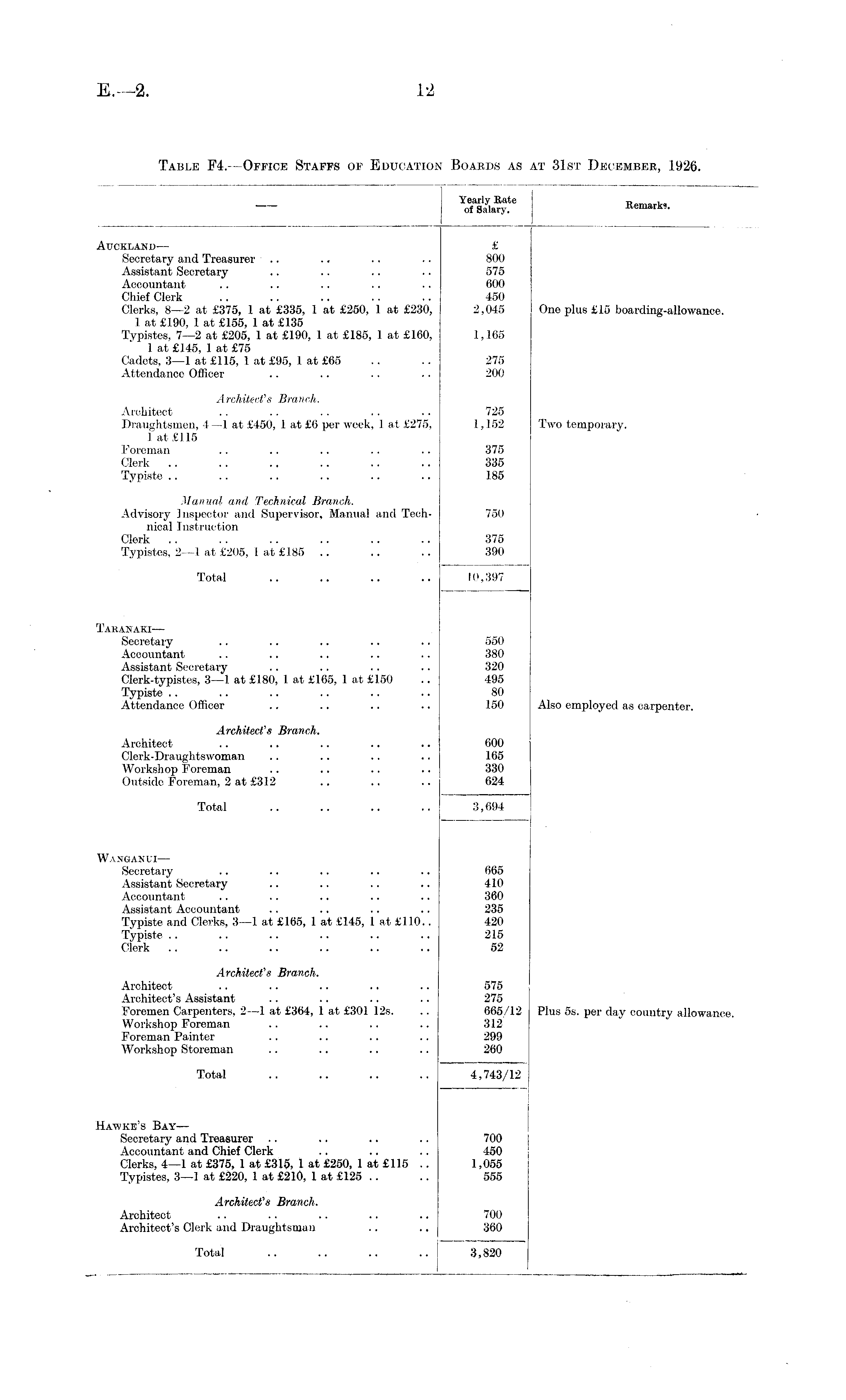 Yearly Rate „ of Salary. Remark". Auckland — £ Secretary and Treasurer .. .. .. .. 800 Assistant Secretary .. .. .. .. 575 Accountant .. .. .. .. •. 600 Chief Clerk .. .. .. .. .. 450 Clerks, 8 —2 at £375, 1 at £335, 1 at £250, 1 at £230, 2,045 One plus £15 boarding-allowance. 1 at £190, 1 at £155, 1 at £135 Typistes, 7 —2 at £205, 1 at £190, 1 at £185, 1 at £160, 1,165 1 at £145, 1 at £75 Cadets, 3—1 at £115, 1 at £95, 1 at £65 .. .. 275 Attendance Officer .. .. .. .. 200 Architect's Branch. Architect .. .. .. . . .. 725 Draughtsmen, 4—1 at £450, 1 at £6 per week, 1 at £275, 1,152 Two temporary. 1 at £115 Foreman .. .. .. .. .. 375 Clerk .. .. .. .. .. .. 335 Typiste .. .. .. .. .. .. 185 Manual and Technical Branch. Advisory Inspector and Supervisor, Manual and Tech- 750 nical Instruction Clerk .. . . .. .. .. .. 375 Typistes, 2—1 at £205, 1 at £185 .. .. .. 390 Total .. .. .. .. 10,397 Taranaki— Secretary .. .. .. .. .. 550 Accountant .. .. .. .. .. 380 Assistant Secretary .. .. .. .. 320 Clerk-typistes, 3—1 at £180, 1 at £165, 1 at £150 .. 495 Typiste .. .. .. .. .. .. 80 Attendance Officer .. .. .. .. 150 Also employed as carpenter. Architect's Branch. Architect .. .. .. .. .. 600 Clerk-Draughtswoman .. .. .. .. 165 Workshop Foreman .. .. .. .. 330 Outside Foreman, 2 at £312 .. .. .. 624 Total .. .. .. .. 3,694 Wanganui— Secretary .. .. .. .. .. 665 Assistant Secretary .. .. .. .. 410 Accountant .. .. .. .. .. 360 Assistant Accountant .. .. .. .. 235 Typiste and Clerks, 3 —1 at £165, 1 at £145, l at £110.. 420 Typiste .. .. .. .. .. .. 215 Clerk .. .. .. .. .. .. 52 Architect's Branch. Architect .. .. .. .. .. 575 Architect's Assistant .. .. .. .. 275 Foremen Carpenters, 2—1 at £364, 1 at £301 12s. .. 665/12 Plus 5s. per day country allowance. Workshop Foreman .. .. .. .. 312 Foreman Painter .. .. .. .. 299 Workshop Storeman .. .. .. .. 260 Total .. .. .. .. 4,743/12 Hawke's Bay— Secretary and Treasurer .. .. .. .. 700 Accountant and Chief Clerk .. .. .. 450 Clerks, 4—1 at £375, 1 at £315, 1 at £250, 1 at £115 .. 1,055 Typistes, 3—1 at £220, 1 at £210, 1 at £125 .. .. 555 Architect's Branch. Architect .. .. .. .. .. 700 Architect's Clerk and Draughtsman .. .. 360 Total .. .. .. .. 3,820