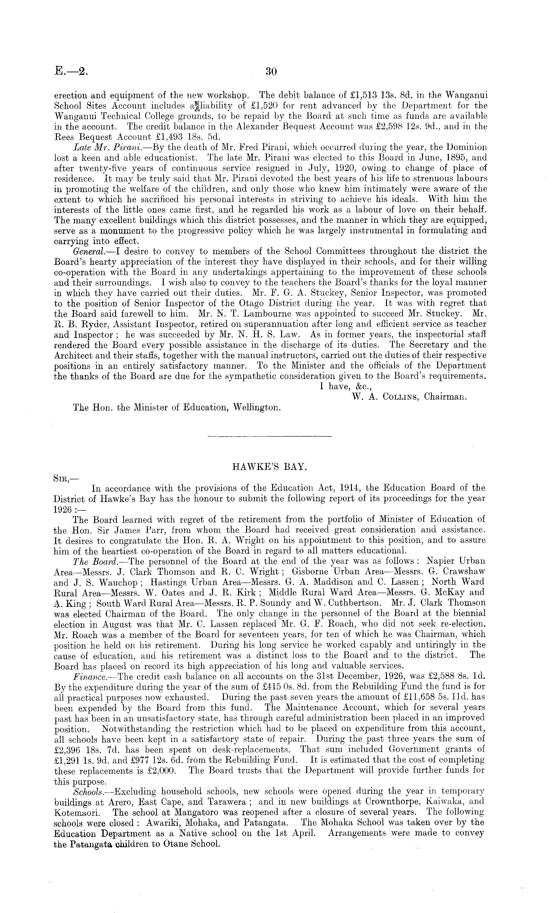 HAWKE'S BAY. Sir, — In accordance with the provisions of the Education Act, 1914, the Education Board of the District of Hawke's Bay has the honour to submit the following report of its proceedings for the year 1926 — The Board learned with regret of the retirement from the portfolio of Minister of Education of the Hon. Sir James Parr, from whom the Board had received great consideration and assistance. It desires to congratulate the Hon. R. A. Wright on his appointment to this position, and to assure him of the heartiest co-operation of the Board in regard to all matters educational. The Board. —The personnel of the Board at the end of the year was as follows : Napier Urban Area—Messrs. J. Clark Thomson and R. C. Wright; Gisborne Urban Area —Messrs. G. Crawshaw and J. S. Wauchop ; Hastings Urban Area —Messrs. G. A. Maddison and C. Lassen ; North Ward Rural Area —Messrs. W. Oates and J. R. Kirk ; Middle Rural Ward Area —Messrs. G. McKay and A- King ; South Ward Rural Area —Messrs. R. P. Soundy and W . Cuthbertson. Mr. J. Clark Thomson was elected Chairman of the Board. The only change in the personnel of the Board at the biennial election in August was that Mr. C. Lassen replaced Mr. G. F. Roach, who did not seek re-election. Mr. Roach was a member of the Board for seventeen years, for ten of which he was Chairman, which position he held on his retirement. During his long service he worked capably and untiringly in the cause of education, and his retirement was a distinct loss to the Board and to the district. The Board has placed on record its high appreciation of his long and valuable services. Finance. —The credit cash balance on all accounts on the 31st December, 1926, was £2,588 Bs. Id. By the expenditure during the year of the sum of £415 Os. Bd. from the Rebuilding Fund the fund is for all practical purposes now exhausted. During the past seven year,s the amount of £11,658 ss. lid. has been expended by the Board from this fund. The Maintenance Account, which for several years past has been in an unsatisfactory state, has through careful administration been placed in an improved position. Notwithstanding the restriction which had to be placed on expenditure from this account, all schools have been kept in a satisfactory state of repair. During the past three years the sum of £2,396 18s. 7d. has been spent on desk-replacements. That sum included Government grants of £1,291 Is. 9d. and £977 12s. 6d. from the Rebuilding Fund. It is estimated that the cost of completing these replacements is £2,000. The Board trusts that the Department will provide further funds for this purpose. Schools. —Excluding household schools, new schools were opened during the year in temporary buildings at Arero, East Cape, and Tarawera ; and in new buildings at Crownthorpe, Kaiwaka, and Kotemaori. The school at Mangatoro was reopened after a closure of several years. The following schools were closed : Awariki, Mohaka, and Patangata. The Mohaka School was taken over by the Education Department as a Native school oil the Ist April. Arrangements were made to convey the Patangata children to Otane School.