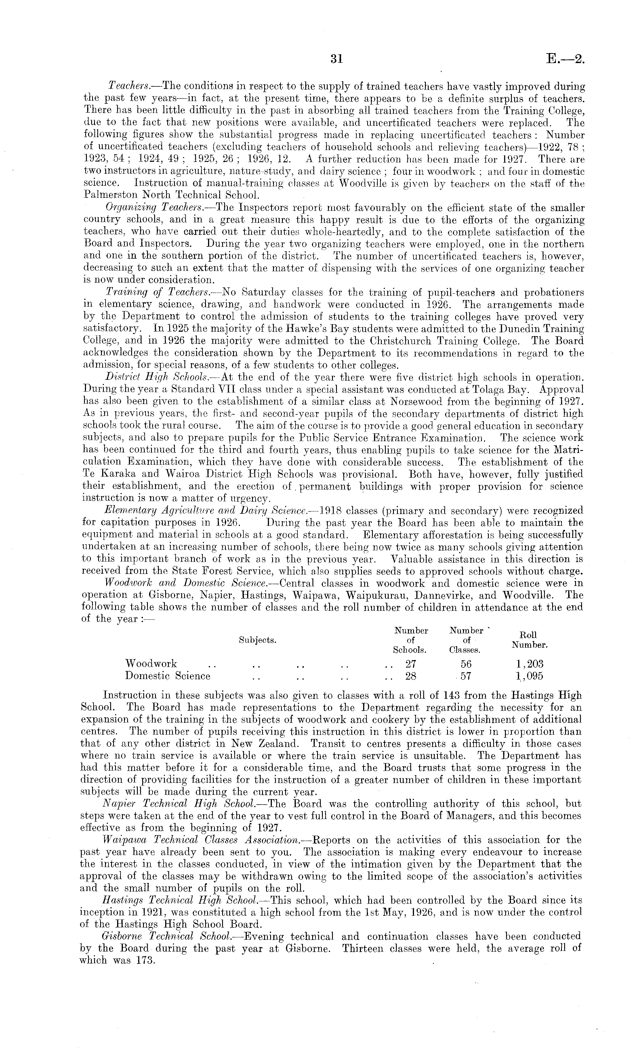 Teachers.- —The conditions in respect to the supply of trained teachers have vastly improved during the past few years —in fact, at the present time, there appears to he a definite surplus of teachers. There has been little difficulty in the past in absorbing all trained teachers from the Training College, due to the fact that new positions were available, and uncertificated teachers were replaced. The following figures show the substantial progress made in replacing uncertificated teachers : Number of uncertificated teachers (excluding teachers of household schools and relieving teachers) —1922, 78 ; 1923, 54 ; 1924, 49 ; 1928, 26 ; 1926, 12. A further reduction has been made for 1927. There are two instructors in agriculture, nature-study, and dairy science ; four in woodwork ; and four in domestic science. Instruction of manual-training classes at Woodville is given by teachers on the staff of the Palmerston North Technical School. Organizing Teachers.—The Inspectors report most favourably on the efficient state of the smaller country schools, and in a great measure this happy result is due to the efforts of the organizing teachers, who have carried out their duties whole-heartedly, and to the complete satisfaction of the Board and Inspectors. During the year two organizing teachers were employed, one in the northern and one in the southern portion of the district. The number of uncertificated teachers is, however, decreasing to such an extent that the matter of dispensing with the services of one organizing teacher is now under consideration. Training of Tewhers,—No Saturday classes for the training of pupil-teachers and probationers in elementary science, drawing, and handwork were conducted in 1926. The arrangements made by the Department to control the admission of students to the training colleges have proved very satisfactory. In 1925 the majority of the Hawke's Bay students were admitted to the Dunedin Training College, and in 1926 the majority were admitted to the Christchurch Training College. The Board acknowledges the consideration shown by the Department to its recommendations in regard to the admission, for special reasons, of a few students to other colleges. District High Schools.—At the end of the year there were five district high schools in operation. During the year a Standard YII class under a special assistant was conducted at Tolaga Bay. Approval has also been given to the establishment of a similar class at Norsewood from the beginning of 1927. As in previous years, the first- and second-year pupils of the secondary departments of district high schools took the rural course. The aim. of the course is to provide a good general education in secondary subjects, and also to prepare pupils for the Public Service Entrance Examination. The science work has been continued for the third and fourth years, thus enabling pupils to take science for the Matriculation Examination, which they have done with considerable success. The establishment of the Te Karaka and Wairoa District High Schools was provisional. Both have, however, fully justified their establishment, and the erection of, permanent buildings with proper provision for science instruction is now a matter of urgency. Elementary Agriculture and Dairy Science.—l9lB classes (primary and secondary) were recognized for capitation purposes in 1926. During the past year the Board has been able to maintain the equipment and material in schools at a good standard. Elementary afforestation is being successfully undertaken at an increasing number of schools, there being now twice as many schools giving attention to this important branch of work as in the previous year. Valuable assistance in this direction is received from the State Forest Service, which also supplies seeds to approved schools without charge. Woodwork and Domestic Science.—Central classes in woodwork and domestic science were in operation at Gisborne, Napier, Hastings, Waipawa, Waipukurau, Dannevirke, and Woodville. The following table shows the number of classes and the roll number of children in attendance at the end of the year :— Number Number ' p i. Subjects. of of AT i J a i i m Number. bchools. Classes. Woodwork .. .. .. .. ..27 56 1,203 Domestic Science .. .. .. .. 28 57 1,095 Instruction in these subjects was also given to classes with a roll of 143 from the Hastings High School. The Board has made representations to the Department regarding the necessity for an expansion of the training in the subjects of woodwork and cookery by the establishment of additional centres. The number of pupils receiving this instruction in this district is lower in proportion than that of any other district in New Zealand. Transit to centres presents a difficulty in those cases where no train service is available or where the train service is unsuitable. The Department has had this matter before it for a considerable time, and the Board trusts that some progress in the direction of providing facilities for the instruction of a greater number of children in these important subjects will be made during the current year. Napier Technical High School.—The Board was the controlling authority of this school, but steps were taken at the end of the year to vest full control in the Board of Managers, and this becomes effective as from the beginning of 1927. Waipawa Technical Classes Association.—Reports on the activities of this association for the past year have already been sent to you. The association is making every endeavour to increase the interest in the classes conducted, in view of the intimation given by the Department that the approval of the classes may be withdrawn owing to the limited scope of the association's activities and the small number of pupils on the roll. Hastings Technical High School.—This school, which had been controlled by the Board since its inception in 1921, was constituted a high school from the Ist May, 1926, and is now 