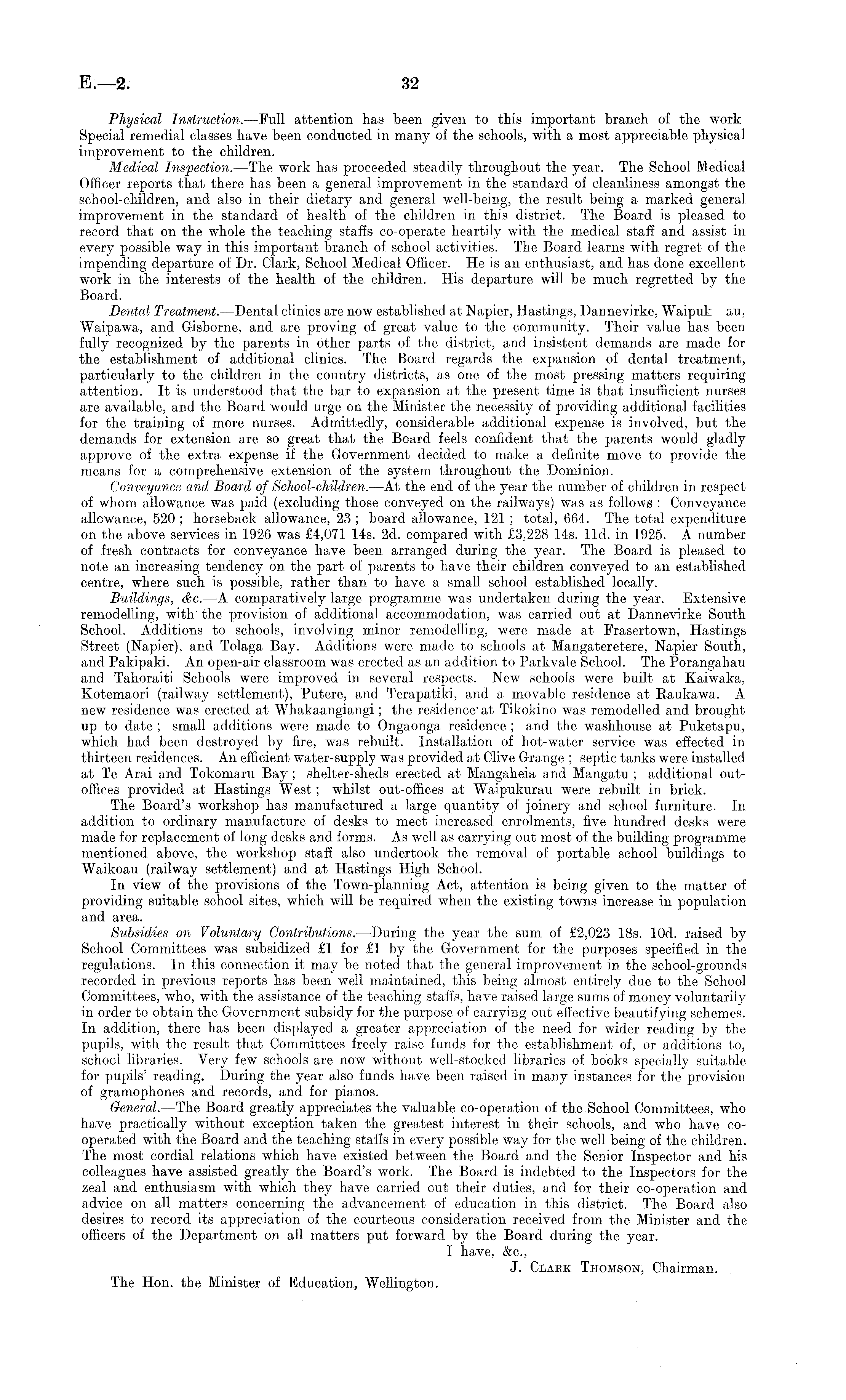 Physical Instruction. —Full attention has been given, to this important branch of the work Special remedial classes have been conducted in many of the schools, with a most appreciable physical improvement to the children. Medical Inspection.—The work has proceeded steadily throughout the year. The School Medical Officer reports that there has been a general improvement in the standard of cleanliness amongst the school-children, and also in their dietary and general well-being, the result being a marked general improvement in the standard of health of the children in this district. The Board is pleased to record that on the whole the teaching staffs co-operate heartily with the medical staff and assist in every possible way in this important branch of school activities. The Board learns with regret of the impending departure of Dr. Clark, School Medical Officer. He is an enthusiast, and has done excellent work in the interests of the health of the children. His departure will be much regretted by the Board. Dental Treatment. —Dental clinics are now established at Napier, Hastings, Dannevirke, Waipuk au, Waipawa, and Gisborne, and are proving of great value to the community. Their value has been fully recognized by the parents in other parts of the district, and insistent demands are made for the establishment of additional clinics. The Board regards the expansion of dental treatment, particularly to the children in the country districts, as one of the most pressing matters requiring attention. It is understood that the bar to expansion at the present time is that insufficient nurses are available, and the Board would urge on the Minister the necessity of providing additional facilities for the training of more nurses. Admittedly, considerable additional expense is involved, but the demands for extension are so great that the Board feels confident that the parents would gladly approve of the extra expense if the Government decided to make a definite move to provide the means for a comprehensive extension of the system throughout the Dominion. Conveyance and Board of School-children.—At the end of the year the number of children in respect of whom allowance was paid (excluding those conveyed on the railways) was as follows : Conveyance allowance, 520 ; horseback allowance, 23 ; board allowance, 121 ; total, 664. The total expenditure on the above services in 1926 was £4,071 14s. 2d. compared with £3,228 14s. lid. in 1925. A number of fresh contracts for conveyance have been arranged during the year. The Board is pleased to note an increasing tendency on the part of parents to have their children conveyed to an established centre, where such is possible, rather than to have a small school established locally. Buildings, &c.—A comparatively large programme was undertaken during the year. Extensive remodelling, with the provision of additional accommodation, was carried out at Dannevirke South School. Additions to schools, involving minor remodelling, were made at Frasertown, Hastings Street (Napier), and Tolaga Bay. Additions were made to schools at Mangateretere, Napier South, and Pakipaki. An open-air classroom was erected as an addition to Parkvale School. The Porangahau and Tahoraiti Schools were improved in several respects. New schools were built at Kaiwaka, Kotemaori (railway settlement), Putere, and Terapatiki, and a movable residence at Raukawa. A new residence was erected at Whakaangiangi; the residence' at Tikokino was remodelled and brought up to date ; small additions were made to Ongaonga residence ; and the washhouse at Puketapu, which had been destroyed by fire, was rebuilt. Installation of hot-water service was effected in thirteen residences. An efficient water-supply was provided at Clive Grange ; septic tanks were installed at Te Arai and Tokomaru Bay ; shelter-sheds erected at Mangaheia and Mangatu ; additional outoffices provided at Hastings West; whilst out-offices at Waipukurau were rebuilt in brick. The Board's workshop has manufactured a large quantity of joinery and school furniture. In addition to ordinary manufacture of desks to meet increased enrolments, five hundred desks were made for replacement of long desks and forms. As well as carrying out most of the building programme mentioned above, the workshop staff also undertook the removal of portable school buildings to Waikoau (railway settlement) and at Hastings High School. In view of the provisions of the Town-planning Act, attention is being given to the matter of providing suitable school sites, which will be required when the existing towns increase in population and area. Subsidies on Voluntary Contributions.—During the year the sum of £2,023 18s. lOd. raised by School Committees was subsidized £1 for £1 by the Government for the purposes specified in the regulations. In this connection it may be noted that the general improvement in the school-grounds recorded in previous reports has been well maintained, this being almost entirely due to the School Committees, who, with the assistance of the teaching staffs, have raised large sums of money voluntarily in order to obtain the Government subsidy for the purpose of carrying out effective beautifying schemes. In addition, there has been displayed a greater appreciation of the need for wider reading by the pupils, with the result that Committees freely raise funds for the establishment of, or additions to, school libraries. Very few schools are now without well-stocked libraries of books specially suitable for pupils' reading. During the year also funds have been raised in many instances for the provision of gramophones and records, and for pianos. General.—The Board greatly appreciates the valuable co-operation of the School Committees, who have practically without exception taken the greatest interest in their schools, and who have cooperated with the Board and the teaching staffs in every possible way for the well being of the children. 