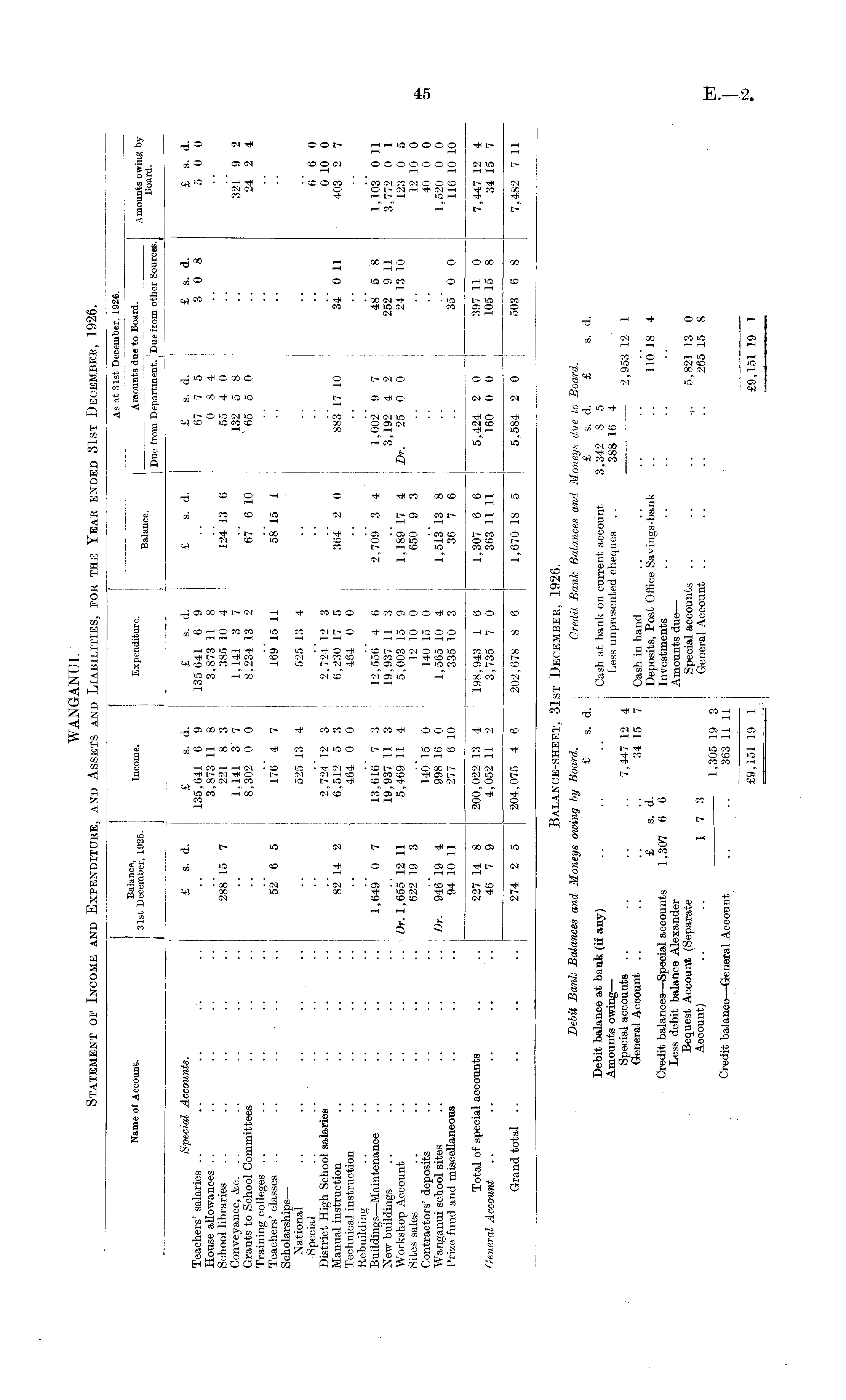 Balance-sheet. 31st Decembek, 1926. Debit Bank Balances and Moneys owiruj by Board. Credit Bank Balances and Moneys due to Board. £ s. d. £ s. d. £ s. d. Debit balance at bank (if any) .. .. .. Cash at bank on current account 3,342 8 5 Amounts owing— Less unpresented cheques .. 388 16 4 Special accounts .. .. .. .. 7,447 12 4 2,953 12 1 General Account .. .. .. .. 34 15 7 Cash in hand £ s. d. Deposits, Post Office Savings-bank .. .. 110 18 4 Credit balances— Special accounts 1,307 6 6 Investments Less debit balance Alexander Amounts due— Bequest Account (Separate Special accounts .. .. .. 5,821 13 0 Aocount) .. .. 17 3 General Account .. .. .. .. 265 15 8 1,305 19 3 Credit balance— General Account .. .. 363 11 11 £9,151 19 1 £9,151 19 1