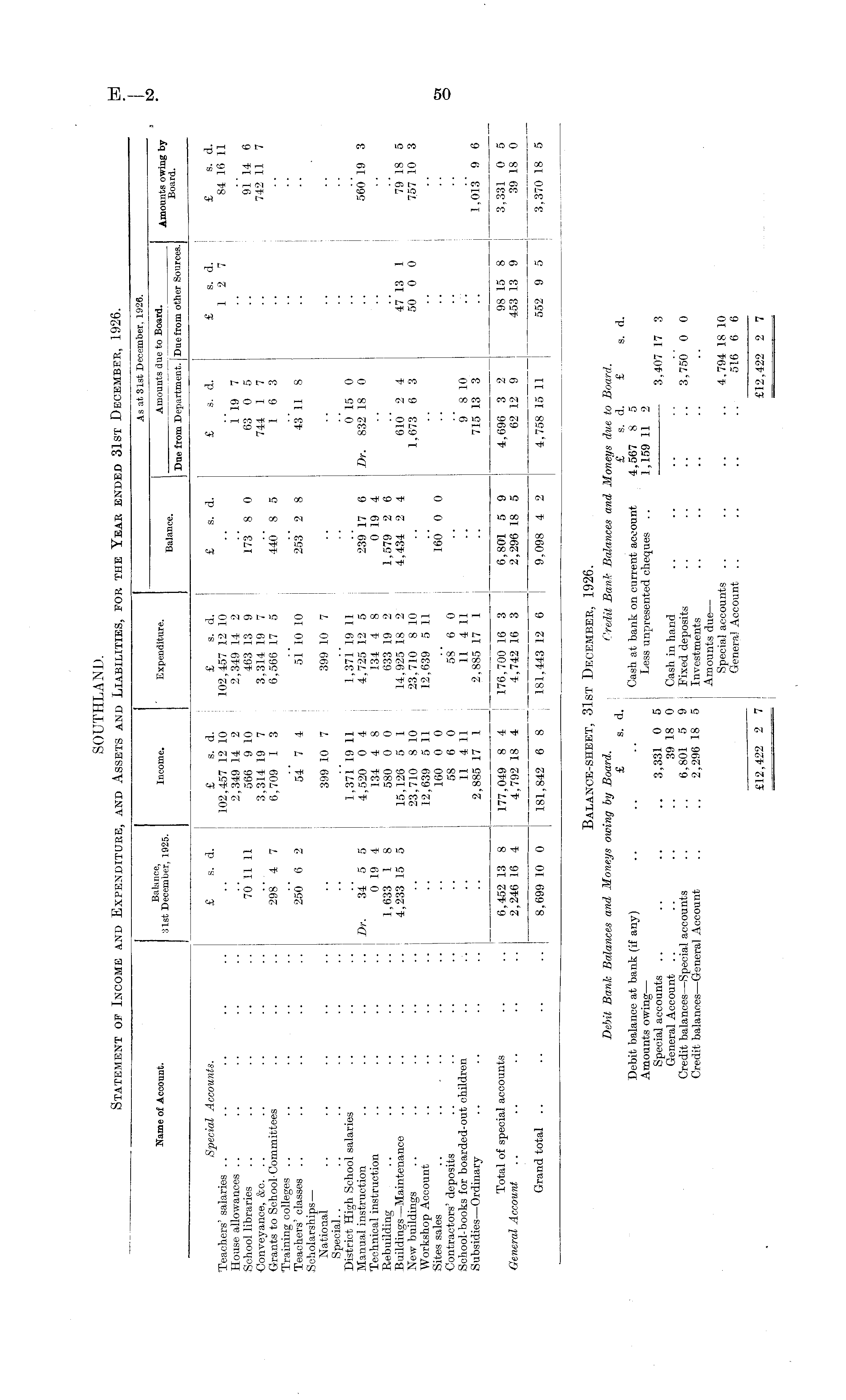 Balance-sheet, 31st December, 1926. Debit Bank Balances and Moneys owing by Board. Credit Bank Balances and Moneys due to Board. £ s. d. £ s. d. £ s. d. Debit balance at bank (if any) .. .. .. Cash at bank on current account 4,567 8 5 Amounts owing— Less unpresented cheques .. 1,159 11 2 Special accounts .. .. .. .. 3,331 0 5 3,407 17 3 General Account .. .. .. .. 39 18 0 Cash in hand Credit balances—Special accounts .. .. 6,801 5 9 Fixed deposits .. .. .. .. 3,750 0 0 Credit balances—General Account .. .. 2,296 18 5 Investments Amounts due— Special accounts .. .. .. .. 4,794 18 10 Genera] Account .. .. .. .. 516 6 6 £12,422 2 7 £12,422 2 7