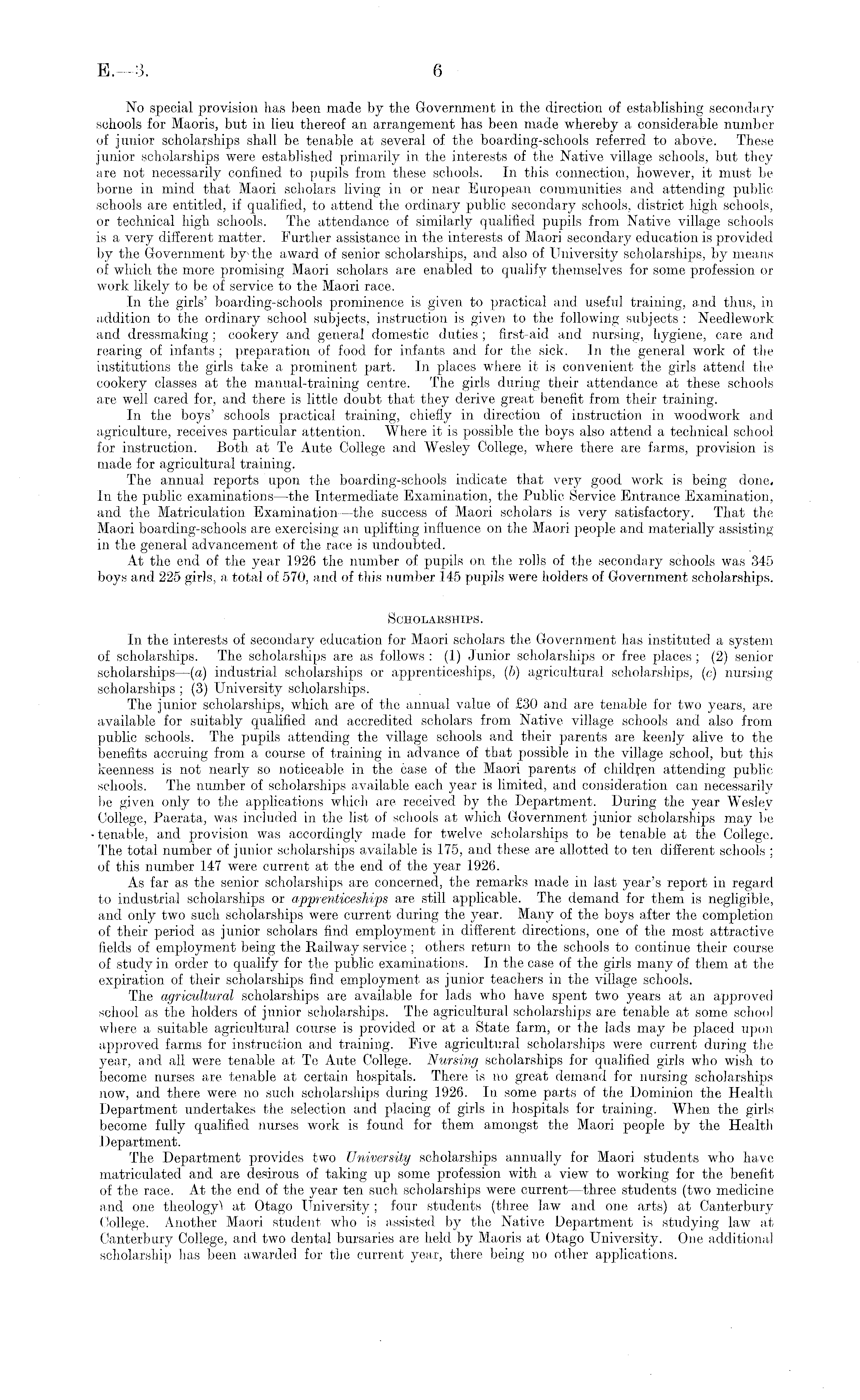 No special provision has been made by the Government in the direction of establishing secondary schools for Maoris, but in lieu thereof an arrangement has been made whereby a considerable number of junior scholarships shall be tenable at several of the boarding-schools referred to above. These junior scholarships were established primarily in the interests of the Native village schools, but they are not necessarily confined to pupils from these schools. In this connection, however, it must be borne in mind that Maori scholars living in or near European communities and attending public schools are entitled, if qualified, to attend the ordinary public secondary schools, district high schools, or technical high schools. The attendance of similarly qualified pupils from Native village schools is a very different matter. Further assistance in the interests of Maori secondary education is provided by the Government by the award of senior scholarships, and also of University scholarships, by means of which the more promising Maori scholars are enabled to qualify themselves for some profession or work likely to be of service to the Maori race. In the girls' boarding-schools prominence is given to practical and useful training, and thus, in addition to the ordinary school subjects, instruction is given to the following subjects : Needlework and dressmaking; cookery and general domestic duties; first-aid and nursing, hygiene, care and rearing of infants ; preparation of food for infants and for the sick. In the general work of the institutions the girls take a prominent part. In places where it is convenient the girls attend the cookery classes at the manual-training centre. The girls during their attendance at these schools are well cared for, and there is little doubt that they derive great benefit from their training. In the boys' schools practical training, chiefly in direction of instruction in woodwork and agriculture, receives particular attention. Where it is possible the boys also attend a technical school for instruction. Both, at Te Aute College and Wesley College, where there are farms, provision is made for agricultural training. The annual reports upon the boarding-schools indicate that very good work is being done. In the public examinations—the Intermediate Examination, the Public Service Entrance Examination, and the Matriculation Examination—the success of Maori scholars is very satisfactory. That the Maori boarding-schools are exercising an uplifting influence on the Maori people and materially assisting in the general advancement of the race is undoubted. At the end of the year 1926 the number of pupils on the rolls of the secondary schools was 345 boys and 225 girls, a total of 570, and of this number 145 pupils were holders of Government scholarships. ScHOLAK,SHIPS. In the interests of secondary education for Maori scholars the Government has instituted a system of scholarships. The scholarships are as follows: (1) Junior scholarships or free places; (2) senior scholarships—(a) industrial scholarships or apprenticeships, (b) agricultural scholarships, (c) nursing scholarships ; (3) University scholarships. The junior scholarships, which are of the annual value of £30 and are tenable for two years, are available for suitably qualified and accredited scholars from Native village schools and also from public schools. The pupils attending the village schools and their parents are keenly alive to the benefits accruing from a course of training in advance of that possible in the village school, but this keenness is not nearly so noticeable in the case of the Maori parents of children attending public schools. The number of scholarships available each year is limited, and consideration can necessarily be given only to the applications which are received by the Department. During the year Wesley College, Paerata, was included in the list of schools at which Government junior scholarships may be ■ tenable, and provision was accordingly made for twelve scholarships to be tenable at the College. The total number of junior scholarships available is 175, and these are allotted to ten different schools ; of this number 147 were current at the end of the year 1926. As far as the senior scholarships are concerned, the remarks made in last year's report in regard to industrial scholarships or apprenticeships are still applicable. The demand for them is negligible, and only two such scholarships were current during the year. Many of the boys after the completion of their period as junior scholars find employment in different directions, one of the most attractive fields of employment being the Railway service ; others return to the schools to continue their course of study in order to qualify for the public examinations. In the case of the girls many of them at the expiration of their scholarships find employment as junior teachers in the village schools. The agricultural scholarships are available for lads who have spent two years at an approved school as the holders of junior scholarships. The agricultural scholarships are tenable at some school where a suitable agricultural course is provided or at a State farm, or the lads may be placed upon approved farms for instruction and training. Five agricultural scholarships were current during the year, and all were tenable at Te Aute College. Nursing scholarships for qualified girls who wish to become nurses are tenable at certain hospitals. There is no great demand for nursing scholarships now, and there were no such scholarships during 1926. In some parts of the Dominion the Health Department undertakes the selection and placing of girls in hospitals for training. When the girls become fully qualified nurses work is found for them amongst the Maori people by the Health Department. The Department provides two University scholarships annually for Maori students who have matriculated and are desirous of taking up some profession with a vi