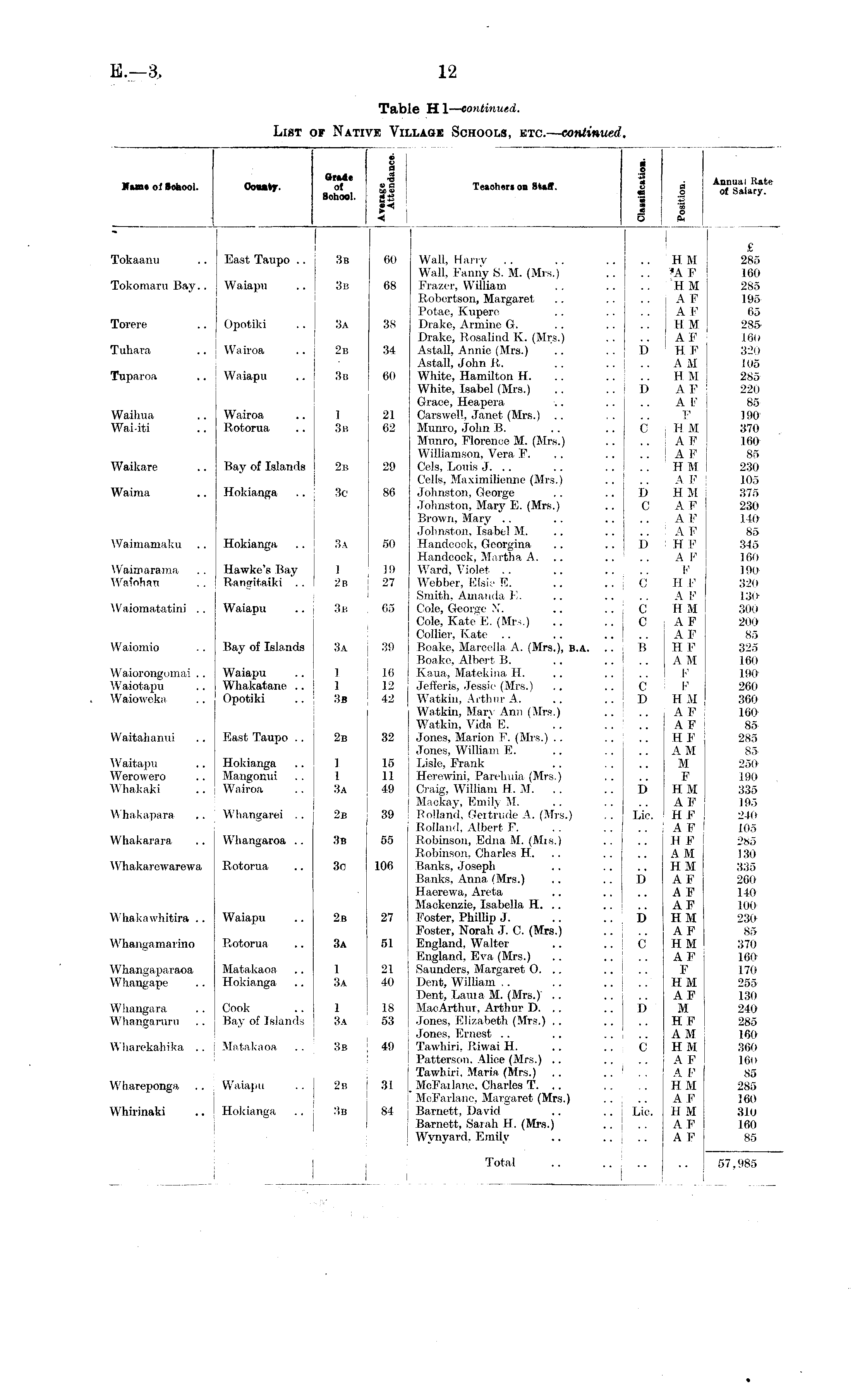 «> a Or*4e 1 | *«• of School. Ooaair. of * °J Teaohcr. on Staff. | g School. - If ■< ! o ft £ Tokaanu .. East Taupo .. 8b 60 Wall, Harry .. .. .. .. KM 285 Wall, Fanny S. M. (Mrs.) .. .. *A P 160 Tokomaru Bay.. Waiapu .. 3b 68 Frazer, William .. .. .. HM 285 Robertson, Margaret .. .. .. AF 195' Potae, Kupere .. .. | A F 65 Torere .. Opotiki .. 3a 38 Drake, Armine G. .. .. .. | HM 285Drake, Rosalind K. (Mrs.) .. .. A F 160 Tuhara .. Wairoa .. 2b 34 Astall, Annie (Mrs.) .. .. D ! H F | 320 Astall, John R. .. .. .. AM! 105 Tuparoa .. Waiapu .. 3b 60 White, Hamilton H. .. .. .. HM 285 White, Isabel (Mrs.) .. .. D AF 220 Grace, Heapera .. .. .. A F 85 Waihua .. Wairoa .. 1 21 Cars well, Janet (Mrs.) .. .. .. F 190 Wai-iti .. Rotorua .. 3b 62 Mttnro, John B. .. .. C | HM 370 Munro, Florence M. (Mrs.) .. .. AF 160 Williamson, Vera F. . . .. 1 A F 85 Waikare .. Bay of Islands 2b 29 Cels, Louis J. .. .. .. .. HM 230 Cells, Maximilienne (Mrs.) .. .. AF 105 Waima .. Hokianga .. 3c 86 Johnston, George .. .. D Hll 375 Johnston, Mary E. (Mrs.) .. C A F 230 Brown, Mary .. .. .. .. A F 140 Johnston, Isabel M. .. .. j A F 85 Waimamaku .. Hokianga .. 3a 50 Handcock, Georgina .. .. D H F 345 Handcock, Martha A. .. .. .. AF j 160 Waiznarama .. Hawke's Bay 1 19 Ward, Violet .. .. .. .. F 190 Wafohati .. Ransitaiki .. 2b 27 Webber, Elsie E. .. .. C H F 320 Smith, Amanda E. .. .. AF 130 Waiomatatini .. Waiapu .. 3b 65 Cole, George N. .. .. C H M 300 Cole, Kate E. (Mrs.) .. .. C A F j 200 Collier, Kate .. .. .. .. A F 85 Waiomio .. Bay of Islands 3a 39 Boake, Marcella A. (Mrs.), b.a. .. B H F 325 Boake, Albert B. .. .. .. AM 160 Waiorongomai .. Waiapu .. 1 16 Kaua, Matekina H. .. .. .. F 190 Waiotapu .. Whakatane .. 1 12 Jefferis, Jessie (Mrs.) .. .. C F 260 Waioweka .. Opotiki .. 3b 42 Watkin, Arthur A. .. .. D HM 360 Watkin, Mary Ann (Mrs.) .. .. A F 160 Watkin, Vida E. .. .... A F 85 Waitahanui .. East Taupo .. 2b 32 Jones, Marion F. (Mrs.) .. .. .. HF 285 Jones, William E. .. .. .. AM 85 Waitapu .. Hokianga .. 1 15 Lisle, Frank .. . . ,. M 250 Werowero .. Mangonui .. 1 11 Herewini, Parehuia (Mrs.) .. .. F 190 Whakaki .. Wairoa .. 3a 49 Craig, William H. M. .. D H M 335 Maekay, Emily M. .. .. .. A F 195 Whakapara .. i Whangarei .. 2b 39 I Rolland, Gertrude A. (Mrs.) .. Lie. H F 240 Rolland, Albert F. .. .. .. A F 105 Whakarara .. Whangaroa .. 3b 55 Robinson, Edna M. (Mis.) .. .. H F 285 Robinson, Charles H. .. .. AM 130 Whakarewarewa Rotorua .. 3o 106 Banks, Joseph . . .. .. H M 335 Banks, Anna, (Mrs.) .. .. D AF 260 Haerewa, Areta .. .. .. A F 140 Mackenzie, Isabella H. .. .. .. A F 100 Whakawhitira .. Waiapu .. 2 b 27 I Foster, Phillip J. .. . . D H M 230 Foster, Norah J. C. (Mrs.) .. .. A F 85 Whangamarino Rotorua .. 3a 51 England. Walter .. .. C H M 370 England. Eva (Mrs.) .. .. . . A F 160 Whangaparaoa Matakaoa .. 1 21 Saunders, Margaret O. .. .. .. F 170 Whangape .. Hokianga .. 3a 40 Dent, William .. .. .. .. H M 255 Dent, Lama M. (Mrs.)' .. .. .. A F 130 Whangara .. Cook .. 1 18 MacArthur, Arthur D. .. .. D M 240 Whangaruru .. Bay of Islands 3a 53 j Jones, Elizabeth (Mrs.) .. .. .. HF 285 Jones, Ernest .. .. .. ! AM 160 Wharekahika .. Matakaoa .. 3b 49 | Tawhiri, Riwai H. .. .. j C H M 360 Patterson, Alice (Mrs.) .. .. j .. A F 160 Tawhiri, Maria (Mrs.) .. .. ! AF 85 Wbareponga .. Waiapu .. I 2b j 31 j. MeFailane, Charles T. .. .. .. HM 285 | McFarlane, Margaret (Mrs.) .. .. AF 160 Whirinaki .. j Hokianga .. j 3b 84 j Barnett, David .. .. Lie. H M 310 ! Barnett, Sarah H. (Mrs.) .. .. A F 160 Wvnyard, Emily .. .... A F 85 Total .. 57,985 | 1 1 I . I _