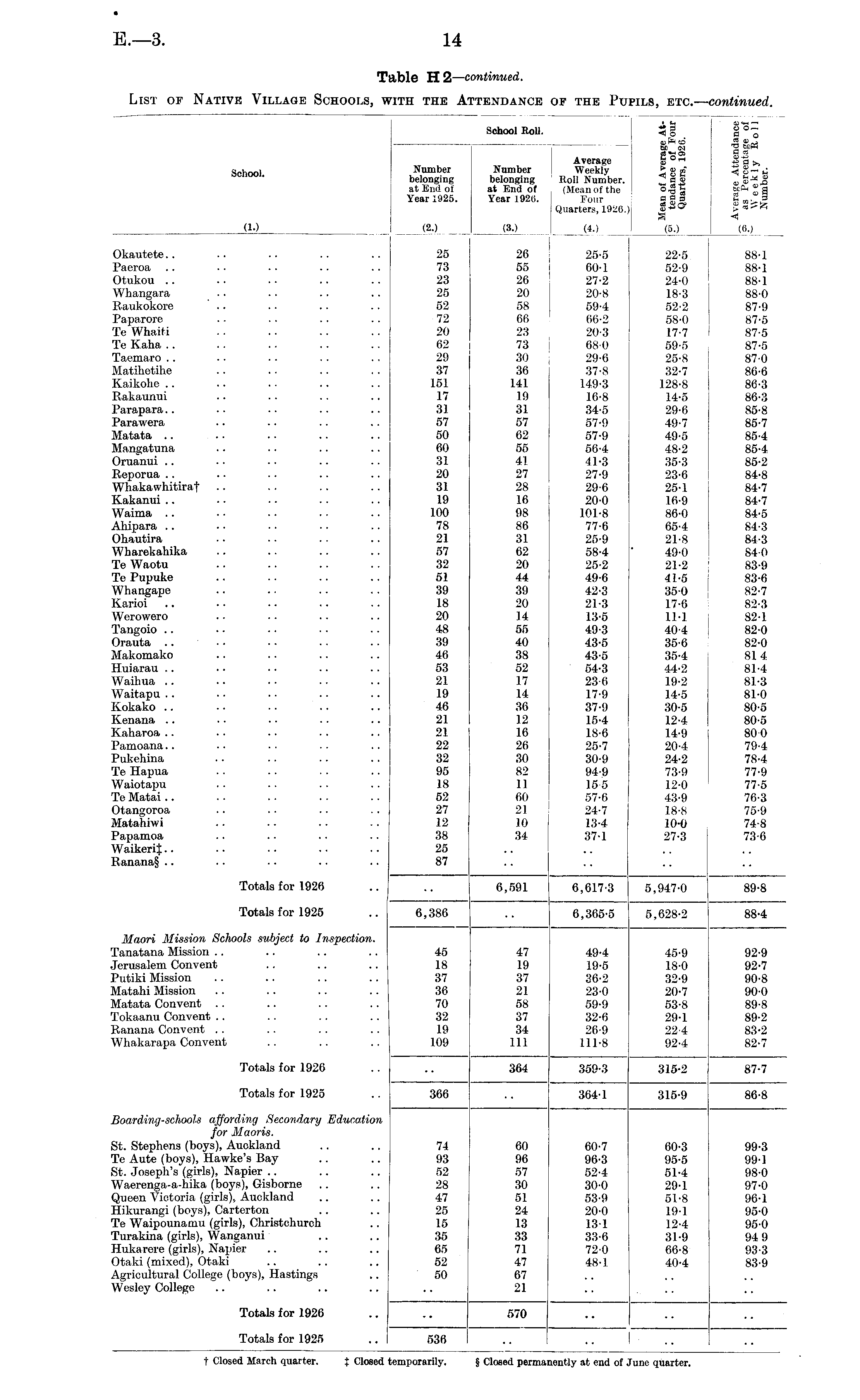 School fioll. i | i5 ® £j £ '^ Average § °S g a >, School Number Number Weekly > g m u belonging belonging Roll Number. at End of at End of (Mean of the ° •§ 1 a Year 1925. Year 192(5. Four g g a |»"| Quarters, 1926.) ®' uCy > S <S OO (2.) (80 (40 (50 (60 Okautete.. .. .. .. .. 25 26 25-5 22-5 88-1 Paeroa .. .. .. .. .. 73 55 60-1 52-9 88-1 Otukou .. .. .. .. .. 23 26 27-2 24-0 88-1 Whangara .. .. .. .. 25 20 20-8 18-3 88-0 Raukokore .. .. .. .. 52 58 59-4 52-2 87-9 Paparore .. .. .. .. 72 66 66-2 58-0 87-5 Te Whaiti .. .. .. .. 20 23 20-3 17-7 87-5 Te Kaha .. .. .. .. .. 62 73 I 68-0 59-5 87-5 Taemaro .. .. .. .. .. 29 30 29-6 25-8 87-0 Matihetihe .. .. .. .. 37 36 37-8 32-7 86-6 Kaikohe .. .. .. .. .. 151 141 149-3 128-8 86-3 Rakaunui .. •. . ■ .. 17 19 16-8 14-5 86-3 Parapara.. .. .. .. .. 31 31 34-5 29-6 85-8 Parawera .. .. .. .. 57 57 57-9 49-7 85-7 Matata .. .. . . .. .. 50 62 57-9 49-5 85-4 Mangatuna .. .. .. .. 60 55 56-4 48-2 85-4 Oruanui .. .. .. .. .. 31 41 41-3 35-3 85-2 Reporua .. .. .. .. .. 20 27 27-9 23-6 84-8 Whakawhitiraf .. .. .. . . 31 28 29-6 25-1 84-7 Kakanui .. .. .. .. .. 19 16 20-0 16-9 84-7 Waima .. • • .. .. . . 100 98 101-8 86-0 84-5 Ahipara .. .. .. .. . . 78 86 77-6 65-4 84-3 Ohautira .. .. .. .. 21 31 25-9 21-8 84-3 Wharekahika .. .. .. .. 57 62 58-4 ' 49-0 84 0 Te Waotu .. .. .. .. 32 20 25-2 21-2 83-9 Te Pupuke .. .. .. .. 51 44 49-6 41-5 83-6 Whangape .. .. .. .. 39 39 42-3 35 0 82-7 Karioi .. • • • • •. .. 18 20 21-3 17-6 82-3 Werowero .. .. .. .. 20 14 13-5 11-1 82-1 Tangoio .. • ■ • • • ■ .. 48 55 49-3 40-4 82-0 Orauta .... .. .. .. 39 40 43-5 35-6 82-0 Makomako .. .. .. .. 46 38 43-5 35-4 814 Huiarau .. .. .. .. .. 53 52 54-3 44-2 81-4 Waihua .. .. .. .. .. 21 17 23-6 19-2 81-3 Waitapu .. .. .. . . .. 19 14 17-9 14-5 81-0 Kokako .. •• •• •• .. 46 36 37-9 30-5 80-5 Kenana .. .. .. .. .. 21 12 15-4 12-4 80-5 Kaharoa .. .. .. .. .. 21 16 18-6 14-9 80 0 Pamoana.. .. .. .. .. 22 26 25-7 20-4 79-4 Pukehina . • .. .. .. 32 30 30-9 24-2 78-4 Te Hapua .. .. .. .. 95 82 94-9 73-9 77-9 Waiotapu .. .. .. .. 18 11 15 5 12-0 ! 77-5 Te Matai.. .. .. .. .. 52 60 57-6 43-9 76-3 Otangoroa .. .. .. .. 27 21 24-7 18-8 75-9 Matahiwi .. .. .. .. 12 10 13-4 10-0 74-8 Papamoa .. .. .. .. 38 34 37-1 27-3 73-6 WaikeriJ.. .. .. .. .. 25 Ranana§ .. .. .. .. .. 87 Totals for 1926 .. .. 6,591 6,617-3 5,947-0 89-8 Totals for 1925 .. 6,386 .. 6,365-5 5,628-2 88-4 Maori Mission Schools subject to Inspection. Tanatana Mission .. .. .. .. 45 47 49-4 45-9 92-9 Jerusalem Convent .. .. .. 18 19 19-5 18-0 92-7 Putiki Mission .. .. . . .. 37 37 36-2 32-9 90-8 Matahi Mission .. .. .. .. 36 21 23-0 20-7 90-0 Matata Convent .. .. .. .. 70 58 59-9 53-8 89-8 Tokaanu Convent .. .. .. .. 32 37 32-6 29-1 89-2 Ranana Convent .. .. .. .. 19 34 26-9 22-4 83-2 Whakarapa Convent .. .. .. 109 111 111-8 92-4 82-7 Totals for 1926 .. .. 364 359-3 315-2 87-7 Totals for 1925 .. 366 .. 364-1 315-9 86-8 Boarding-schools affording Secondary Education for Maoris. St. Stephens (boys), Auckland .. .. 74 60 60-7 60-3 99-3 Te Aute (boys), Hawke's Bay .. .. 93 96 96-3 95-5 99-1 St. Joseph's (girls), Napier .. .. .. 52 57 52-4 51-4 98-0 Waerenga-a-hika (boys), Gisborne .. .. 28 30 30-0 29-1 97-0 Queen Victoria (girls), Auckland .. .. 47 51 53-9 51-8 96-1 Hikurangi (boys), Carterton .. .. 25 24 20-0 19-1 95-0 Te Waipounamu (girls), Christchurch .. 15 13 13-1 12-4 95-0 Turakina (girls), Wanganui .. .. 35 33 33-6 31-9 94 9 Hukarere (girls), Napier .. .. .. 65 71 72-0 66-8 93-3 Otaki (mixed), Otaki .. .. .. 52 47 48-1 40-4 83-9 Agricultural College (boys), Hastings .. 50 67 Wesley College .. .. .. .. .. 21 .. Totals for 1926 .. .. 570 Totals for 1925 .. 536 .. .. I t Closed March quarter. X Closed temporarily. § Closed permanently at end of June quarter.