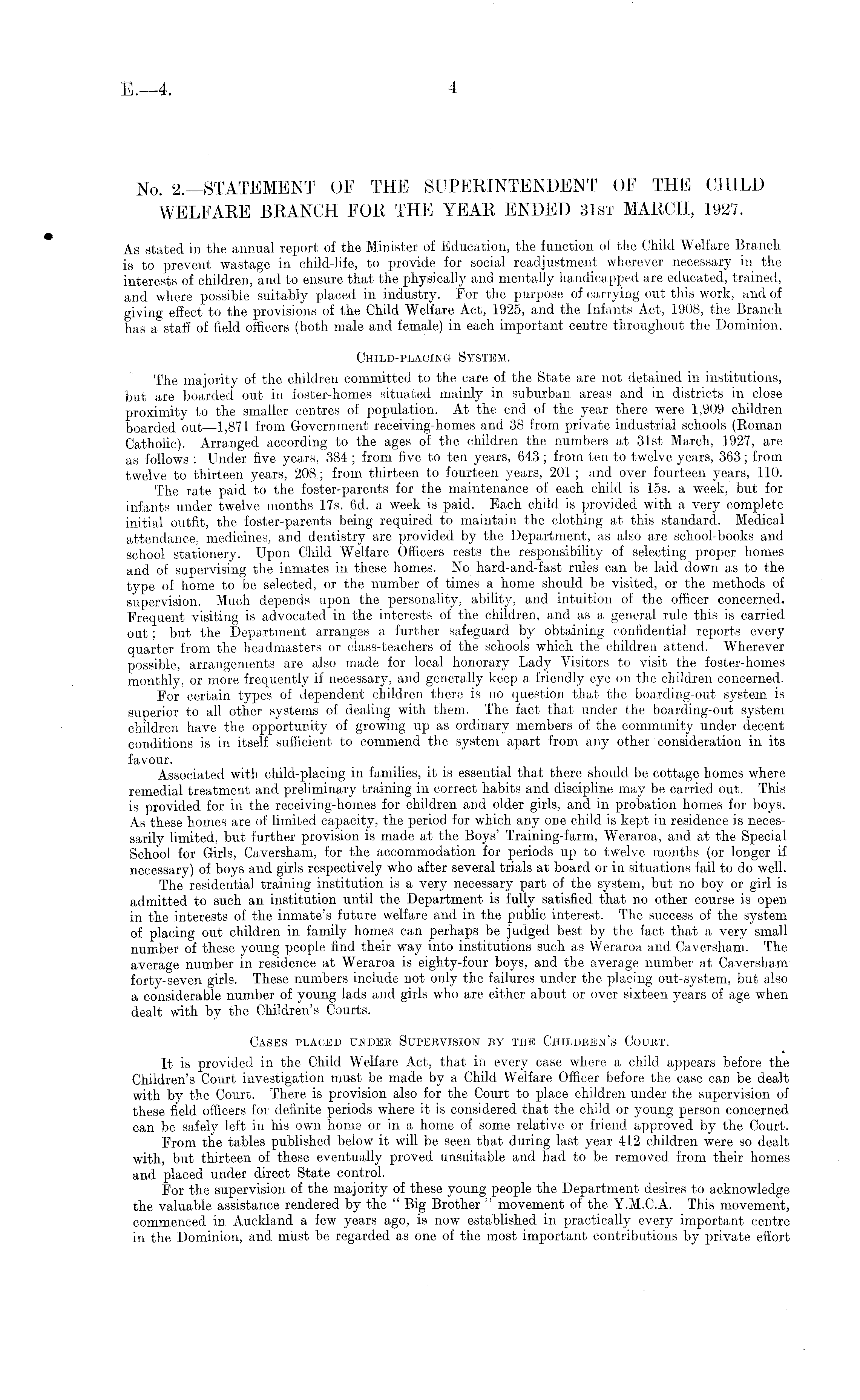 No. 2.—STATEMENT OF THE SUPERINTENDENT OF THE CHILD WELFARE BRANCH FOR THE YEAR ENDED 31st MARCH, 1927. As stated in the annual report of the Minister of Education, the function of the Child Welfare Branch is to prevent wastage in child-life, to provide for social readjustment wherever necessary in the interests of children, and to ensure that the physically and mentally handicapped are educated, trained, and where possible suitably placed in industry. For the purpose of carrying out this work, and of giving effect to the provisions of the Child Welfare Act, 1925, and the Infants Act, 1908, the Branch has a staff of field officers (both male and female) in each important centre throughout the Dominion. Child-placing System. The majority of the children committed to the care of the State are not detained in institutions, but are boarded out in foster-homes situated mainly in suburban areas and in districts in close proximity to the smaller centres of population. At the end of the year there were 1,909 children boarded out —1,871 from Government receiving-homes and 38 from private industrial schools (Roman Catholic). Arranged according to the ages of the children the numbers at 31st March, 1927, are as follows : Under five years, 384; from five to ten years, 643; from ten to twelve years, 363; from twelve to thirteen years, 208 ; from thirteen to fourteen years, 201 ; and over fourteen years, 110. The rate paid to the foster-parents for the maintenance of each child is 15s. a week, but for infants under twelve months 17s. 6d. a week is paid. Each child is provided with a very complete initial outfit, the foster-parents being required to maintain the clothing at this standard. Medical attendance, medicines, and dentistry are provided by the Department, as also are school-books and school stationery. Upon Child Welfare Officers rests the responsibility of selecting proper homes and of supervising the inmates in these homes. No hard-and-fast rules can be laid down as to the type of home to be selected, or the number of times a home should be visited, or the methods of supervision. Much depends upon the personality, ability, and intuition of the officer concerned. Frequent visiting is advocated in the interests of the children, and as a general rule this is carried out; but the Department arranges a further safeguard by obtaining confidential reports every quarter from the headmasters or class-teachers of the schools which the children attend. Wherever possible, arrangements are also made for local honorary Lady Visitors to visit the foster-homes monthly, or more frequently if necessary, and generally keep a friendly eye on the children concerned. For certain types of dependent children there is no question that the boarding-out system is superior to all other systems of dealing with them. The fact that under the boarding-out system children have the opportunity of growing up as ordinary members of the community under decent conditions is in itself sufficient to commend the system apart from any other consideration in its favour. Associated with child-placing in families, it is essential that there should be cottage homes where remedial treatment and preliminary training in correct habits and discipline may be carried out. This is provided for in the receiving-homes for children and older girls, and in probation homes for boys. As these homes are of limited capacity, the period for which any one child is kept in residence is necessarily limited, but further provision is made at the Boys' Training-farm, Weraroa, and at the Special School for Girls, Caversham, for the accommodation for periods up to twelve months (or longer if necessary) of boys and girls respectively who after several trials at board or in situations fail to do well. The residential training institution is a very necessary part of the system, but no boy or girl is admitted to such an institution until the Department is fully satisfied that no other course is open in the interests of the inmate's future welfare and in the public interest. The success of the system of placing out children in family homes can perhaps be judged best by the fact that a very small number of these young people find their way into institutions such as Weraroa and Caversham. The average number in residence at Weraroa is eighty-four boys, and the average number at Caversham forty-seven girls. These numbers include not only the failures under the placing out-system, but also a considerable number of young lads and girls who are either about or over sixteen years of age when dealt with by the Children's Courts. Cases placed under Supervision by the Children's Court. It is provided in the Child Welfare Act, that in every case where a child appears before the Children's Court investigation must be made by a Child Welfare Officer before the case can be dealt with by the Court. There is provision also for the Court to place children under the supervision of these field officers for definite periods where it is considered that the child or young person concerned can be safely left in his own home or in a home of some relative or friend approved by the Court. From the tables published below it will be seen that during last year 412 children were so dealt with, but thirteen of these eventually proved unsuitable and had to be removed from their homes and placed under direct State control. For the supervision of the majority of these young people the Department desires to acknowledge the valuable assistance rendered by the " Big Brother " movement of the Y.M.C.A. This movement, commenced in Auckland a few years ago, is now established in practically every important centre in the Dominion, and must be regarded as one of the most important contributions by private effort