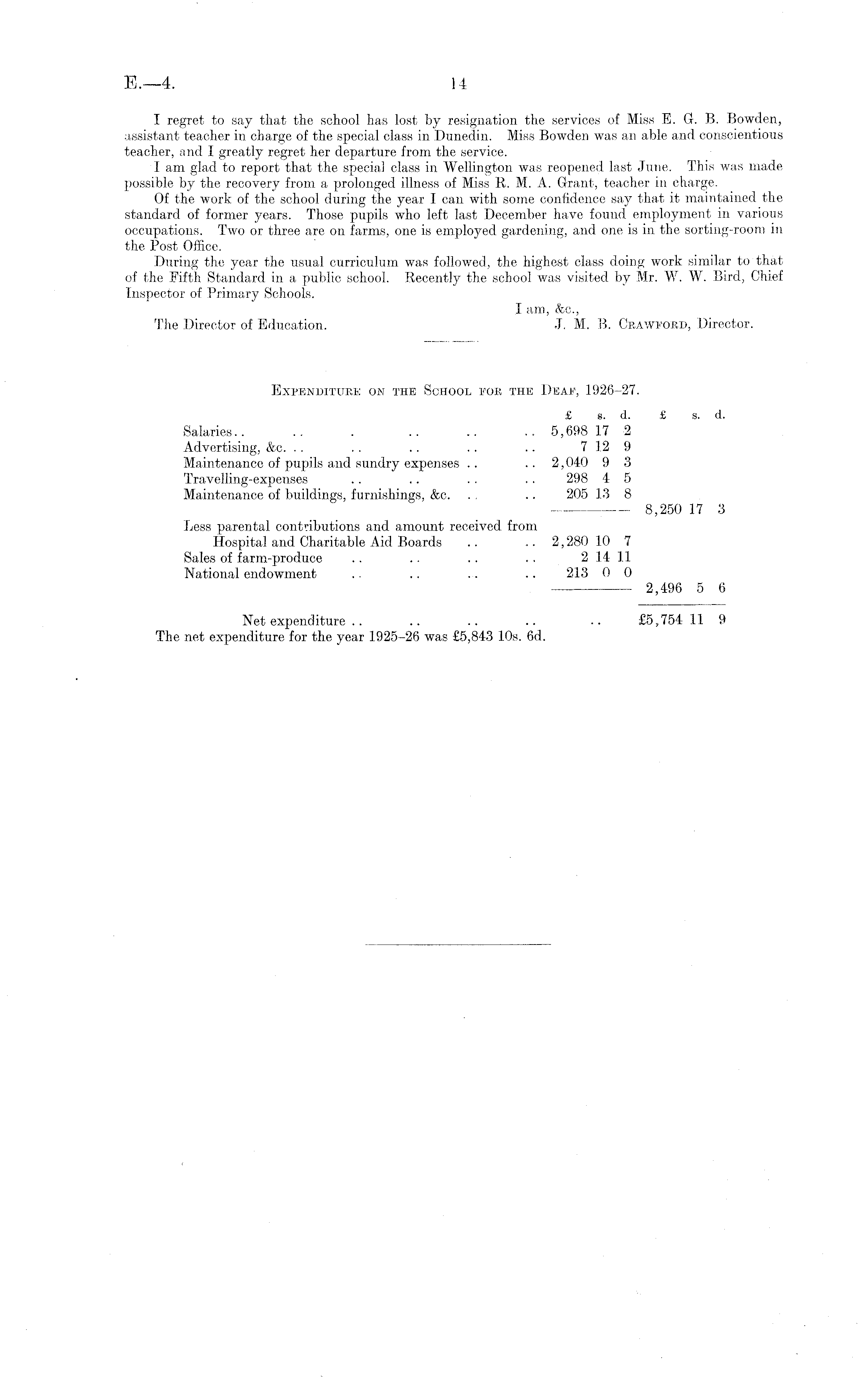 I regret to say that the school has lost by resignation the services of Miss E. G. B. Bowden, assistant teacher in charge of the special class in Dunedin. Miss Bowden was an able and conscientious teacher, and I greatly regret her departure from the service. lam glad to report that the special class in Wellington was reopened last June. This was made possible by the recovery from a prolonged illness of Miss R. M. A. Grant, teacher in charge. Of the work of the school during the year I can with some confidence say that it maintained the standard of former years. Those pupils who left last December have found employment in various occupations. Two or three are on farms, one is employed gardening, and one is in the sorting-room in the Post Office. During the year the usual curriculum was followed, the highest class doing work similar to that of the Fifth Standard in a public school. Recently the school was visited by Sir. W. W. Bird, Chief Inspector of Primary Schools. I am, &c., The Director of Education. J. M. B. Crawfobd, Director. Expenditure on the School foe the Deaf, 1926-27. £ s. d. £ s. d. Salaries.. .. . .. .. .. 5,698 17 2 Advertising, &c. .. .. .. .. .. 7 12 9 Maintenance of pupils and sundry expenses .. 2,040 9 3 Travelling-expenses .. .. .. .. 298 4 5 Maintenance of buildings, furnishings, &c. . .. 205 13 8 8,250 17 3 Less parental contributions and amount received from Hospital and Charitable Aid Boards .. .. 2, 280 10 7 Sales of farm-produce .. .. . . .. 2 14 11 National endowment .. .. .. .. 213 0 0 2,496 5 6 Net expenditure .. .. .. .. £5,754 11 9 The net expenditure for the year 1925-26 was £5,843 10s. 6d.