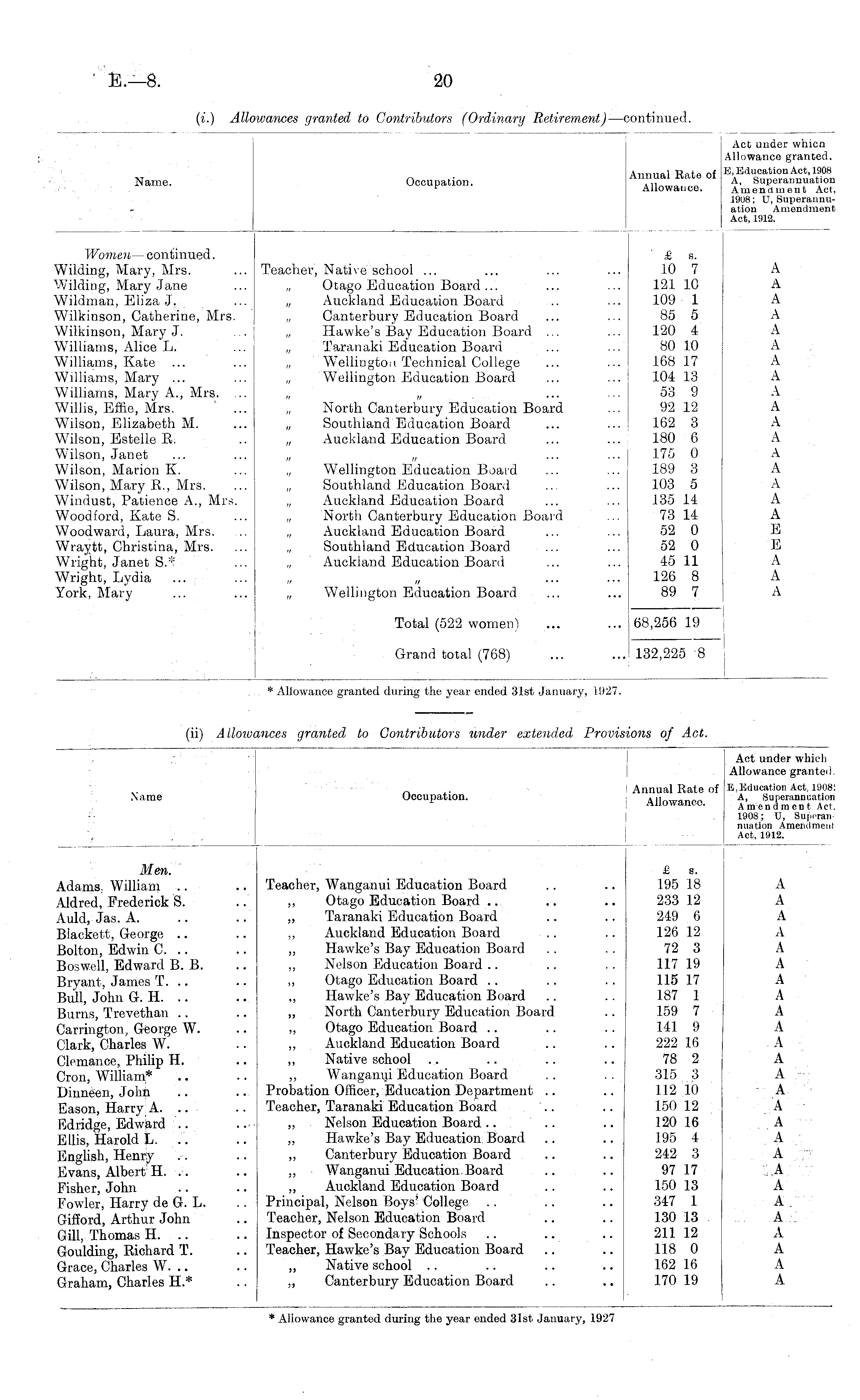 I Act under which i Allowance granted. Annual Rate of E.Education Act, 1908: Name Uccupation. A M nmn „ nn A, Superannuation Allowance. Amendment Act, - j 19Q8,; TJ, Suporan nuation Amendment J Act, 1912. Men. £ s. Adams ; William .. .. Teacher, Wanganui Education Board .. .. 195 18 A Aldred, Frederick S. .. ,, Otago Education Board .. .. .. 233 12 A Auld, Jas. A. .. .. ,j Taranaki Education Board .. .. 249 6 A Blackett, George .. .. „ Auckland Education Board .. .. 126 12 A Bolton, Edwin C. .. .. ,, Hawke's Bay Education Board .. .. 72 3 A Boswell, Edward B. B. .. „ Nelson Education Board .. .. . . 117 19 A Bryant, James T. .. .. ,, Otago Education Board .. .. .. 115 17 A Bull, John G. H. .. .. „ Hawke's Bay Education Board .. .. 187 1 A Burns, Trevethan .. .. ,, North Canterbury Education Board .. 159 7 A Camngton, George W. .. „ Otago Education Board .. .. .. 141 9 A Clark, Charles W. • • ,, Auckland Education Board .. .. 222 16 A Clemance, Philip H. ... „ Native school .. .. .. .. 78 2 A Cron, William* .. .. ,, Wanganui Education Board. .. .. 315 3 A Dinneen, John .. .. Probation Officer, Education Department .. .. 112 10 A Eason, Harry A. .. .. Teacher, Taranaki Education Board .. .. 150 12 A Edridge, Edward .. „ Nelson Education Board.. .. .. 120 16 A Ellis, Harold L. .. .. ,, Hawke's Bay Education Board .. .. 195 4 A English, Henry .. .. ,, Canterbury Education Board .. .. 242 3 A Evans, Albert 1 H. .. „ Wanganui Education. Board .. .. 97 17 A Fisher, John .. .. ,, Auckland Education Board .. .. 150 13 A Fowler, Harry de G. L. .. Principal, Nelson Bays' College .. .. .. 347 1 A. Gifiord, Arthur John .. Teacher, Nelson Education Board .. .. 130 13 A Gill, Thomas H. .. .. Inspector of Secondary Schools .. .. .. 211 12 A Goulding, Richard T. ., Teacher, Hawke's Bay Education Board .. .. 118 0 A Grace, Charles W. .. .. „ Native school .. .. .. .. 162 16 A Graham, Charles H.* .. „ Canterbury Education Board .. .. 170 19 A * Allowance granted during the year ended 31st January, 1927