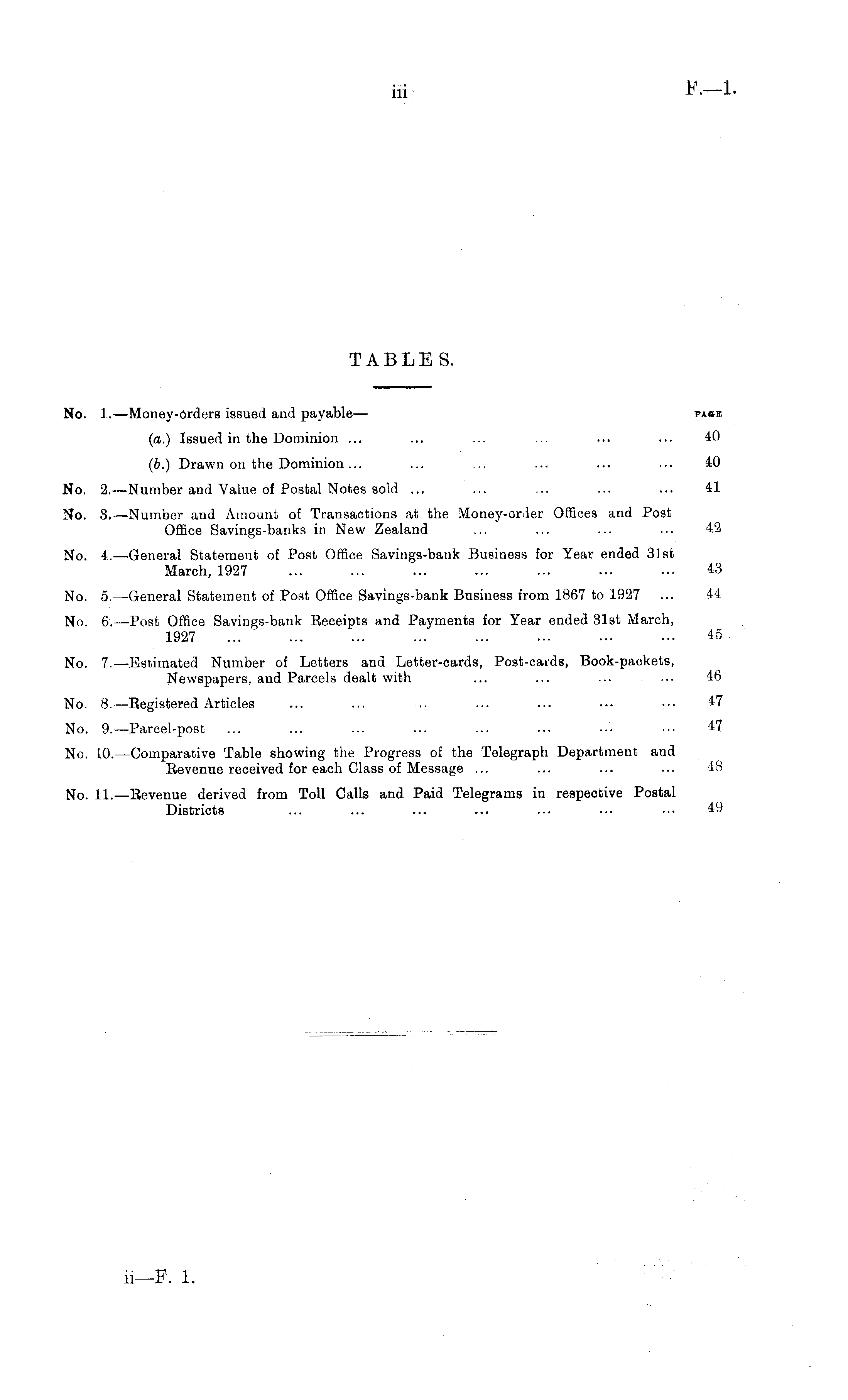 TABLE S. No. I.—Money-orders issued and payable— pase (a.) Issued in the Dominion ... ... ... ... ... 40 (b.) Drawn on the Dominion ... ... ... ... ... ... 40 No. 2.—Number and Value of Postal Notes sold ... ... ... ... ... 41 No. 3. —Number and Amount of Transactions at the Money-order Offices and Post Office Savings-banks in New Zealand ... ... ... ... 42 No. 4.—General Statement of Post Office Savings-bank Business for Year ended 31st March, 1927 ... ... ... ... ... ... ... 43 No. 5. —General Statement of Post Office Savings-bank Business from 1867 to 1927 ... 44 No. 6. —Post Office Savings-bank Receipts and Payments for Year ended 31st March, 1927 45 No. 7.—Estimated Number of Letters and Letter-cards, Post-cards, Book-packets, Newspapers, and Parcels dealt with ... ... ... ... 46 No. 8. —Registered Articles ... ... ... ... ... ••• 47 No. 9.—Parcel-post ... ... ... ... ... ... 47 No. 10. —Comparative Table showing the Progress of the Telegraph Department and Revenue received for each Class of Message ... ... ... ... 48 No. 11. —Revenue derived from Toll Calls and Paid Telegrams in respective Postal Districts ... ... ... ... ... ... ••• 49