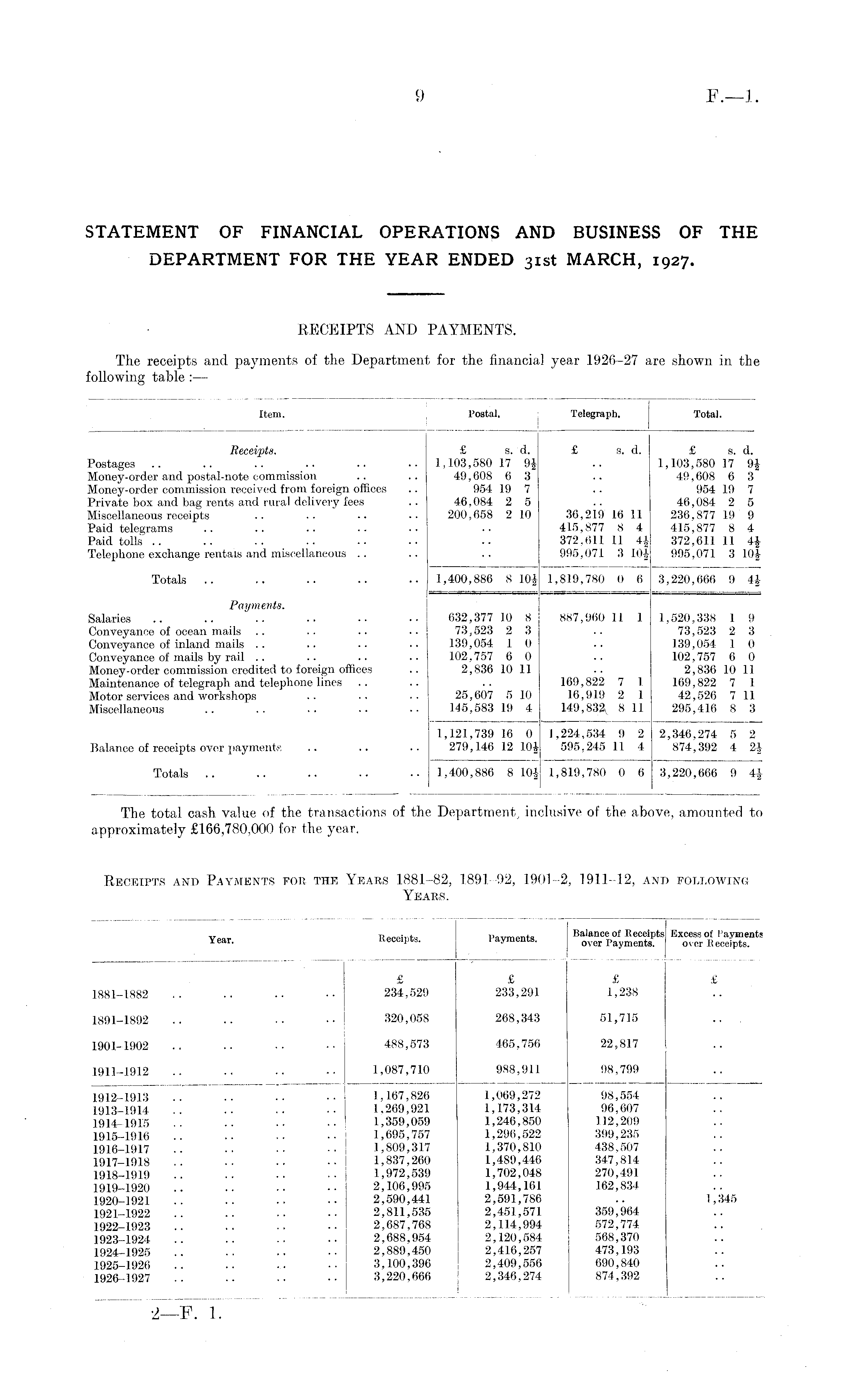 Item. Postal. Telegraph. Total. Receipts. £ s. d. £ s. d. £ s. d. Postages .. .. .. .. .. •• 1,103,580 17 9£ .. 1,103,580 17 9J Money-order and postal-note commission .. .. 49,608 6 3 .. 49,608 6 3 Money-order commission received from foreign offices .. 954 19 7 .. 954 19 7 Private box and bag rents and rural, delivery fees .. 46,084 2 5 .. 46,084 2 5 Miscellaneous receipts .. .. .. .. 200,658 2 10 36,219 16 11 236,877 19 9 Paid telegrams .. .. .. •• •• •• 415,877 8 4 415,877 8 4 Paid tolls .. .. .. .. .. .. .. 372,611 11 4£ 372,611 11 4£ Telephone exchange rentals and miscellaneous .. .. .. 995,071 3 995,071 3 10i Totals .. .. .. .. .. 1,400,886 8 10 b 1,819,780 0 6 3,220,666 9 4£ Payments. Salaries .. .. .. .. •• •• 632,377 10 8 887,960 11 1 1,520,338 1 9 Conveyance of ocean mails .. .. .. .. 73,523 2 3 .. 73,523 2 3 Conveyance of inland mails .. .. .. .. 139,054 1 0 .. 139,054 1 0 Conveyance of mails by rail .. .. .. .• 102,757 6 0 .. 102,757 6 0 Money-order commission credited to foreign offices .. 2,836 10 11 .. 2,836 10 11 Maintenance of telegraph and telephone lines .. .. .. 169,822 7 1 169,822 7 1 Motor services and workshops .. .. •• 25,607 5 10 16,919 2 1 42,526 7 11 Miscellaneous .. .. .. .. .. 145,583 19 4 149,832, 8 11 295,416 8 3 1,121,739 16 0 1,224,534 9 2 2,346,274 5 2 Balance of receipts over payments .. .. •• 279,146 12 10J 595,245 11 4 874,392 4 2^ Totals .. .. .. .. •• 1,400,886 8 10i 1,819,780 0 6 3,220,666 9 4£ The total cash value of the transactions of the Department, inclusive of the above, amounted to approximately £166,780,000 for the year.