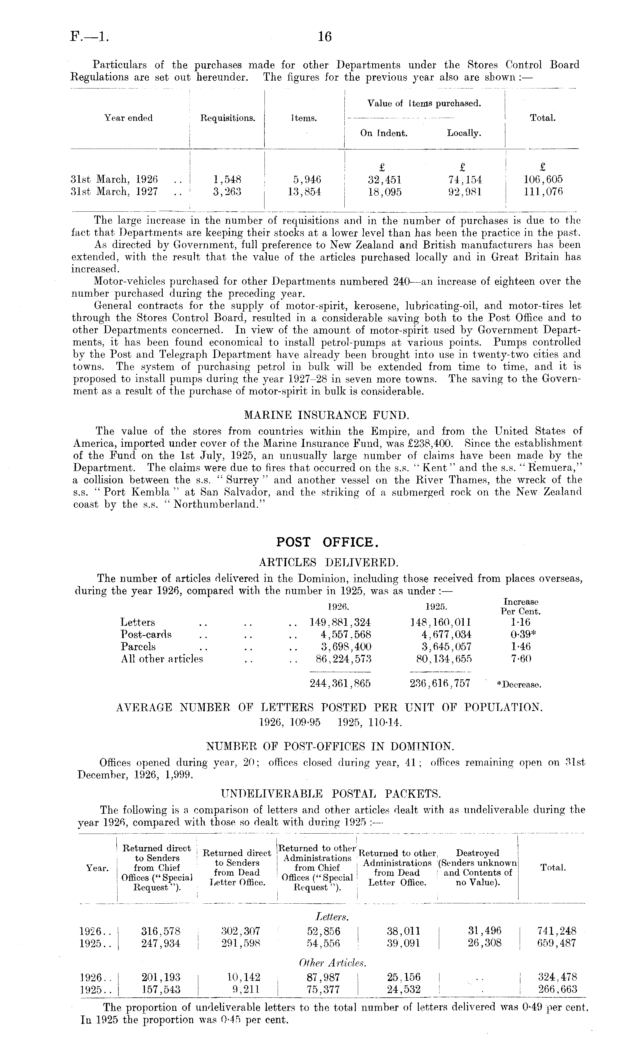 The large increase in the number of requisitions and in the number of purchases is due to the fact that Departments are keeping their stocks at a lower level than has been the practice in the past. As directed by Government, full preference to New Zealand and British manufacturers has been extended, with the result that the value of the articles purchased locally and in Great Britain has increased. Motor-vehicles purchased for other Departments numbered 240 —an increase of eighteen over the number purchased during the preceding year. General contracts for the supply of motor-spirit, kerosene, lubricating-oil, and motor-tires let through the Stores Control Board, resulted in a considerable saving both to the Post Office and to other Departments concerned. In view of the amount of motor-spirit used by Government Departments, it has been found economical to install petrol-pumps at various points. Pumps controlled by the Post and Telegraph Department have already been brought into use in twenty-two cities and towns. The system of purchasing petrol in bulk will be extended from time to time, and it is proposed to install pumps during the year 1927-28 in seven more towns. The saving to the Government as a result of the purchase of motor-spirit in bulk is considerable. MARINE INSURANCE FUND. The value of the stores from countries within the Empire, and from the United States of America, imported under cover of the Marine Insurance Fund, was £238,400. Since the establishment of the Fund on the Ist July, 1925, an unusually large number of claims have been made by the Department. The claims were due to fires that occurred on the s.s. " Kent" and the s.s. " Remuera," a collision between the s.s. "Surrey" and another vessel on the River Thames, the wreck of the s.s. " Port Kembla " at San Salvador, and the striking of a submerged rock on the New Zealand coast by the s.s. " Northumberland." POST OFFICE. ARTICLES DELIVERED. The number of articles delivered in the Dominion, including those received from places overseas, during the year 1926, compared with the number in 1925, was as under : — mofl mor Increase 1926 ' 1925 " Per Cent. Letters .. .. .. 149.881,324 148,160,011 1-16 Post-cards .. .. .. 4,557.568 4,677,034 0-39* Parcels .. .. .. 3,698,400 3,645,057 1-46 All other articles .. .. 86,224,573 80,134,655 7-60 244,361,865 236,616,757 *Decrease. AVERAGE NUMBER OF LETTERS POSTED PER UNIT OF POPULATION. 1926, 109-95 1925, 110-14. NUMBER OF POST-OFFICES IN DOMINION. Offices opened during year, 20; offices closed during year, 41; offices remaining open on 31st December, 1926, 1,999. UNDELIVERABLE POSTAL PACKETS. The following is a comparison of letters and other articles dealt with as undeliverable during the year 1926, compared with those so dealt with during 1925 : —