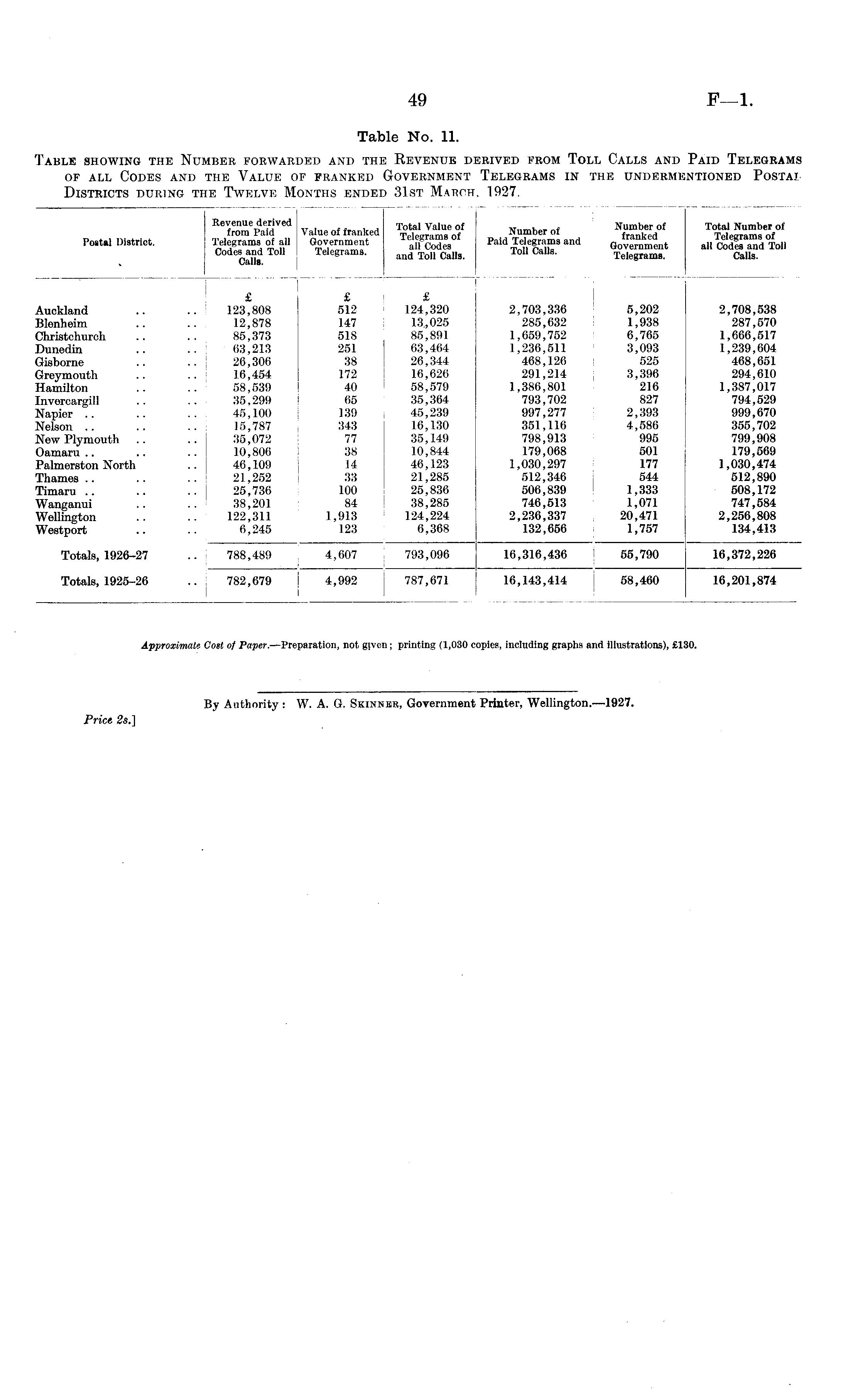 Table No. 11. Table showing the Number forwarded and the Revenue derived from Toll Calls and Paid Telegrams of all Codes and the Value of franked Government Telegrams in the undermentioned Postal. Districts during the Twelve Months ended 31st March, 1927.