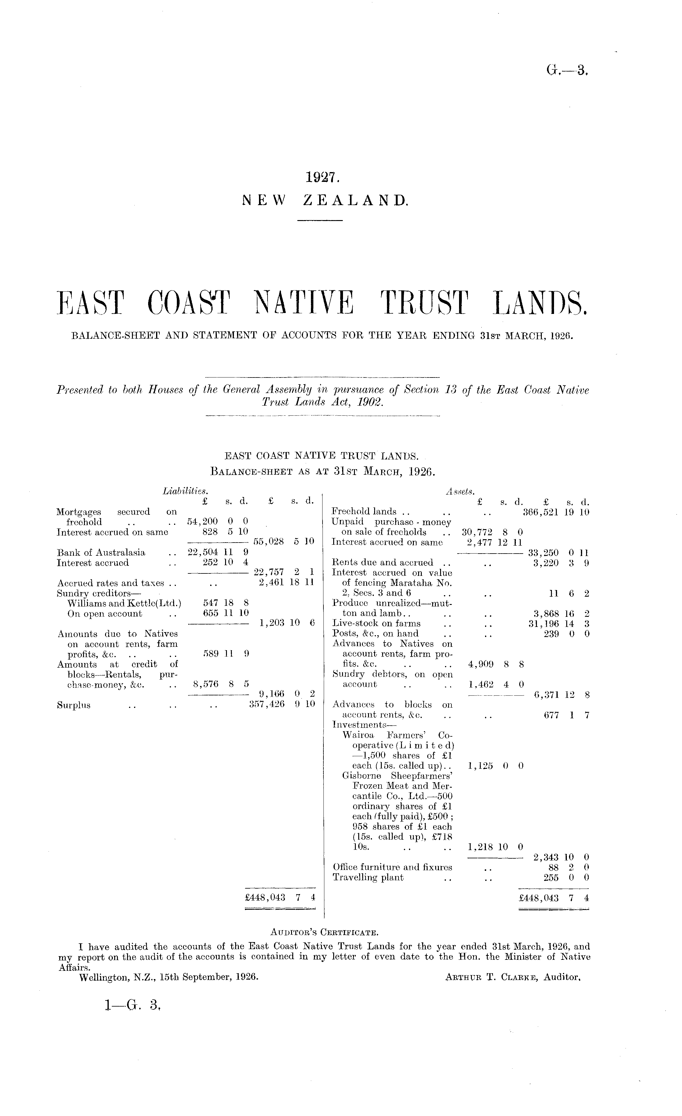 EAST COAST NATIVE TRUST LANDS. Balance-sheet as at 31st March, 1926. Liabilities. Assets. £ s. d. £ s. d. £ a. d. £ s. d. Mortgages secured on Freehold lands .. .. .. 366,521 19 10 freehold .. .. 54,200 0 0 Unpaid purchase - money Interest accrued on same 828 510 on sale of freeholds .. 30,772 8 0 55,028 510 Interest accrued on same 2,477 12 11 Bank of Australasia .. 22,504 11 9 33,250 011 Interest accrued .. 252 10 4 Rents due and accrued .. .. 3,220 3 9 22,757 2 1 Interest accrued on value Accrued rates and taxes .. .. 2,461 18 11 of fencing Marataha No. Sundry creditors— 2, Sees. 3 and 6 .. .. 116 2 Williams and Kettle(Ltd.) 547 18 8 Produce unrealized—rnutOn open account .. 655 11 10 ton and lamb.. .. .. 3,868 16 2 1,203 10 6 Live-stock on farms .. .. 31,196 14 3 Amounts due to Natives Posts, &c., on hand .. .. 239 0 0 on account rents, farm Advances to Natives on profits, &c. .. .. 589 11 9 account rents, farm proAmounts at credit of fits. &c. .. .. 4,909 8 8 blocks —Rentals, pur- Sundry debtors, on open chase-money, &e. .. 8,576 8 5 account .. .. 1,462 4 0 9,166 0 2 6,371 12 8 Surplus .. .. .. 357,426 910 Advances to blocks on account rents, &c. .. .. 677 I 7 Investments— Wairoa Farmers' Cooperative (Limited) —1,500 shares of £1 each (15s. called up).. 1,125 0 0 Gisborne Sheepfarmers' Frozen Meat and Mercantile Co., Ltd.—soo ordinary shares of £1 each (fully paid), £500 ; 958 shares of £1 each (15s. called up), £718 10s. .. .. 1.218 10 0 2,343 10 0 Office furniture and fixures .. 88 2 0 Travelling plant .. .. 255 0 0 £448,043 7 4 £448,043 7 4 Auditor's Certificate. I have audited the accounts of the East Coast Native Trust Lands for the year ended 31st March, 1926, and my report on the audit of the accounts is contained in my letter of even date to the Hon. the Minister of Native Affairs. Wellington, N.Z., 15th September, 1926. Arthur T. Clarke, Auditor,