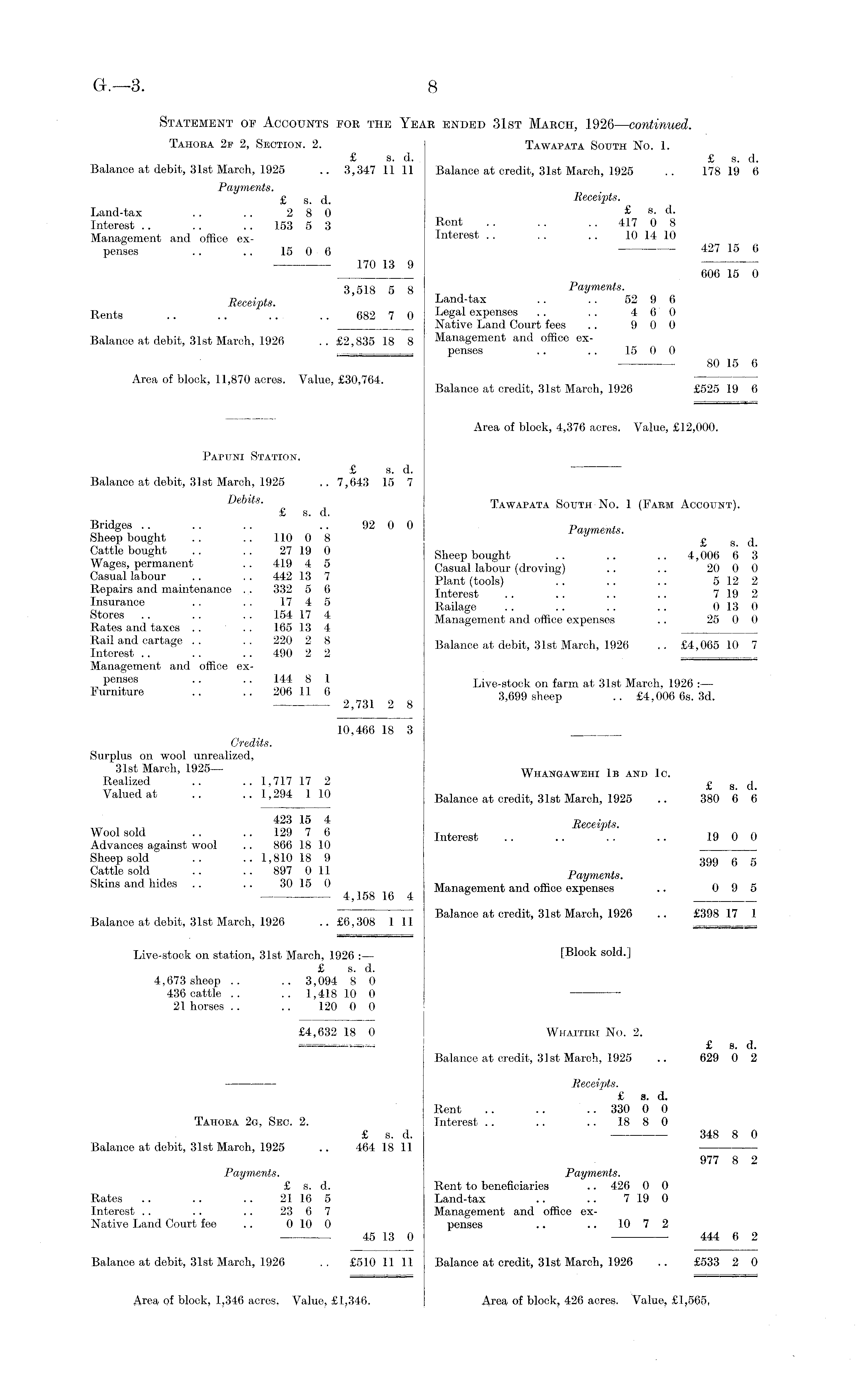 Statement of Accounts for the Year ended 31st March, 1926—continued. Tahora 2f 2, Section. 2. Tawapata South No. 1. £ s. d. £ s. d. Balance at debit, 31st March, 1925 .. 3,347 11 11 Balance at credit, 31st March, 1925 .. 178 19 6 Payments. £ s. d. Receipts. Land-tax .... 2 8 0 £ s. d. Interest .. .. .. 153 5 3 Rent • • • ■ • ■ 417 0 8 Management and office ex- Interest .. .. .. 10 14 10 penses .. .. 15 0 6 427 15 6 170 13 9 606 15 0 3,518 5 8 T , Payments. Receipts. Land-tax .. .. 52 9 6 Rents .. .. .. .. 682 7 0 Le S al expenses . . .. 4 6 0 Native Land Court fees .. 9 0 0 Balance at debit, 31st March. 1926 .. £2,835 18 8 Management and office expenses .. .. 15 0 0 80 15 6 Area of block, 11,870 acres. Value, £30,764. „ , Balance at credit, 31st March, 1926 £525 19 6 Area of block, 4,376 acres. Value, £12,000. Papuni Station. £ s. d. Balance at debit, 31st March, 1925 .. 7,643 15 7 Debits. Tawapata South No. 1 (Farm Account). £ s. d. ?u idg6 f '• '■ o"o 92 0 0 Payments. Sheep bought .. .. 110 0 8 £ s d Cattle bought .. .. 27 19 0 Sheep bought 4,006 6 3 Wages, permanent .. 419 4 5 Casual labour (droving) .. .. 20 0 0 Casual labour . . 442 13 7 plant (toolg) 6 5\2 2 Kepairs and maintenance ... 332 5 6 Interest 719 2 Insurance .. .. 17 4 5 RaUage " " " " 013 0 btores . . .. .. 154 17 4 Management and office expenses .. 25 0 0 Rates and taxes .... 165 13 4 s F Rail and cartage .. .. 220 2 8 Balance at debit, 31st March, 1926 .. £4,065 10 7 Interest .. . . .. 490 2 2 = _ = _ ==== __ Management and office ex„P en ® es ■' }*f. , ? I Live-stock on farm at 31st March, 1926 Furniture .. .. 206 11 6 3,699 sheep .. £4,006 6s. 3d. 2,ioi 2 8 10,466 18 3 Credits. Surplus on wool unrealized, 31st March, 1925 , Whangawehi 1b and lc. Realized .. .. 1,717 17 2 £ s. d. Valued at .. .. 1,294 110 Balance at credit, 31st March, 1925 .. 380 6 6 ,tt , ~ *5 t Receipts. Wool sold .. .. 129 7 6 Interest 19 0 0 Advances against wool .. 866 18 10 .... Sheep sold .. .. 1,810 18 9 ggg 0 g Cattle sold .. .. 897 011 Payments. Skins and hides .. .. 30 15 0 Management and office expenses .. 0 9 5 4,158 16 4 ~~~ 777 Balance at credit, 31st March, 1926 .. £398 17 1 Balance at debit, 31st March, 1926 .. £6,308 1 11 Live-stock on station, 31st March, 1926 :— [Block sold.] £ s. d. 4,673 sheep .. .. 3,094 8 0 436 cattle .. .. 1,418 10 0 21 horses .. .. 120 0 0 £4,632 18 0 Whaitiri No. 2. «==—=— £ s. d. Balance at credit, 31st March, 1925 .. 629 0 2 Receipts. £ 8. d. Rent .. .. .. 330 0 0 Tahora 2g, Sec. 2. Interest .. .. .. 18 8 0 £ s. d. 348 8 0 Balance at debit, 31st March, 1925 .. 464 18 11 977 8 2 Payments. Payments. £ s. d. Rent to beneficiaries .. 426 0 0 Rates .. .. .. 21 16 5 Land-tax .. .. 7 19 0 Interest .. .. .. 23 6 7 Management and office exNative Land Court fee .. 0 10 0 penses .. .. 10 7 2 45 13 0 444 6 2 Balance at debit, 31st March, 1926 .. £510 11 11 Balance at credit, 31st March, 1926 .. £533 2 0 Area of block, 1,346 acres. Value, £1,346. Area of block, 426 acres. Value, £1,565,