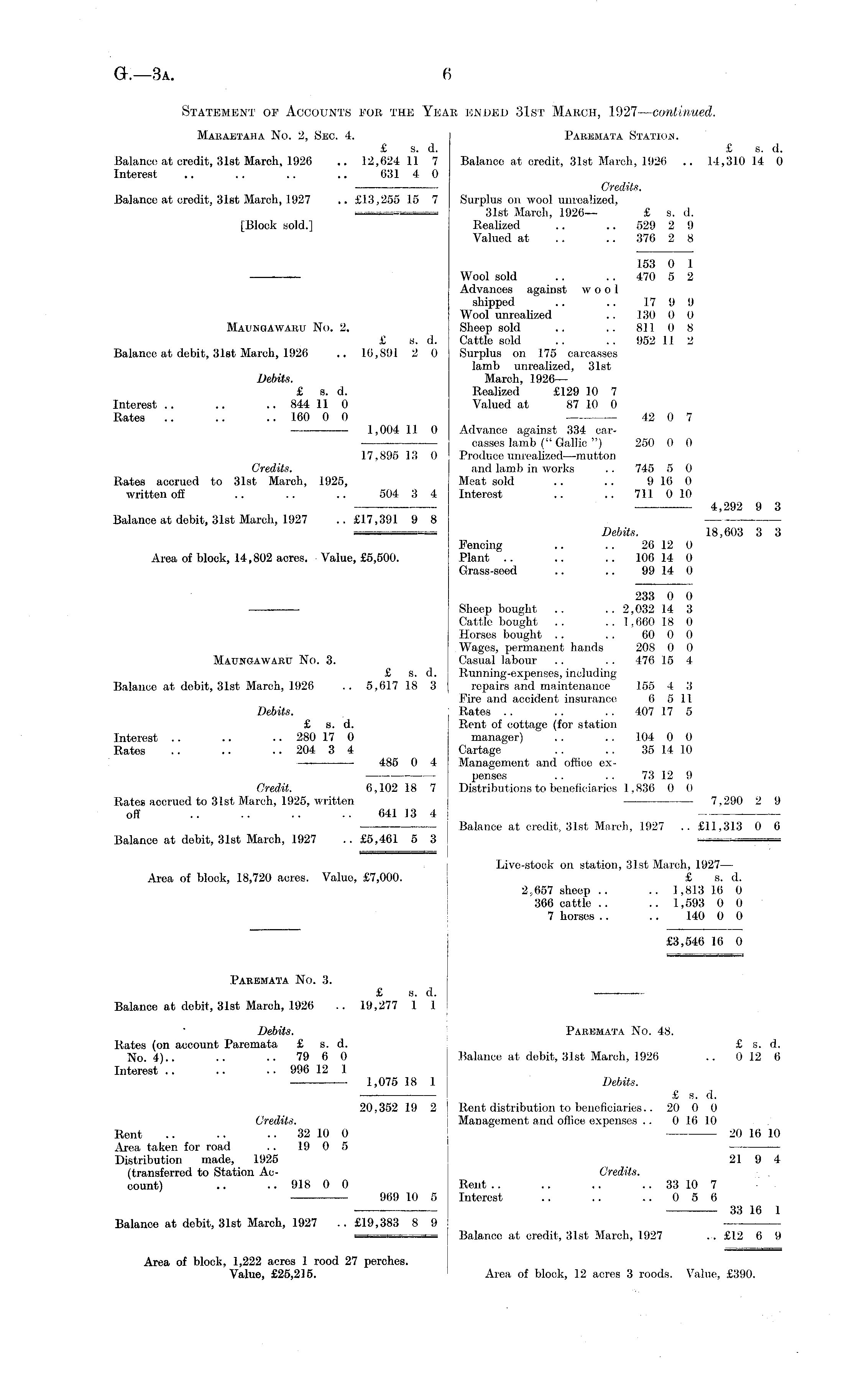 Statement or Accounts foe the Yeae ended 31st Maech, 1927 —continued. Maraetaha No. 2, Sec. 4. Paremata Station. £ s. d. £ s. d. Balance at credit, 31st March, 1926 .. 12,624 11 7 Balance at credit, 31st March, 1926 .. 14,310 14 0 Interest .. .. .. .. 631 4 0 Credits. Balance at credit, 31st March, 1927 .. £13,255 15 7 Surplus on wool unrealized, JVlarcli, 1926 — £ s. d. [Block sold.] Realized .. .. 529 2 9 Valued at .. .. 376 2 8 153 0 1 Wool sold .. . . 470 5 2 Advances against wool shipped .. .. 17 9 9 Wool unrealized .. 130 0 0 Maungawaru No. 2. Sheep sold .. .. 811 0 8 £ s. d. Cattle sold .. .. 952 11 2 Balance at debit, 31st March, 1926 .. 16,891 2 0 Surplus on 175 carcasses lamb unrealized, 31st Debits. March, 1926 — £ s. d. Realized £129 10 7 Interest .. .. .. 844 11 0 Valued at 87 10 0 Rates .. .. .. 160 0 0 42 0 7 1,004 11 0 Advance against 334 careasses lamb (" Gallic ") 250 0 0 17,895 13 0 Produce unrealized —mutton Credits. and lamb in works .. 745 5 0 Rates accrued to 31st March, 1925, Meat sold .. .. 9 16 0 written off .. .. .. 504 3 4 Interest .. .. 711 0 10 — 4,292 9 3 Balance at debit, 31st March, 1927 .. £17,391 9 8 __ Debits. 18,603 3 3 Fencing .. .. 26 12 0 Area of block, 14,802 acres. Value, £5,500. Plant .. .. .. 106 14 0 Grass-seed .. .. 99 14 0 233 0 0 Sheep bought .. .. 2,032 14 3 Cattle bought .. .. 1,660 18 0 Horses bought .. .. 60 0 0 Wages, permanent hands 208 0 0 Maungawaru No. 3. Casual labour .. .. 476 15 4 £ s. d. Running-expenses, including Balance at debit, 31st March, 1926 .. 5,617 18 3 repairs and maintenance 155 4 3 Fire and accident insurance 6 5 11 Debits. Rates .. .. .. 407 17 5 £ s. d. Rent of cottage (for station Interest .. .. .. 280 17 0 manager) .. .. 104 0 0 Rates .. .. . • 204 3 4 Cartage .. .. 35 14 10 — 485 0 4 Management and office ex- ■—— — penses .. .. 73 12 9 Credit. 6,102 18 7 Distributions to beneficiaries 1.836 0 0 Rates accrued to 31st March, 1925, written 7,290 2 9 off .. .. .. .. 641 13 4 Balance at credit, 31st March, 1927 .. £11,313 0 6 Balance at debit, 31st March, .1927 .. £5,461 5 3 Live-stock on station, 31st March, 1927 — Area of block, 18,720 acres. Value, £7,000. £ s. d. 2,657 sheep .. .. 1,813 16 0 366 cattle.. .. 1,593 0 0 7 horses .. .. 140 0 0 £3,546 16 0 Paremata No. 3. £ s. d. Balance at debit, 31st March, 1926 .. 19,277 1 1 Debits. Paremata No. 48. Rates (on account Paremata £ s. d. £ s. d. No. 4).. .. . • 79 6 0 Balance at debit, 31st March, 1926 .. 012 6 Interest .. .. .. 996 12 1 — — 1,075 18 1 Debits. ■ —— £ s. d. 20,352 19 2 Rent distribution to beneficiaries.. 20 0 0 Credits. Management and office expenses .. 0 16 10 Rent .. .. .. 32 10 0 — 20 16 10 Area taken for road .. 19 0 5 Distribution made, 1925 21 9 4 (transferred to Station Ac- Credits. count) .. •. 918 0 0 Rent .. .. ~ 33 10 7 969 10 5 Interest .. .. .. 0 5 6 — 33 16 1 Balance at debit, 31st March, 1927 .. £19,383 8 9 i 1 — Balance at credit, 31st March, 1927 .. £12 6 9 Area of block, 1,222 acres 1 rood 27 perches. Value, £25,215. Area of block, 12 acres 3 roods. Value, £390.