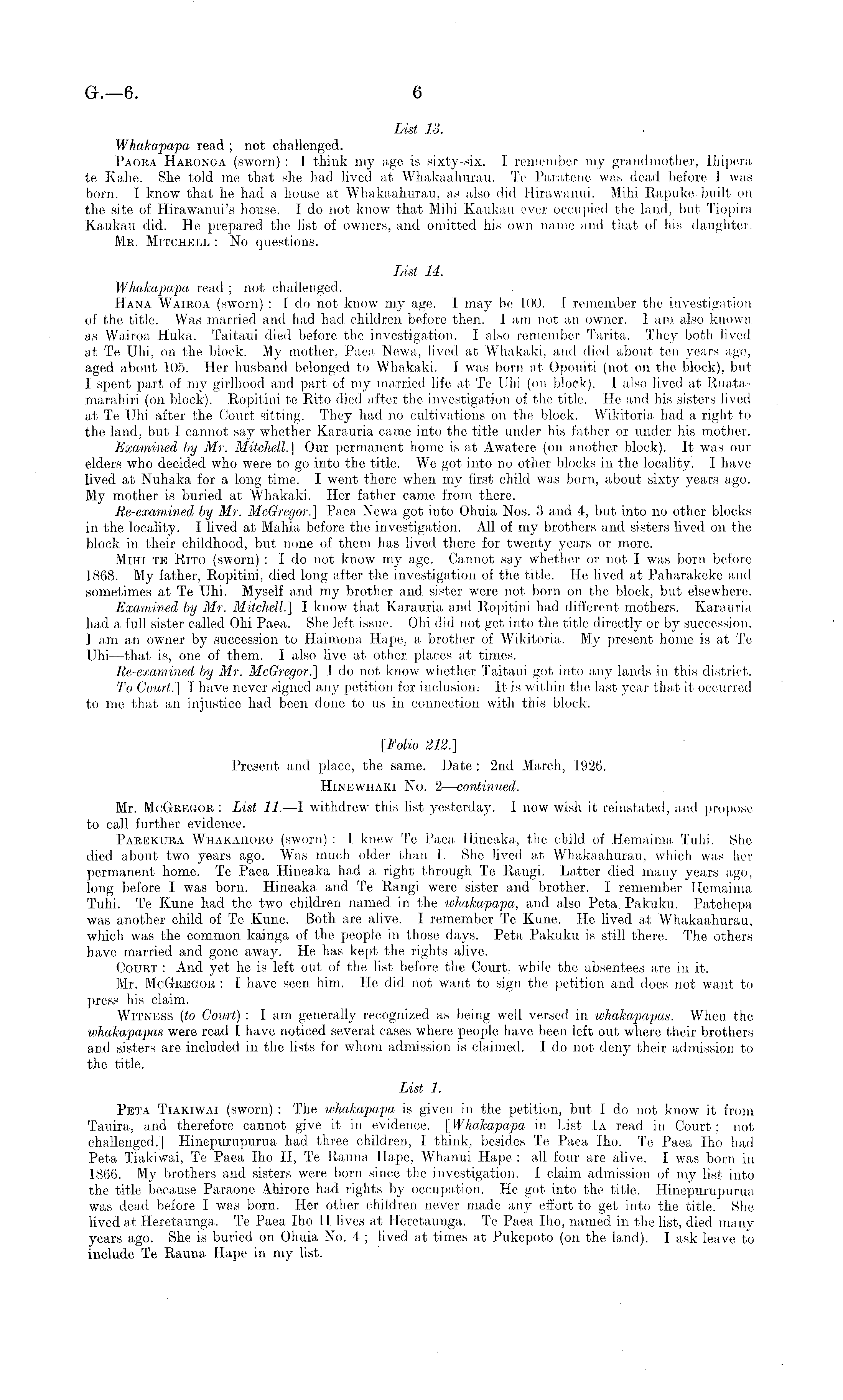 List 13. Whakapapa read ; not challenged. Paora Haronga (sworn) : I think my age is sixty-six. I remember my grandmother, Iliipera te Kahe. She told me that she had lived at Whakaahurau. Te Paratene was dead before I was born. I know that he had a house at Whakaahurau, as also did Hirawanui. Mihi Rapuke built on the site of Hirawanui's house. Ido not know that Mihi Kaukau ever occupied the land, but Tiopira Kaukau did. He prepared the list of owners, and omitted his own name and that of his daughter. Me. Mitchell : No questions. List 14. Whakapapa read ; not challenged. Hana Wairoa (sworn) : Ido not know my age. I may be 100. I remember the investigation of the title. Was married and had had children before then. lam not an owner. lam also known as Wairoa Huka. Taitaui died before the investigation. I also remember Tarita. They both lived at Te Uhi, on the block. My mother. Paea Newa, lived at Whakaki, and died about ten years ago, aged about 105. Her husband belonged to Whakaki. I was born at Opouiti (not on the block), but I spent part of mv girlhood and part of my married life at Te Uhi (on block). I also lived at Ruatamarahiri (on block). Ropitini te Rito died after the investigation of the title. He and his sisters lived at Te Hhi after the Court sitting. They had no cultivations on the block. Wikitoria had a right to the land, but I cannot say whether Karauria came into the title under his father or under his mother. Examined by Mr. Mitchell.] Our permanent home is at Awatere (on another block). It was our elders who decided who were to go into the title. We got into no other blocks in the locality. 1 have lived at Nuhaka for a long time. I went there when my first child was born, about sixty years ago. My mother is buried at Whakaki. Her father came from there. Re-examined by Mr. McGregor.'] Paea Newa got into Ohuia Nos. 3 and 4, but into no other blocks in the locality. I lived at Mahia before the investigation. All of my brothers and sisters lived on the block in their childhood, but none of them has lived there for twenty years or more. Mini te Rito (sworn) : Ido not know my age. Cannot say whether or not I was born before 1868. My father, Ropitini, died long after the investigation of the title. He lived at Paharakeke and sometimes at Te Uhi. Myself and my brother and sister were not born on the block, but elsewhere. Examined by Mr. Mitchell.] I know that Karauria and Ropitini had different mothers. Karauria had a full sister called Ohi Paea. She left issue. Ohi did not get into the title directly or by succession. lam an owner by succession to Haimona Hape, a brother of Wikitoria. My present home is at Te Uhi —that is, one of them. I also live at other places at times. Re-examined by Mr. McGregor.] Ido not know whether Taitaui got into any lands in this district. To Court.\ I have never signed any petition for inclusion, it is within the last year that it occurred to me that an injustice had been done to us in connection with this block. [Folio 212.] Present and place, the same. Date : 2nd March, 1926. Hinewhaki No. 2 —continued. Mr. McGregor : List 11. —I withdrew this list yesterday. I now wish it reinstated, and propose to call further evidence. Parekura Whakahoro (sworn) : I knew Te Paea Hineaka, the child of Hemaima Tuhi. She died about two years ago. Was much older than I. She lived at Whakaahurau, which was her permanent home. Te Paea Hineaka had a right through Te Rangi. Latter died many years ago, long before I was born. Hineaka and Te Rangi were sister and brother. I remember Hemaima Tuhi. Te Kune had the two children named in the whakapapa, and also Peta, Pakuku. Patehepa was another child of Te Kune. Both are alive. I remember Te Kune. He lived at Whakaahurau, which was the common kainga of the people in those days. Peta Pakuku is still there. The others have married and gone away. He has kept the rights alive. Court : And yet he is left out of the list before the Court, while the absentees are in it. Mr. McGregor : I have seen him. He did not want to sign the petition and does not want to press his claim. Witness (to Court) : lam generally recognized as being well versed in whakapapas. When the whakapapas were read I have noticed several cases where people have been left out where their brothers and sisters are included in the lists for whom admission is claimed. Ido not deny their admission to the title. List 1. Peta Tiakiwai (sworn) : The whakapapa is given in the petition, but I do not know it from Tauira, and therefore cannot give it in evidence. [Whakapapa in List 1a read in Court ; not challenged.] Hinepurupurua had three children, I think, besides Te Paea [ho. Te Paea Iho had Peta Tiakiwai, Te Paea Iho 11, Te Rauna Hape, Whanui Hape : all four are alive. I was born in 1866. My brothers and sisters were born since the investigation. I claim admission of my list into the title because Paraone Ahirore had rights by occupation. He got into the title. Hinepurupurua was dead before I was born. Her other children never made any effort to get into the title. She lived at Heretaunga. Te Paea Iho II lives at Heretaunga. Te Paea Iho, named in the list, died many years ago. She is buried on Ohuia No. 4 ; lived at times at Pukepoto (on the land). I ask leave to include Te Rauna Hape in my list.