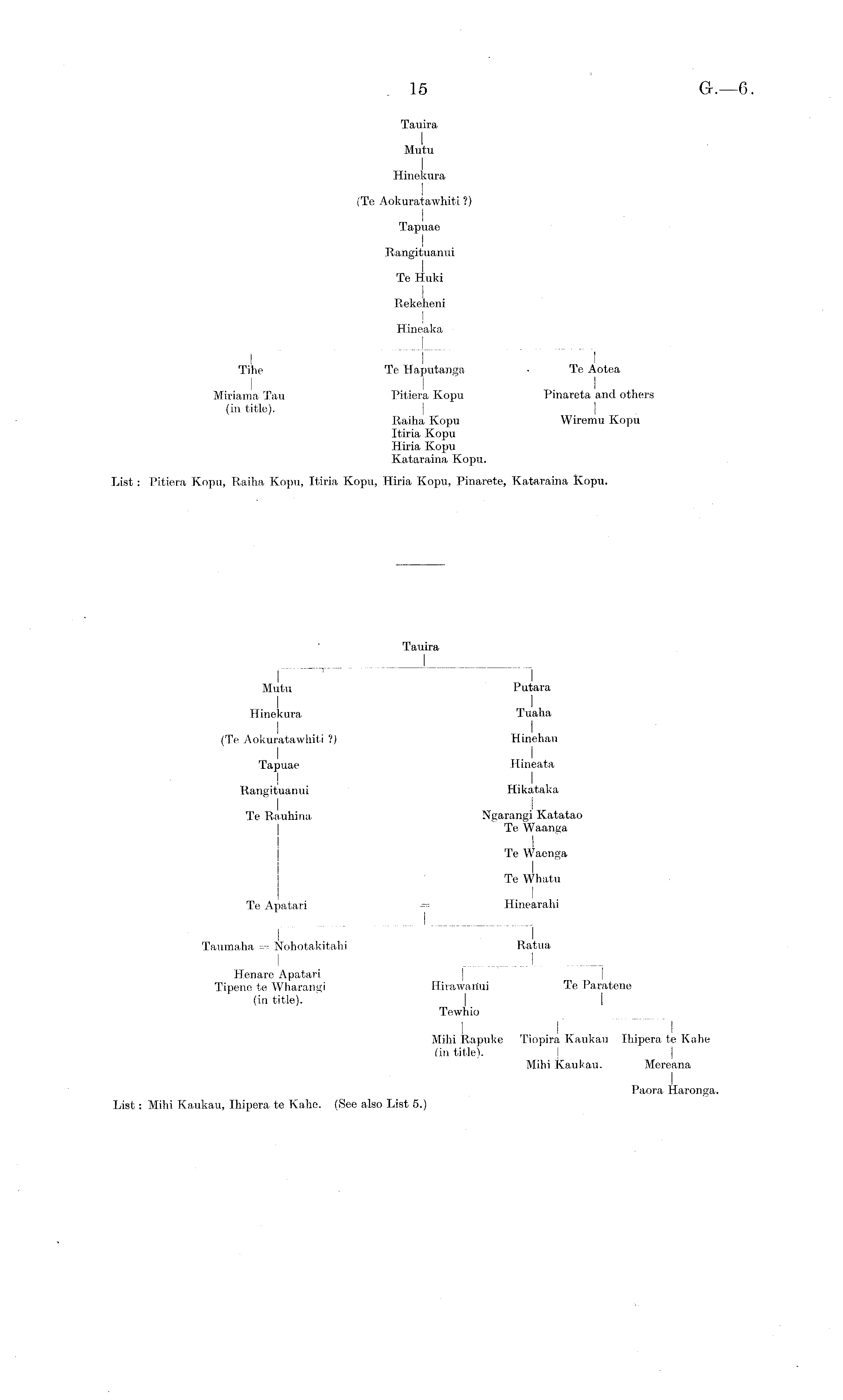 Tauira I T i Mutu Putara I I Hinekura Tuaha i . i (Te Aokuratawliiti 1) H inehau I I Tapuae Hineata ! . I Rangituanui Hikataka Te Rauhina Ngarangi Katatao Te Waanga I Te Waenga i Te Whatu I Te Apatari = Hinearahi ! Taumaha = Nohotakitahi Ratua I , L_ Henare Apatari Tipene te Wharangi Hirawaitui Te Paratene (in title). | I Tewhio i r i Mihi Rapuke Tiopira Kaukau Ihipera te Kahe fin title). | | Mihi Kaukau. Mereana i Paora Haronga. List: Mihi Kaukau, Ihipera te Kahe. (See also List 5.)