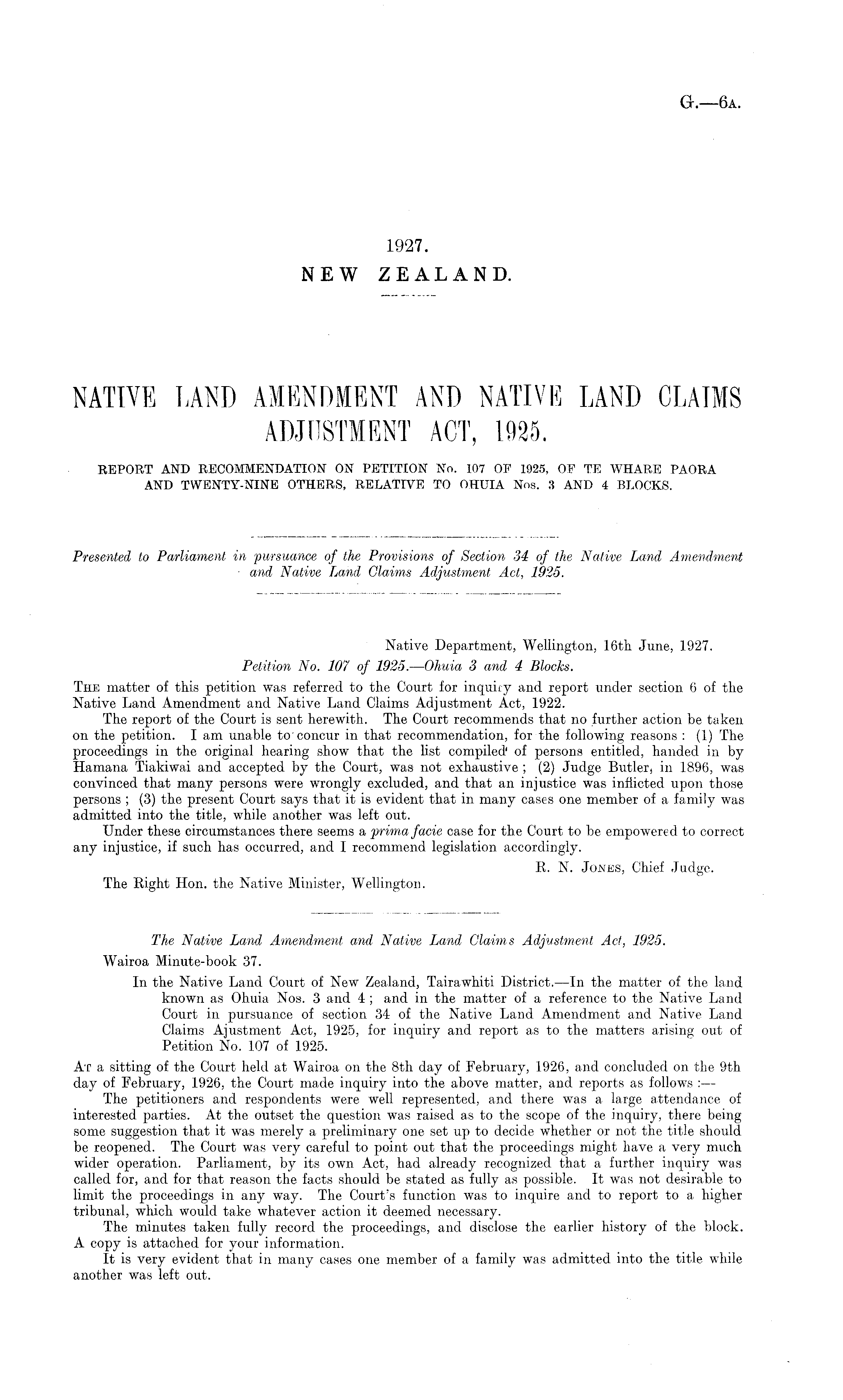 NATIVE LAND AMENDMENT AND NATIVE LAND CLAIMS ADJUSTMENT ACT, 1925. REPORT AND RECOMMENDATION ON PETITION No. 107 OF 1925, OF TE WHARE PAORA AND TWENTY-NINE OTHERS, RELATIVE TO OHUIA Nos. 3 AND 4 BLOCKS.