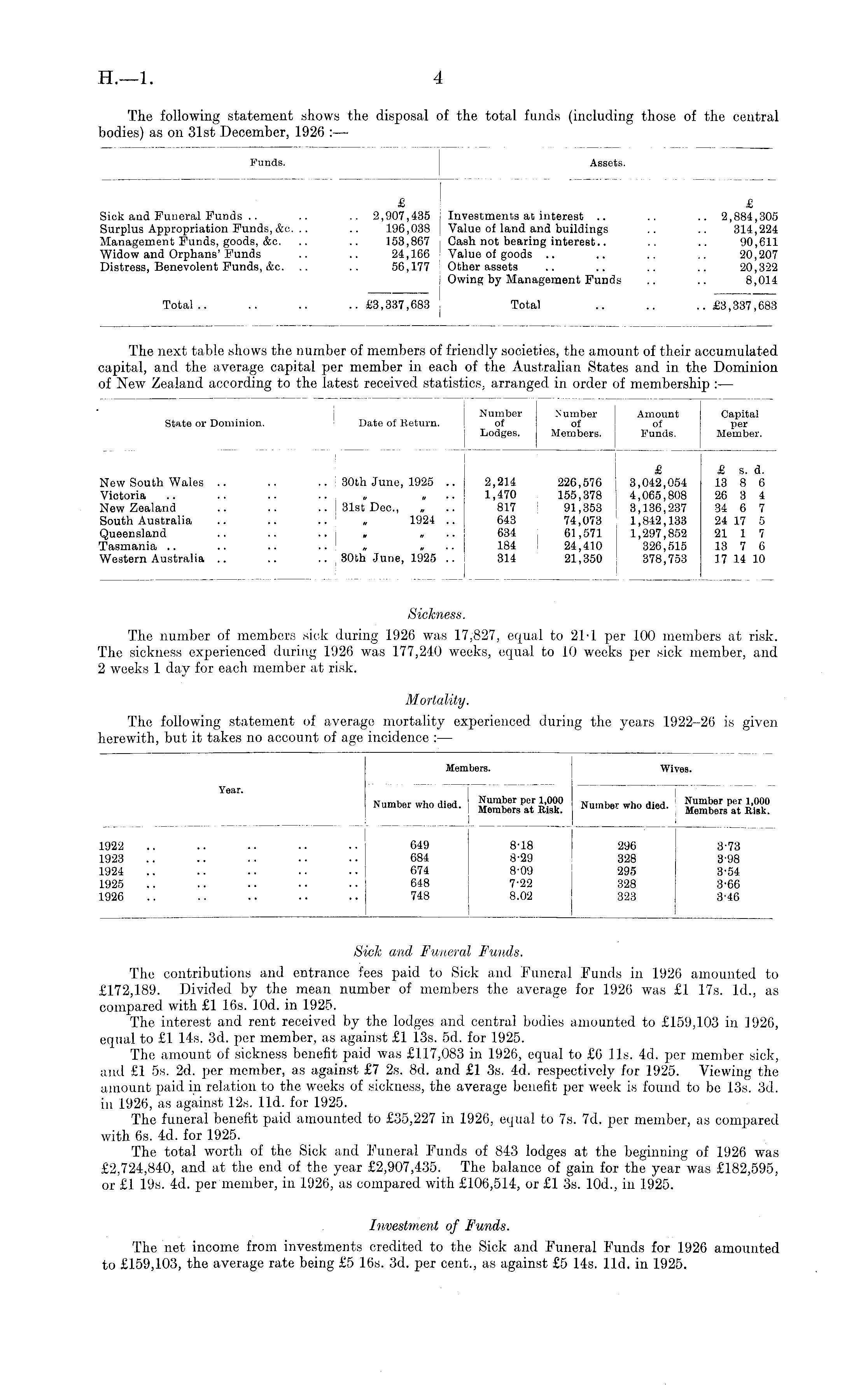 Sick and Funeral Funds. The contributions and entrance fees paid to Sick and Funeral Funds in 1926 amounted to £172,189. Divided by the mean number of members the average for 1926 was £1 17s. Id., as compared with £1 16s. lOd. in 1925. The interest and rent received by the lodges and central bodies amounted to £159,103 in 1926, equal to £1 14s. 3d. per member, as against £1 13s. sd. for 1925. The amount of sickness benefit paid was £117,083 in 1926, equal to £6 lis. 4d. per member sick, and £1 ss. 2d. per member, as against £7 2s. Bd. and £1 3s. 4d. respectively for 1925. Viewing the amount paid in relation to the weeks of sickness, the average benefit per week is found to be 13s. 3d. in 1926, as against 12s. lid. for 1925. The funeral benefit paid amounted to £35,227 in 1926, equal to 7s. 7d. per member, as compared with 6s. 4d. for 1925. The total worth of the Sick and Funeral Funds of 843 lodges at the beginning of 1926 was £2,724,840, and at the end of the year £2,907,435. The balance of gain for the year was £182,595, or £1 19s. 4d. per member, in 1926, as compared with £106,514, or £1 3s. 10d., in 1925. Investment of Funds. The net income from investments credited to the Sick and Funeral Funds for 1926 amounted to £159,103, the average rate being £5 16s. 3d. per cent., as against £5 14s. lid. in 1925.