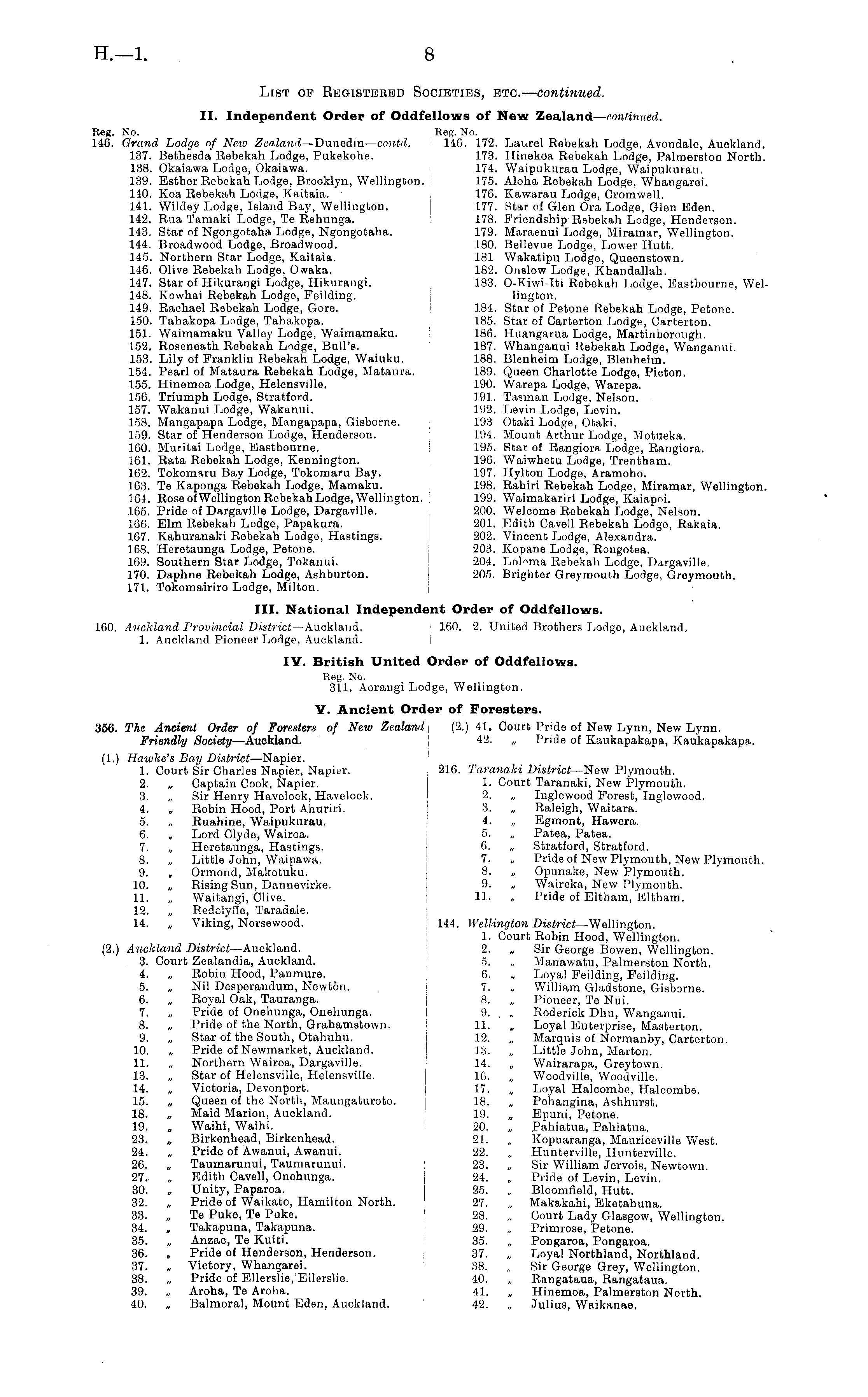 List of Registered Societies, etc. —continued. 11. Independent Order of Oddfellows of New Zealand—continued. Reg. No. Reg. No. 146. Grand Lodge of New Zealand—Dunedin—contd. 146, 172. Laurel Rebekah Lodge, Avondale, Auckland. 137. Bethesda Rebekah Lodge, Pukekohe. 173. Hinekoa Rebekah Lodge, Palmerston North. 138. Okaiawa Lodge, Okaiawa. 174. Waipukurau Lodge, Waipukurau. 139. Esther Rebekah Lodge, Brooklyn, Wellington. 175. Aloha Rebekah Lodge, Whangarei. 110. Koa Rebekah Lodge, Kaitaia. 176. Kawarau Lodge, Cromwell. 141. Wildey Lodge, Island Buy, Wellington. 177. Star of Glen Ora Lodge, Glen Eden. 142. Rua Tamaki Lodge, Te Rehunga. 178. Friendship Rebekah Lodge, Henderson. 143. Star of Ngongotaha Lodge, Ngongotaha. 179. Maraenui Lodge, Miramar, Wellington. 144. Broadwood Lodge, Broadwood. 180. Bellevue Lodge, Lower Hutt. 145. Northern Star Lodge, Kaitaia. 181 Wakatipu Lodge, Queenstown. 146. Olive Rebekah Lodge, Owaka. 182. Onslow Lodge, Khandallah. 147. Star of Hikurangi Lodge, Hikurangi. 183. O-Kiwi-Iti Rebekah Lodge, Eastbourne, Wei 148. Kowhai Rebekah Lodge, Feilding. lington. 149. Raohael Rebekah Lodge, Gore. 184. Star of Petone Rebekah Lodge, Petone. 150. Tahakopa Lodge, Tahakopa. 185. Star of Carterton Lodge, Carterton. 151. Waimamaku Valley Lodge, Waimamaku. 186. Huangarua Lodge, Martinborough. 152. Rosene&th Rebekah Lodge, Bull's. 187. Whanganui Kebekah Lodge, Wanganui. 153. Lily of Franklin Rebekah Lodge, Waiuku. 188. Blenheim Lodge, Blenheim. 154. Pearl of Mataura Rebekah Lodge, Mataura. 189. Queen Charlotte Lodge, Pioton. 155. Hinemoa Lodge, Helensville. 190. Warepa Lodge, Warepa. 156. Triumph Lodge, Stratford. 191, Tasman Lodge, Nelson. 157. Wakanui Lodge, Wakanui. 192. Levin Lodge, Levin. 158. Mangapapa Lodge, Mangapapa, Gisborne. 193 Otaki Lodge, Otaki. 159. Star of Henderson Lodge, Henderson. 194. Mount Arthur Lodge, Motueka. 160. Muritai Lodge, Eastbourne. 195. Star of Rangiora Lodge, Rangiora. 161. Rata Rebekah Lodge, Kennington. 196. Waiwhetu Lodge, Trentham. 162. Tokomaru Bay Lodge, Tokomaru Bay. 197. Hylton Lodge, Aramobo. ,163. Te Kaponga Rebekah Lodge, Mamaku. 198. Rahiri Rebekah Lodge, Miramar, Wellington. 164. Rose of Wellington Rebekah Lodge, Wellington. 199. Waimakariri Lodge, Kaiapoi. 165. Pride of Dargaville Lodge, Dargaville. 200. Weloome Rebekah Lodge, Nelson. 166. Elm Rebekah Lodge, Papakura. 201. Edith Cavell Rebekah Lodge, Rakaia. 167. Kahuranaki Rebekah Lodge, Hastings. 202. Vincent Lodge, Alexandra. 168. Heretaunga Lodge, Petone. 203. Kopane Lodge, Rongotea. 169. Southern Star Lodge, Tokanui. 204. Loloma Rebekah Lodge, Dargaville. 170. Daphne Rebekah Lodge, Ashburton. 205. Brighter Greymouth Lodge, Greymouth. 171. Tokomairiro Lodge, Milton. 111. National Independent Order of Oddfellows. 160. Auckland Provincial District—Auckland. \ 160. 2. United Brothers Lodge, Auckland. 1. Auckland Pioneer Lodge, Auckland. I IV. British United Order of Oddfellows. Reg. No. 311. Aorangi Lodge, Wellington. V. Ancient Order of Foresters. 356. The Ancient Order of Foresters of New Zealand (2.) 41. Court Pride of New Lynn, New Lynn. Friendly Society —Auckland. 42. „ Pride of Kaukapakapa, Kaukapakapa. (1.) Hawlce's Bay District —Napier. 1. Court Sir Charles Napier, Napier. 216. Taranaki District —New Plymouth. 2. „ Captain Cook, Napier. 1. Court Taranaki, New Plymouth. 3. „ Sir Henry Havelock, Havelock. 2. „ Inglewood Forest, Inglewood. 4. „ Robin Hood, Port Ahuriri. 3. „ Raleigh, Waitara. 5. „ Ruahine, Waipukurau. 4. „ Egmont, Hawera. 6. „ Lord Clyde, Wairoa. 5. „ Patea, Patea. 7. „ Heretaunga, Hastings. 6. „ Stratford, Stratford. 8. „ Little John, Waipawa. 7. „ Pride of New Plymouth, New Plymouth. 9. , Ormond, Makotuku. S. „ Opunake, New Plymouth. 10. „ Rising Sun, Dannevirke. 9. „ Waireka, New Plymouth. 11. „ Waitangi, Clive. 11. » Pride of Eltham, Eltham. 12. „ Redclyfte, Taraaale. 14. „ Viking, Norsewood. 144. Wellington District—Wellington. 1. Court Robin Hood, Wellington. (2.) Auckland District —Auckland. 2. „ Sir George Bowen, Wellington. 3. Court Zealandia, Auckland. 5. Mar/awatu, Palmerston North. 4. „ Robin Hood, Panmure. 6. „ Loyal Feilding, Feilding. 5. „ Nil Desperandum, Newton. 7. . William Gladstone, Gisborne. 6. „ Royal Oak, Tauranga. 8. „ Pioneer, Te Nui, 7. „ Pride of Onehunga, Onehunga. 9. , Roderick Dhu, Wanganui. 8. „ Pride of the North, Grahamstown. 11. » Loyal Enterprise, Masterton. 9. „ Star of the South, Otahuhu. 12. „ Marquis of Normanby, Carterton. 10. „ Pride of Newmarket, Auckland. 13. „ Little John, Marton. 11. „ Northern Wairoa, Dargaville. 14. „ Wairarapa, Greytown. 13. „ Star of Helensville, Helensville. 16. „ Woodville, Woodville. 14. „ Victoria, Devonport. 17. „ Loyal Halcombe, Halcombe. 15. „ Queen of the North, Maungaturoto. 18. „ Pohangina, Ashhurst. 18. „ Maid Marion, Auckland. 19. „ Epuni, Petone. 19. „ Waihi, Waihi. 20. „ Pahiatua, Pahiatua. 23. „ Birkenhead, Birkenhead. 21. „ Kopuaranga, Mauriceville West. 24. „ Pride of Awanui, Awanui. 22. „ Hunterville, Hunterville. 26. „ Taumarunui, Taumarunui. 23. „ Sir William Jervois, Newtown. 27. „ Edith Cavell, Onehunga. 24. „ Pride of Levin, Levin. 30. „ Unity, Paparoa. 25. „ Bloomfield, Hutt. 32. „ Pride of Waikato, Hamilton North. 27. „ Makakahi, Eketahuna. 33. „ Te Puke, Te Puke. 28. „ Court Lady Glasgow, Wellington. 34. , Takapuna, Takapuna. 29. „ Primrose, Petone. 35. „ Anzac, Te Kuiti. 35. „ Pongaroa, Pongaroa. 36. „ Pride of Henderson, Henderson. 37. „ Loyal Northland, Northland. 37. „ Victory, Whangarei. 38. „ Sir George Grey, Wellington. 38. „ Pride of Ellerslie.'EUerslie. 40. „ Rangataua, Rangataua. 39. „ Aroha, Te Aroha. 41. , Hinemoa, Palmerston North. 40. „ Balmoral, Mount Eden, Auckland. 42. „ Julius, Waikanae.