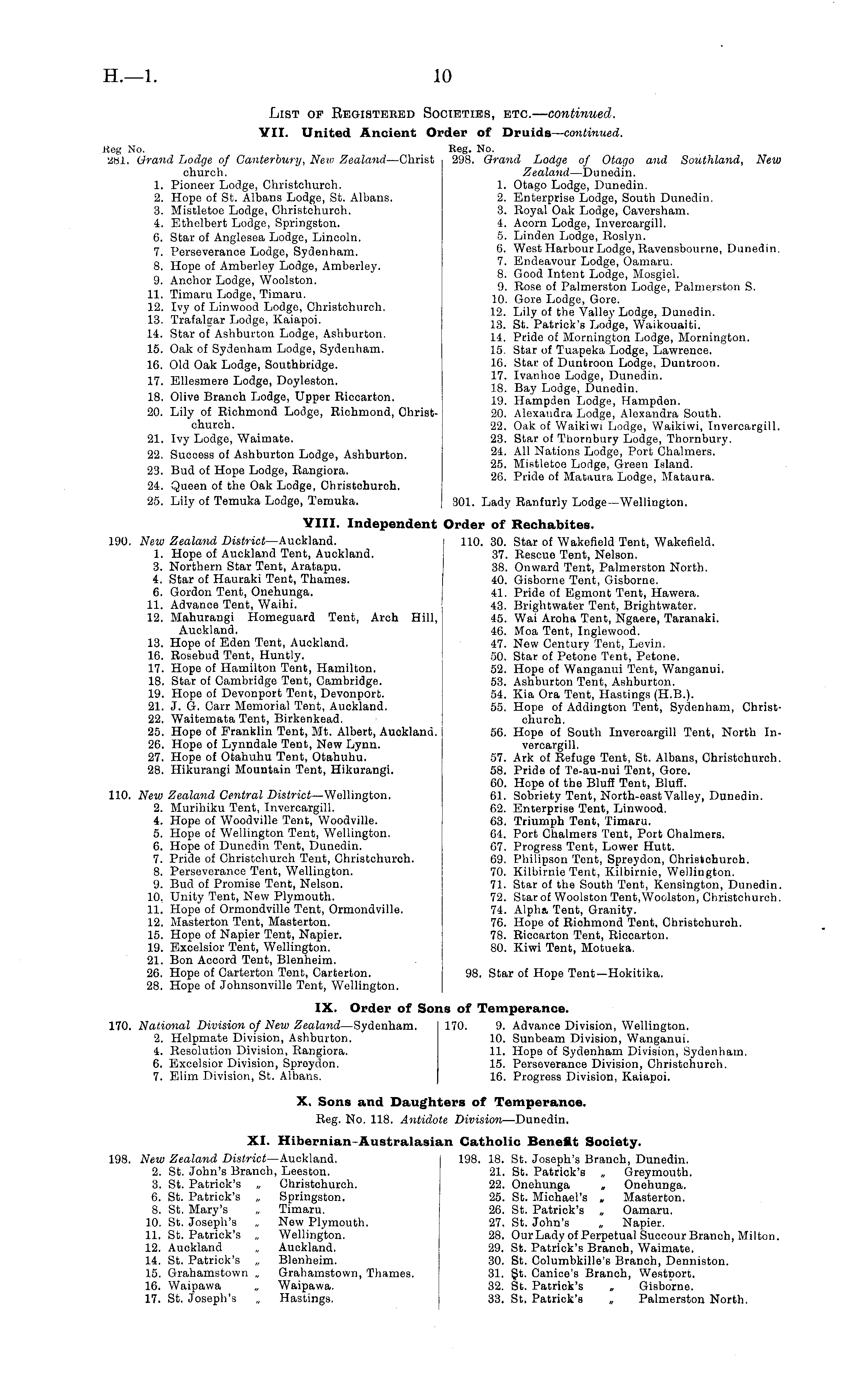 List of Registered Societies, etc. —continued. YII. United Ancient Order of Druids —continued. Keg No. Reg. No. 281. Grand Lodge of Canterbury, New Zealand —Christ 298. Grand Lodge of Otago and Southland, New church. Zealand —Dunedin. 1. Pioneer Lodge, Ohristchureh. 1. Otago Lodge, Dunedin. 2. Hope of St. Albans Lodge, St. Albans. 2. Enterprise Lodge, South Dunedin. 3. Mistletoe Lodge, Christchurch. 3. Royal Oak Lodge, Caversham. 4. Ethelbert Lodge, Springston. 4. Acorn Lodge, Invercargill. 6. Star of Anglesea Lodge, Lincoln. 5. Linden Lodge, Roslyn. 7. Perseverance Lodge, Sydenham. 6 - West Harbour Lodge, Ravensbourne, Dunedin. 8. Hope of Amberley Lodge, Amberley. 1' Endeavour Lodge, Oamaru. 9. Anchor Lodge, Woolston. * Lodftalmerston S. 11. Timaru Lodge Timaru 10. Gore Lodge, Gore. m y . of , Lm ™°S d L ?? ge ' Chrl3tohurch - 12. Lily of the Valley Lodge, Dunedin. 13. Trafalgar Lodge, Kaiapoi. 13 st /p fttrie k's Lodge, Waikouaiti. 14. Star of Ashburton Lodge, Ashburton. 24. Pride of Mornington Lodge, Mornington. 15. Oak of Sydenham Lodge, Sydenham. 15. Star of Tuapeka Lodge, Lawrence. 16. Old Oak Lodge, Southbridge. 16. Star of Duntroon Lodge, Duntroon. 17. Ellesmere Lodge, Doyleston. Ivanhoe Lodge, Dunedin. „ ,J 5 ' ' _. 18. Bay Lodge, Dunedin. 18. Olive Branch Lodge, Upper Riecarton. 19- Hampden Lodge, Hampden. 20. Lily of Riohmond Lodge, Richmond, Christ- 20. Alexandra Lodge, Alexandra South. church. 22. Oak of Waikiwi Lodge, Waikiwi, Invercargill. 21. Ivy Lodge, Waimate. 23. Star of Thornbury Lodge, Thornbury. 22. Suooess of Ashburton Lodge, Ashburton. 24. All Nations Lodge, Port Chalmers. no -□ j itt r -d 25. Mistletoe Lodge, Green Island. 23. Bud of Hope Lodge, Rangiora. 26 prMe of Mat Lod Mataura 24. Queen of the Oak Lodge, Chnstohurch. 25. Lily of Temuka Lodge, Temuka. 301. Lady Ranfurly Lodge—Wellington, VIII. Independent Order of Rechabites. 190. New Zealand District —Auckland. 110. 30. Star of Wakefield Tent, Wakefield. 1. Hope of Auckland Tent, Auckland. 37. Rescue Tent, Nelson. 3. Northern Star Tent, Aratapu. 38. Onward Tent, Palmerston North. 4. Star of Hauraki Tent, Thames. 40. Gisborne Tent, Gisborne. 6. Gordon Tent, Onehunga. 41. Pride of Egmont Tent, Hawera. 11. Advance Tent, Waihi. 43. Brightwater Tent, Brightwater. 12. Mahurangi Homeguard Tent, Arch Hill, 45. Wai Aroha Tent, Ngaere, Taranaki. Auckland. 46. Moa Tent, Inglewood. 13. Hope of Eden Tent, Auckland. 47. New Century Tent, Levin. 16. Rosebud Tent, Huntly. 50. Star of Petone Tent, Petone. 17. Hope of Hamilton Tent, Hamilton. 52. Hope of Wanganui Tent, Wanganui. 18. Star of Cambridge Tent, Cambridge. 53. Ashburton Tent, Ashburton. 19. Hope of Devonport Tent, Devonport. 54. Kia Ora Tent, Hastings (H. 8.). 21. J. G. Carr Memorial Tent, Auckland. 55. Hope of Addington Tent, Sydenham, Christ--22. Waiternata Tent, Birkenkead. church. 25. Hope of Franklin Tent, Mt. Albert, Auckland. 56. Hope of South Inveroargill Tent, North In--26. Hope of Lynndale Tent, New Lynn. vercargill. 27. Hope of Otahuhu Tent, Otahuhu. 57. Ark of Refuge Tent, St. Albans, Christchurch. 28. Hikurangi Mountain Tent, Hikurangi. 58. Pride of Te-au-nui Tent, Gore. 60. Hope of the Bluff Tent, Bluff. 110. New Zealand Central District—Wellington. 61. Sobriety Tent, North-east Valley, Dunedin. 2. Murihiku Tent, Invercargill. 62. Enterprise Tent, Linwood. 4. Hope of Woodville Tent, Woodville. 63. Triumph Tent, Timaru. 5. Hope of Wellington Tent, Wellington. 64. Port Chalmers Tent, Port Chalmers. 6. Hope of Dunedin Tent, Dunedin. 67. Progress Tent, Lower Hutt. 7. Pride of Christchuroh Tent, Christchurch. 69. Philipson Tent, Spreydon, Chrisfcohurch. 8. Perseverance Tent, Wellington. 70. Kilbirnie Tent, Kilbirnie, Wellington. 9. Bud of Promise Tent, Nelson. 71. Star of the South Tent, Kensington, Dunedin. 10. Unity Tent, New Plymouth. 72. Star of Woolston Tent,Woolston, Christchurch. 11. Hope of Ormondville Tent, Ormondville. 74. Alpha Tent, Granity. 12. Masterton Tent, Masterton. 76. Hope of Riohmond Tent, Christchuroh. 15. Hope of Napier Tent, Napier. 78. Riccarton Tent, Riccarton. 19. Excelsior Tent, Wellington. 80. Kiwi Tent, Motueka. 21. Bon Accord Tent, Blenheim. 26. Hope of Carterton Tent, Carterton. 98. Star of Hope Tent—Hokitika. 28. Hope of Johnsonville Tent, Wellington. IX. Order of Sons of Temperance. 170. National Division of New Zealand—Sydenham. 170. 9. Advance Division, Wellington. 2. Helpmate Division, Ashburton. 10. Sunbeam Division, Wanganui. 4. Resolution Division, Rangiora. 11. Hope of Sydenham Division, Sydenham. 6. Excelsior Division, Spreydon. 15. Perseverance Division, Christchurch. 7. Elim Division, St. Albans. 16. Progress Division, Kaiapoi. X. Sons and Daughters of Temperance. Reg. No. 118. Antidote Division—Dunedin. XI. Hibernian-Australasian Catholic Benefit Society. 198. New Zealand District —Auckland. 198. 18. St. Joseph's Branch, Dunedin. 2. St. John's Branch, Leeston. 21. St. Patrick's „ Greymouth. 3. St. Patrick's „ Christchurch. 22. Onehunga „ Onehunga. 6. St. Patrick's „ Springston. 25. St. Michael's „ Masterton. 8. St. Mary's „ Timaru. 26. St. Patrick's „ Oamaru. 10. St. Joseph's „ New Plymouth. 27. St. John's Napier. 11. St. Patrick's „ Wellington. 28. Our Lady of Perpetual Succour Branoh, Milton. 12. Auckland „ Auckland. 29. St. Patrick's Branoh, Waimate. 14. St. Patrick's „ Blenheim. 30. St. Columbkille's Branoh, Denniston. 15. Grahamstown „ Grahamstown, Thames. 31. §t. Canice's Branch, Westport. 16. Waipawa „ Waipawa. 32. St. Patriok's „ Gisborne. 17. St. Joseph's „ Hastings. 33. St. Patrick's „ Palmerston North.