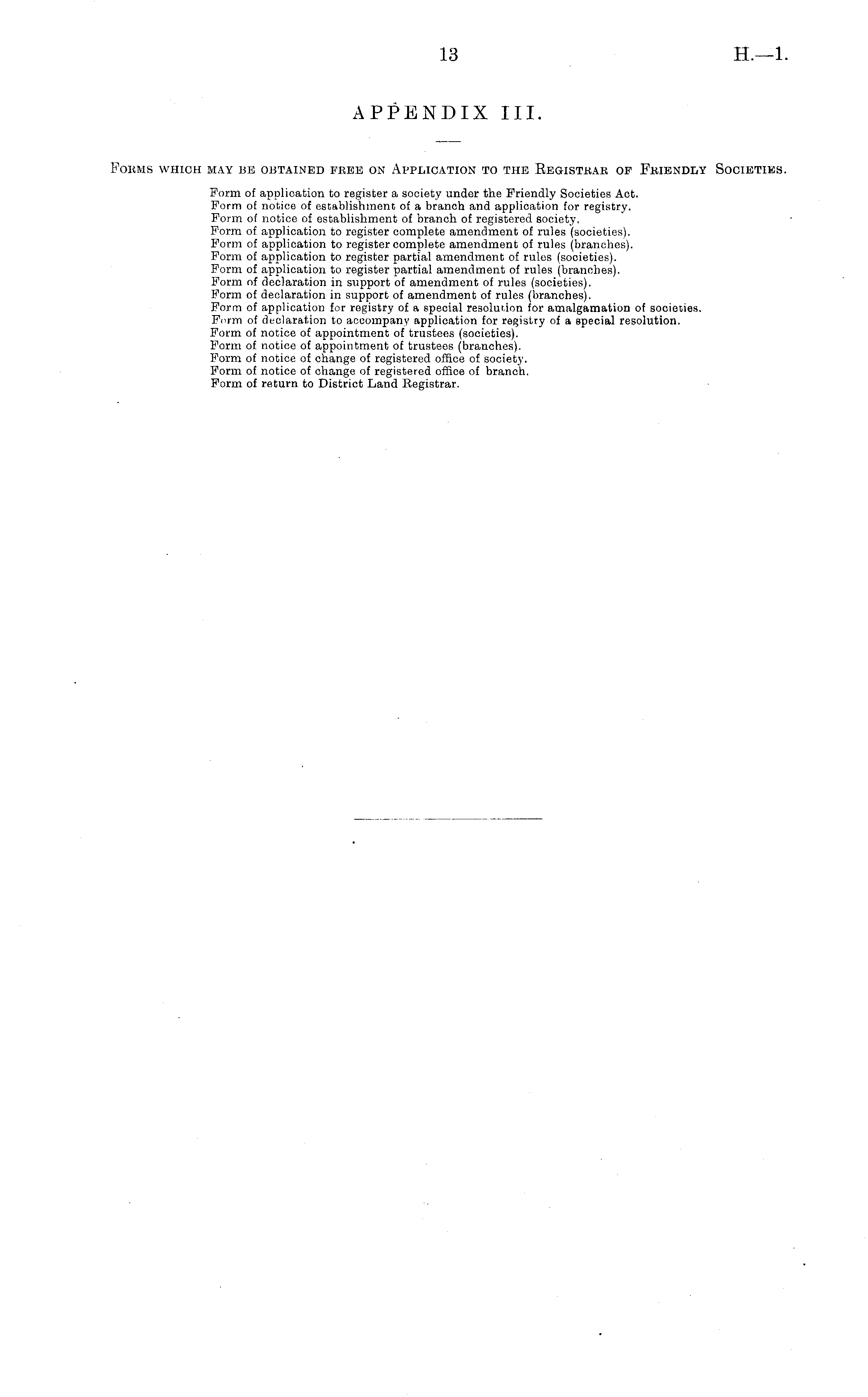 APPENDIX 111. Forms which may be obtained free on Application to the Registrar of Friendly Societies Form of application to register a society under the Friendly Societies Act. Form of notice of establishment of a branch and application for registry. Form of notice of establishment of branch of registered society. Form of application to register complete amendment of rules (societies). Form of application to register complete amendment of rules (branches). Form of application to register partial amendment of rules (societies). Form of application to register partial amendment of rules (branches). Form of declaration in support of amendment of rules (societies). Form of declaration in support of amendment of rules (branches). Form of application for registry of a special resolution for amalgamation of societies. Form of declaration to accompany application for registry of a special resolution. Form of notice of appointment of trustees (societies). Form of notice of appointment of trustees (branches). Form of notice of change of registered office of society. Form of notice of change of registered office of branch. Form of return to District Land Registrar.