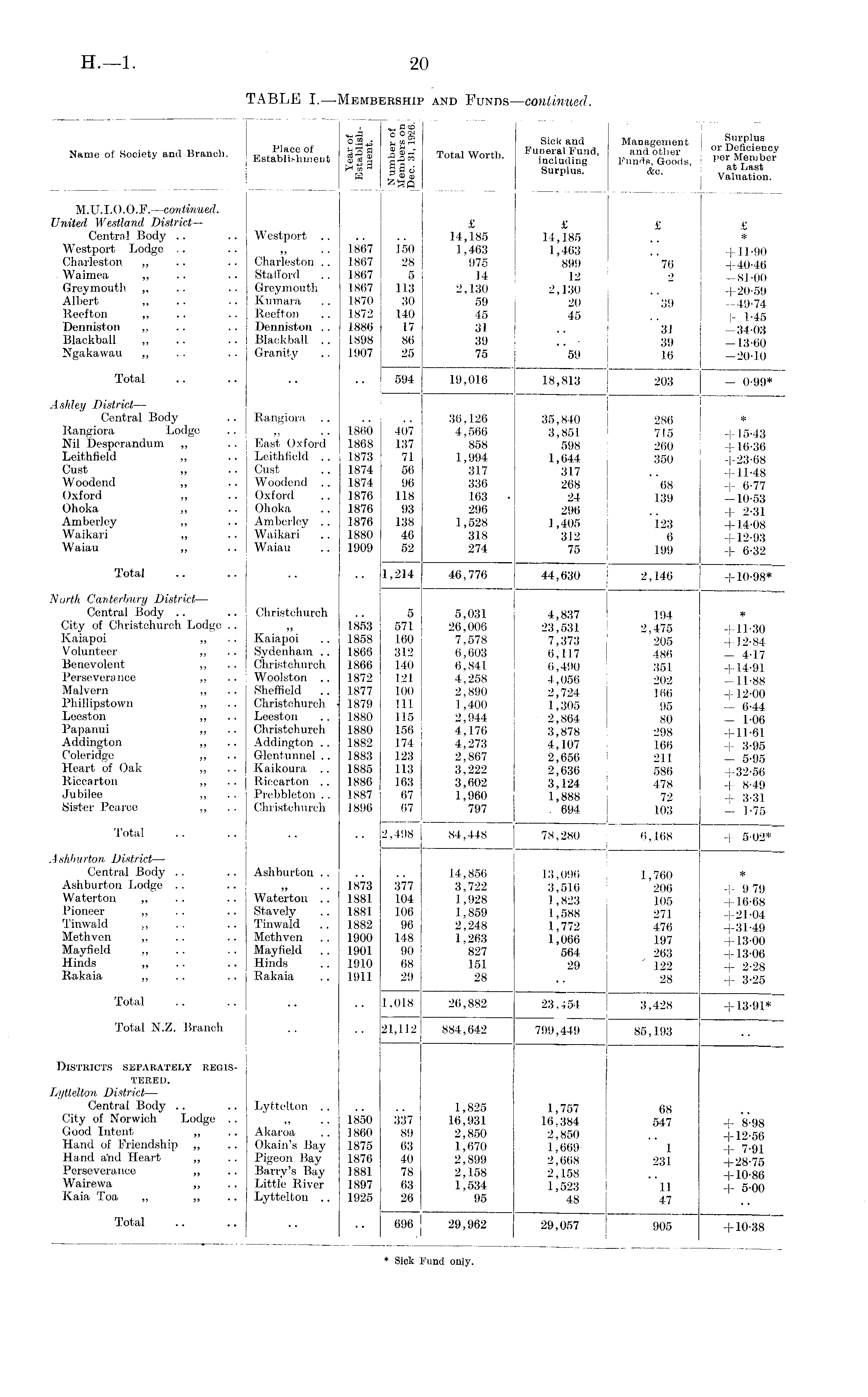 . n«o ,3 c O "X Cl . 1 Sick and Management j ourplU8 Name of Society and Branch. I|| |J* Total Wort), flS &c - Valuation. I Z SS \ M.U.I.O.O.F. —continued. United Westland District— £ £ £ £ Central Body .. .. Westport .. .. .. 14,185 14,185 .. * Westport Lodge .. „ .. 1867 150 1,463 1,463 .. +11-90 Charleston „ .. .. Charleston .. 1867 28 975 899 76 +40-46 Waimea „ .. .. Stafford .. 1867 5 14 12 2 - 81-00 Greymouth „ .. .. Greymouth 1867 113 2,130 2,130 .. +20-59 Albert „ .. .. Kumara .. 1870 30 59 20 39 -49-74 Reefton „ .. .. Reeft.on .. 1872 140 45 45 .. _(. 1-45 Denniston „ .. .. Denniston .. 1886 17 31 .. 31 -34-03 Blackball ,, .. .. Blackball .. 1898 86 39 ■ 39 13-60 Ngakawau „ .. .. Granity .. 1907 25 75 59 16 -20-10 Total .. .. .. .. 594 19,016 18,813 ' 203 — 0-99* Ashley District — Central Body .. Rangiora 36,126 35,840 286 * Rangiora Lodge .. „ .. 1860 407 4,566 3,851 715 +15-43 Nil Desperandum „ .. East Oxford 1868 137 858 598 260 +16-36 Leithfield „ .. Leithfield .. 1873 71 1,994 1,644 350 +23-68 Cust „ .. Cust .. 1874 56 317 317 .. +11-48 Woodend „ .. Woodend .. 1874 96 336 268 68 + 6-77 Oxford „ .. Oxford .. 1876 118 163 • 24 139 -10-53 Ohoka „ .. Ohoka .. 1876 93 296 296 .. + 2-31 Amberley „ .. Amberley .. 1876 138 1,528 1,405 123 +14-08 Waikari „ .. Waikari .. 1880 46 318 312 6 +12-93 Waiau „ .. Waiau .. 1909 52 274 75 199 _j_ 6-32 Total .. .. .. .. 1,214 46,776 44,630 2,146 +10-98* North Canterbury District— Central Body .. .. Christchurch .. 5 5,031 4,837 ' 194 * City of Christchurch Lodge .. „ 1853 571 26,006 23,531 i 2,475 +11-30 Ivaiapoi „ .. Kaiapoi .. 1858 160 7,578 7,373 205 + 12-84 Volunteer „ .. Sydenham .. 1866 312 6,603 6,117 486 — 4-17 Benevolent „ .. Christchurch 1866 140 6,841 6,490 351 +14-91 Perseverance ,, .. Woolston .. 1872 121 4,258 4,056 202 —11-88 Malvern „ .. Sheffield .. 1877 100 2,890 2,724 166 -f 12-00 Phillipstown „ .. Christchurch ■ 1879 111 1,400 1,305 95 — 6-44 Leeston „ .. Leeston .. 1880 115 2,944 2,864 80 — 1-06 Papanui „ .. Christchurch 1880 156 4,176 3,878 298 +11-61 Addington „ .. Addington .. 1882 174 4,273 4,107 166 | 3-95 Coleridge „ .. Glentunnel .. 1883 123 2,867 2,656 211 — 5-95 Heart of Oak „ .. Kaikoura .. 1885 113 3,222 2,636 j 586 +32-56 Riccarton „ .. Riccarton .. 1886 163 3,602 3,124 j 478 + 8-49 Jubilee „ .. Prebbleton .. 1887 67 1,960 1,888 ; 72 + 3-31 Sister Pearce „ .. Christchurch 1896 67 797 , 694 | 103 — 1-75 Total .. .. .. .. 2,498 84,448 78,280 6,168 + 5-02* A shburton District— Central Body .. .. Ashburton .. .. .. 14,856 13,096 1,760 * Ashburton Lodge .. .. „ .. 1873 377 3,722 3,516 '2O6 + 9 79 Waterton „ .. .. Waterton .. 1881 104 1,928 1,823 105 +16-68 Pioneer „ .. .. Stavely .. 1881 106 1,859 1,588 271 +21-04 Tinwald „ .. .. Tinwald .. 1882 96 2,248 1,772 476 +31-49 Methven ,, .. .. Methven .. 1900 148 1,263 1,066 197 +13-00 Mayfield ,, .. .. Mayfield .. 1901 90 827 564 263 +13-06 Hinds „ .. .. Hinds .. 1910 68 151 29 122 + 2-28 Rakaia „ .. .. Rakaia .. 1911 29 28 ., 28 + 3-25 Total .. .. .. .. 1,018 26,882 23,-154 3,428 +13-91* Total N.Z. Branch .. .. 21,112 884,642 799,449 85,193 Districts separately registered. Lyttelton District — Central Body .. .. Lyttelton .. ., .. 1,825 1,757 68 City of Norwich Lodge .. „ .. 1850 337 16,931 16!384 547 + V-98 Good Intent „ .. Akaroa .. 1860 89 2,850 .. +12-56 Hand of Friendship „ .. Okain's Bay 1875 63 1,670 1,669 1 + 7.91 Hand a"nd Heart „ .. Pigeon Bay 1876 40 2,899 2j 668 231 +28-75 Perseverance „ .. Barry's Bay 1881 78 2,158 2,158 .. +10-86 Wairewa „ .. Little River 1897 63 1,534 1,523 11 + 5-00 Kaia Toa „ „ .. Lyttelton .. 1925 26 95 48 47 Total •• •• •• •• 696 | 29,962 29,057 905 +10-38 " * Sick Fund only.