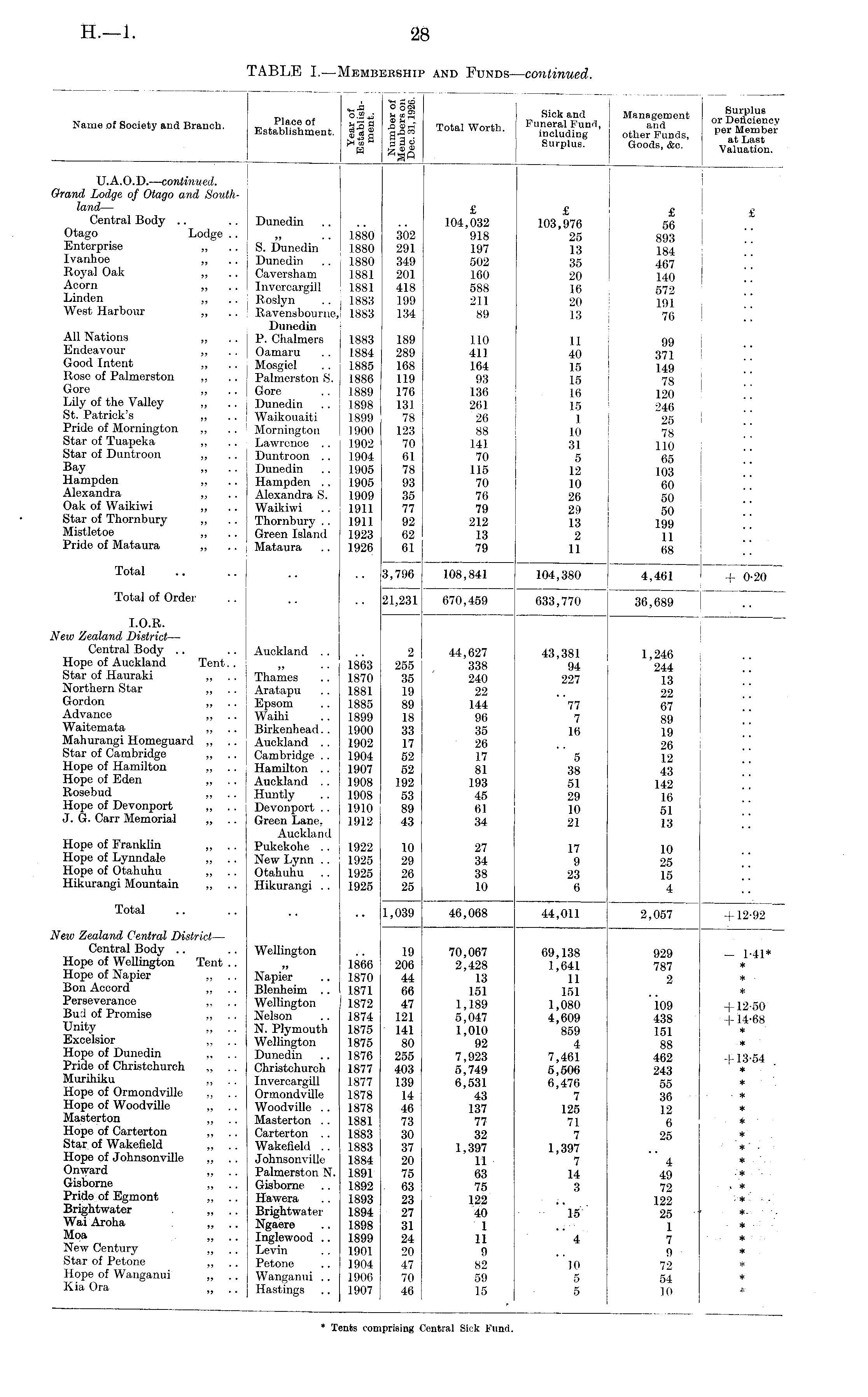 117 Sick and Management , „ r, UJ A^- US Name of Society and Branch. , ,,f jC ? 0 9 iin Total Worth Funeral Fund, and nnrMflS Establishment, gag a-2 ro worm. including other Funds, Per Member *g B |1| Sur P lus - Goods, &c. valuatfon. - __ ____ S5** __ U.A.O.D.—continued. Grand Lodge, of Otago and Southland— J £ £ £ £ Central Body .. .. Dunedin .. .. .. 104,032 103,976 56 ota g° Lodge .. „ .. 1880 302 918 25 893 Enterprise „ .. S. Dunedin 1880 291 197 13 184 Ivanhoe „ .. Dunedin .. 1880 349 502 35 467 Royal Oak „ .. Caversham 1881 201 160 20 140 Acorn » • • i Invercargill 1881 418 588 16 572 Linden „ .. [ Roslyn .. 1883 199 211 20 191 West Harbour „ .. | Ravensbourne, 1883 134 89 13 76 Dunedin All Nations „ .. P. Chalmers 1883 189 110 11 99 Endeavour „ .. Oamaru .. 1884 289 411 40 371 Good Intent „ ... Mosgiel . . 1885 168 164 15 149 Rose of Palmerston „ .. Palmerston 8. 1886 119 93 15 78 Gore „ .. ! Gore .. 1889 176 136 16 120 Lily of the Valley „ .. Dunedin .. 1898 131 261 15 246 St. Patrick's „ .. j Waikouaiti 1899 78 26 I "25 Pride of Mornington „ .. Mornington 1900 123 88 10 78 Star of Tuapeka „ .. Lawrence .. 1902 70 141 31 110 Star of Duntroon „ .. Duntroon .. 1.904 61 70 5 65 ® a y » • • Dunedin .. 1905 78 115 12 103 Hampden „ .. Hampden .. 1905 93 70 10 60 Alexandra „ .. Alexandra S. 1909 35 76 26 50 OakofWaikiwi „ .. Waikiwi .. 1911 77 79 29 50 Star of Thornbury „ .. Thornbury .. 1911 92 212 13 199 Mistletoe „ .. Green Island 1923 62 13 2 11 Pride of Mataura „ .. | Mataura .. 1926 61 79 11 68 Total •• .. 3,796 108,841 104,380 4,461 + 0-20 Total of Order .. .. 21,231 670,459 633,770 36,689 I.O.R. New Zealand District— Central Body .. .. Auckland .. .. 2 44,627 43,381 1 246 Hope of Auckland Tent.. „ .. 1863 255 338 94 '244 Star of Hauraki „ .. Thames .. 1870 35 ' 240 227 13 Northern Star „ .. Aratapu .. 1881 19 22 .. 22 Gordon „ .. Epsom .. 1885 89 144 77 67 Advance „ .. Waihi . . 1899 18 96 7 89 Waitemata „ .. Birkenhead.. 1900 33 35 16 19 Mahurangi Homeguard „ .. Auckland . . 1902 17 26 .. 26 Star of Cambridge ,, .. | Cambridge .. 1904 52 17 5 12 Hope of Hamilton „ .. Hamilton .. 1907 52 81 38 43 Hope of Eden „ .. Auckland .. 1908 192 193 51 142 Rosebud „ .. | Huntly .. 1908 53 45 29 16 Hope of Devonport „ .. j Devonport .. 1910 89 61 10 51 J. G. Carr Memorial „ .. Green Lane, 1912 43 34 21 13 Auckland Hope of Eranklin „ .. Pukekohe .. 1922 10 27 17 10 Hope of Lynndale „ .. New Lynn .. 1925 29 34 9 25 Hope of Otahuhu „ .. Otahuhu .. 1925 26 38 23 15 Hikurangi Mountain „ .. Hikurangi .. 1925 25 10 6 4 Total •• •• •• .. 1,039 46,068 44,011 2,057 +12-92 ~ New Zealand Central District— Central Body .. .. Wellington .. 19 70,067 69,138 929 — 1-41* Hope of Wellington Tent.. „ 1866 206 2,428 1,641 787 * Hope of Napier „ .. Napier .. 1870 44 13 11 2 * Bon Acoord „ .. Blenheim .. 1871 66 151 151 .. * Perseverance „ .. Wellington 1872 47 1,189 1,080 109 +12-50 Bud of Promise „ .. Nelson .. 1874 121 5,047 4,609 438 +14-68 Unity „ .. N.Plymouth 1875 141 1,010 859 151 * Excelsior „ .. Wellington 1875 80 92 4 88 * Hope of Dunedin „ .. Dunedin .. 1876 255 7,923 7,461 462 + 13-54 Pride of Christchurch „ .. Christchurch 1877 403 5,749 5,506 243 * Murihiku „ .. Invercargill 1877 139 6,531 6,476 55 * Hope of Ormondville „ .. Ormondville 1878 14 43 7 36 * Hope of Woodville „ .. Woodville .. 1878 46 137 125 12 * Masterton „ .. Masterton .. 1881 73 77 71 6 * Hope of Carterton „ .. Carterton .. 1883 30 32 7 25 * Star of Wakefield „ .. Wakefield .. 1883 37 1,397 1,397 .. V . Hope of Johnsonville „ .. Johnsonville 1884 20 11 7 "4 * Onward „ .. Palmerston N. 1891 75 63 14 49 * Gisborne „ .. Gisborne .. 1892 63 75 3 72 • * Pride of Egmont „ .. Hawera .. 1893 23 122 ... 122 - * Brightw'ater „ .. Brightwater 1894 27 40 15 25 * Wai Aroha „ .. Ngaere .. 1898 31 1 .. 1 * Moa „ .. Inglewood .. 1899 24 11 4 7 * New Century „ .. Levin .. 1901 20 9 .. 9 * Star of Petone „ .. Petone .. 1904 47 82 10 72 * Hope of Wanganui „ .. Wanganui .. 1906 70 59 5 54 * Kia Ora „ .. Hastings .. 1907 46 15 5 10 *' * Tents comprising Central Sick Fund.