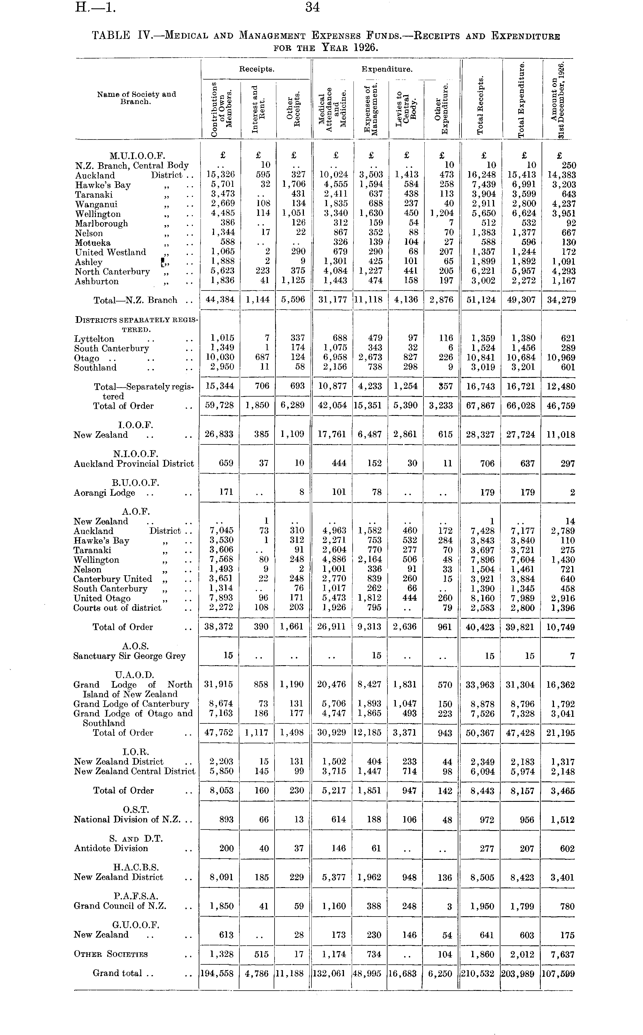 TABLE IV.—Medical and Management Expenses Funds. —Receipts and Expenditure for the Year 1926.