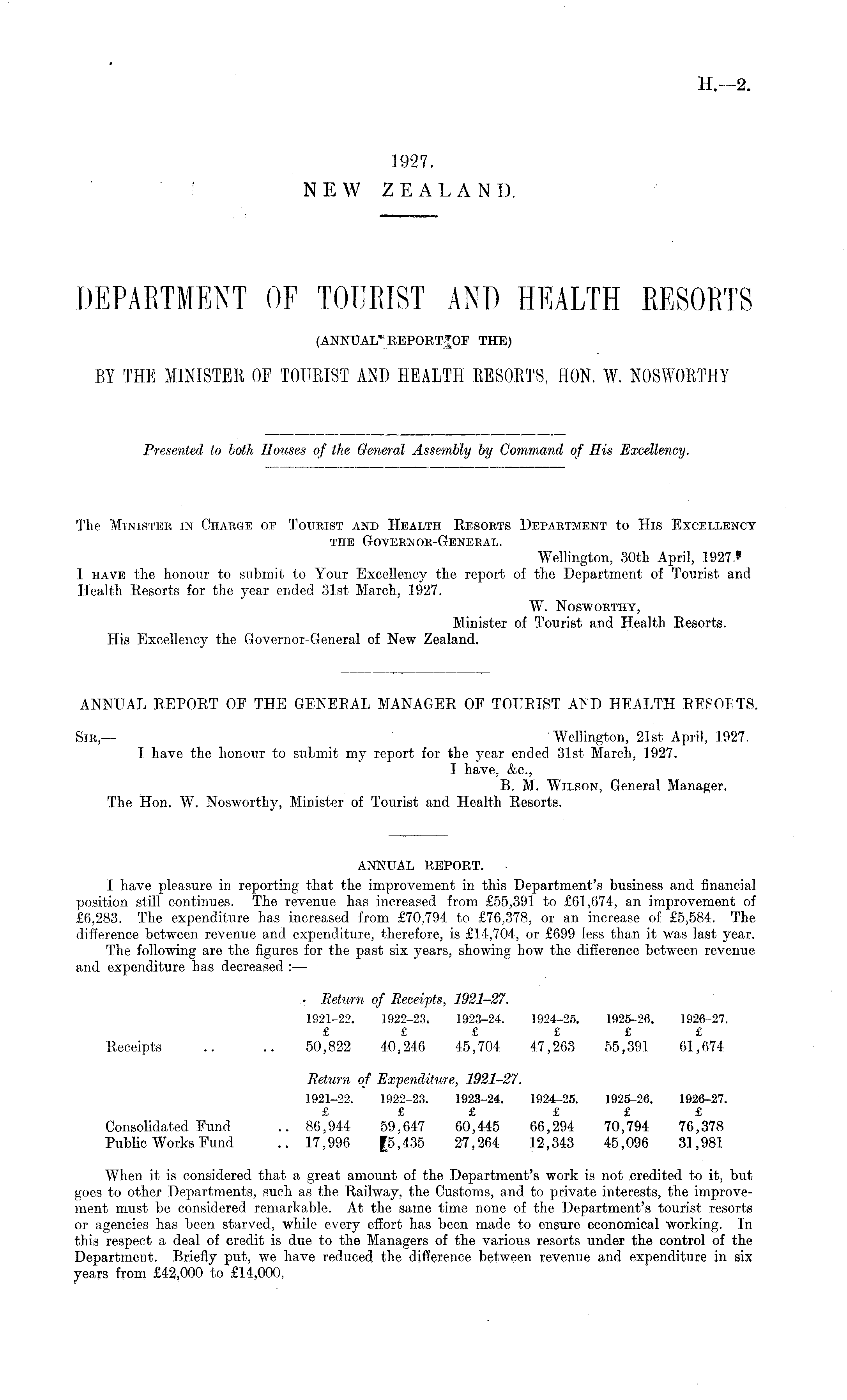 ANNUAL REPORT OF THE GENERAL MANAGER OF TOURIST AND HEALTH REVOLTS. Sir,— Wellington, 21st April, 1927. I have the honour to submit my report for the year ended 31st March, 1927. I have, &c., B. M. Wilson, General Manager. The Hon. W. Nosworthy, Minister of Tourist and Health Resorts.