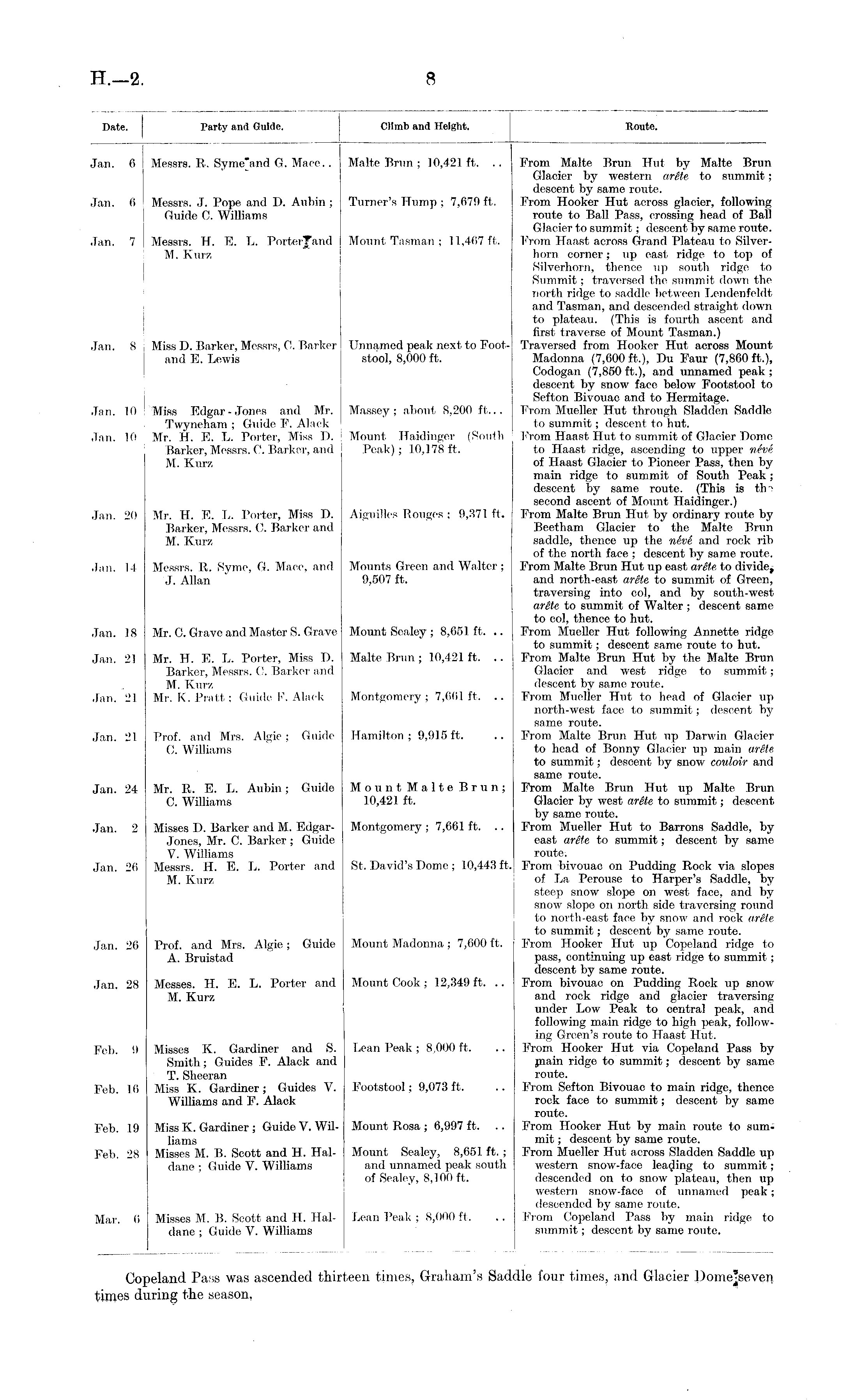 Date. Party and Guide. Climb and Height. | Route. Jan. 6 Messrs. R. Syme'and G. Mace.. Malte Brun; 10,421 ft. .. From Malte Brun Hut by Malte Brun Glacier by western arete to summit; descent by same route. Jan. 6 Messrs. J. Pope and D. Aubin; Turner's Hump ; 7,670 ft. From Hooker Hut across glacier, following Guide C. Williams route to Ball Pass, crossing head of Ball Glacier to summit; descent by same route. Jan. 7 Messrs. H. E. L. PorterJand Mount Tasman ; 11,467 ft. From Haast across Grand Plateau to SilverM. Kurz horn corner; up east ridge to top of Silverhorn, thence up south ridge to Summit; traversed the summit down the north ridge to saddle between Lendenfeldt and Tasman, and descended straight down to plateau. (This is fourth ascent and first traverse of Mount Tasman.) Jan. 8 Miss D. Barker, Messrs, 0. Barker Unnamed peak next to Foot- Traversed from Hooker Hut across Mount and E. Lewis stool, 8,000 ft. Madonna (7,600 ft.), Du Faur (7,860 ft.), Codogan (7,850 ft.), and unnamed peak ; descent by snow face below Footstool to Sefton Bivouac and to Hermitage. Jan. 10 Miss Edgar-Jones and Mr. Massey; about 8,200 ft... From Mueller Hut through Sladden Saddle Twyneham ; Guide F. Alack to summit; descent to hut. Jan. 10 Mr. H. E. L. Porter, Miss D. Mount Haidinger (South From Haast Hut to summit of Glacier Dome Barker, Messrs. C. Barker, and Peak); 10,178 ft. to Haast ridge, ascending to upper neve M. Kurz of Haast Glacier to Pioneer Pass, then by main ridge to summit of South Peak; descent by same route. (This is tin second ascent of Mount Haidinger.) Jan. 20 Mr. H. E. L. Porter, Miss D. Aiguilles Rouges ; 9,371 ft. From Malte Brun Hut by ordinary route by Barker, Messrs. C. Barker and Beetham Glacier to the Malte Brun M. Kurz saddle, thence up the neve and rock rib of the north face ; descent by same route. Jan. 14 Messrs. R. Syme, G. Mace, and Mounts Green and Walter ; From Malte Brun Hut up east artte to divide, J. Allan 9,507 ft. and north-east arete to summit of Green, traversing into col, and by south-west artte to summit of Walter ; descent same to col, thence to hut. Jan. 18 Mr. C. Grave and Master S. Grave Mount Sealey ; 8,651ft. .. From Mueller Hut following Annette ridge to summit; descent same route to hut. Jan. 21 Mr. H. E. L. Porter, Miss 1). Malte Brun; 10,421 ft. .. From Malte Brun Hut by the Malte Brun Barker, Messrs. C. Barker and Glacier and west ridge to summit; M. Kurz descent by same route. Jan. 21 Mr. K.Pratt; Guide F. Alack Montgomery; 7,661ft. .. From Mueller Hut to head of Glacier up north-west face to summit; descent by same route. Jan. 21 Prof, and Mrs. Algie; Guide Hamilton; 9,915 ft. .. From Malte Brun Hut up Darwin Glacier C. Williams to head of Bonny Glacier up main arete to summit; descent by snow couloir and same route. Jan. 24 Mr. R. E. L. Aubin; Guide Mount Malte Brun; From Malte Brun Hut up Malte Brun C. Williams 10,421 ft. Glacier by west artte to summit; descent by same route. Jan. 2 Misses D. Barker and M. Edgar- Montgomery ; 7,661 ft. .. From Mueller Hut to Barrons Saddle, by Jones, Mr. C. Barker; Guide east artte to summit; descent by same V. Williams route. Jan. 26 Messrs. H. E. L. Porter and St. David's Dome; 10,443 ft. From bivouac on Pudding Rock via slopes M. Kurz of La Perouse to Harper's Saddle, by steep snow slope on west face, and by snow slope on north side traversing round to north-east face by snow and rock artte to summit; descent by same route. Jan. 26 Prof, and Mrs. Algie; Guide Mount Madonna; 7,600 ft. From Hooker Hut up Copeland ridge to A. Bruistad pass, continuing up east ridge to summit; descent by same route. Jan. 28 Messes. H. E. L. Porter and Mount Cook; 12,349 ft. .. From bivouac on Pudding Rock up snow M. Kurz and rock ridge and glacier traversing under Low Peak to central peak, and following main ridge to high peak, following Green's route to Haast Hut. Feb. 9 Misses K. Gardiner and S. Lean Peak; 8,000 ft. .. From Hooker Hut via Copeland Pass by Smith; Guides F. Alack and plain ridge to summit; descent by same T. Sheeran route. Feb. 16 Miss K. Gardiner; Guides V. Footstool; 9,073ft. .. From Sefton Bivouac to main ridge, thence Williams and F. Alack rock face to summit; descent by same route. Feb. 19 Miss K. Gardiner ; Guide V. Wil- Mount Rosa ; 6,997 ft. .. From Hooker Hut by main route to Bumliams mit; descent by same route. Feb. 28 Misses M. B. Scott and H. Hal- Mount Sealey, 8,651 ft. ; From Mueller Hut across Sladden Saddle up dane ; Guide V. Williams and unnamed peak south western snow-face leading to summit; of Sealey, 8,100 ft. descended on to snow plateau, then up western snow-face of unnamed peak; descended by same route. Mar. 6 Misses M. B. Scott and H. Hal- Lean Peak ; 8,000 ft. .. From Copeland Pass by main ridge to dane ; Guide V. Williams summit; descent by same route. Copeland Pass was ascended thirteen times, Graham's Saddle four times, and Glacier IJome^seven times during the season,