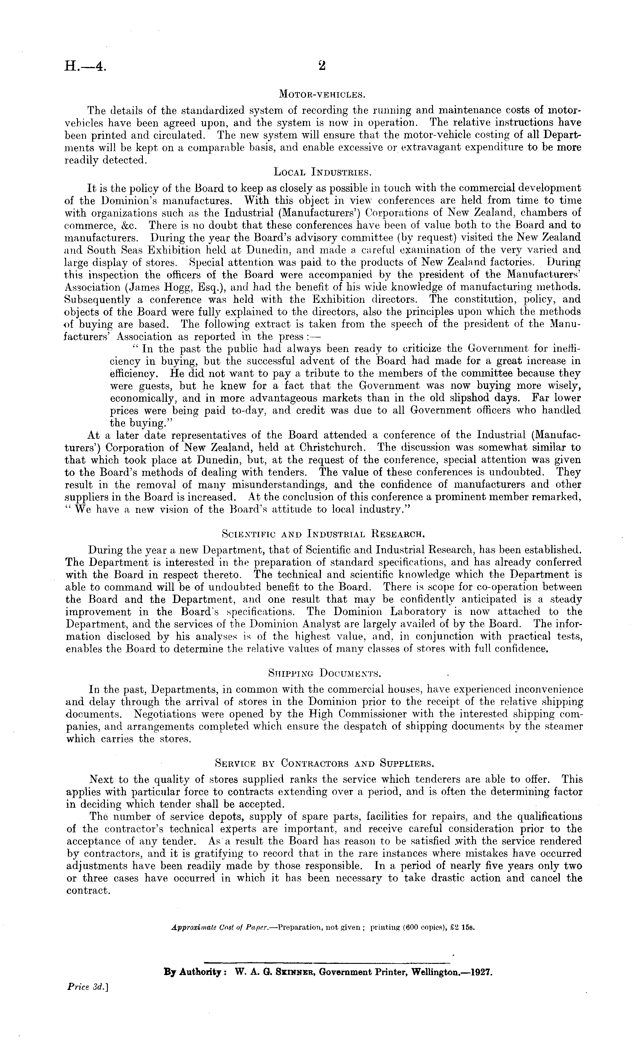 Motor-vehicles. The details of the standardized system of recording the running and maintenance costs of motorvehicles have been agreed upon, and the system is now in operation. The relative instructions have been printed and circulated. The new system will ensure that the motor-vehicle costing of all Departments will be kept on a comparable basis, and enable excessive or extravagant expenditure to be more readily detected. Local Industries. It is the policy of the Board to keep as closely as possible in touch with the commercial development of the Dominion's manufactures. With this object in view conferences are held from time to time with organizations such as the Industrial (Manufacturers') Corporations of New Zealand, chambers of commerce, &c. There is no doubt that these conferences have been of value both to the Board and to manufacturers. During the year the Board's advisory committee (by request) visited the New Zealand and South Seas Exhibition held at Dunedin, and made a careful examination of the very varied and large display of stores. Special attention was paid to the products of New Zealand factories. During this inspection the officers of the Board were accompanied by the president of the Manufacturers' Association (James Hogg, Esq.), and had the benefit of his wide knowledge of manufacturing methods. Subsequently a conference was held with the Exhibition directors. The constitution, policy, and objects of the Board were fully explained to the directors, also the principles upon which the methods of buying are based. The following extract is taken from the speech of the president of the Manufacturers' Association as reported in the press : —- " In the past the public had always been ready to criticize the Government for inefficiency in buying, but the successful advent of the Board had made for a great increase in efficiency. He did not want to pay a tribute to the members of the committee because they were guests, but he knew for a fact that the Government was now buying more wisely, economically, and in more advantageous markets than in the old slipshod days. Far lower prices were being paid to-day, and credit was due to all Government officers who handled the buying." At a later date representatives of the Board attended a conference of the Industrial (Manufacturers') Corporation of New Zealand, held at Christchurch. The discussion was somewhat similar to that which took place at Dunedin, but, at the request of the conference, special attention was given to the Board's methods of dealing with tenders. The value of these conferences is undoubted. They result in the removal of many misunderstandings, and the confidence of manufacturers and other suppliers in the Board is increased. At the conclusion of this conference a prominent member remarked, " We have a new vision of the Board's attitude to local industry." Scientific and Industrial Research. During the year a new Department, that of Scientific and Industrial Research, has been established. The Department is interested in the preparation of standard specifications, and has already conferred with the Board in respect thereto. The technical and scientific knowledge which the Department is able to command will be of undoubted benefit to the Board. There is scope for co-operation between the Board and the Department, and one result that may be confidently anticipated is a steady improvement in the Board's specifications. The Dominion Laboratory is now attached to the Department, and the services of the Dominion Analyst are largely availed of by the Board. The information disclosed by his analyses is of the highest value, and, in conjunction with practical tests, enables the Board to determine the relative values of many classes of stores with full confidence. Shipping Documents. In the past, Departments, in common with the commercial houses, have experienced inconvenience and delay through the arrival of stores in the Dominion prior to the receipt of the relative shipping documents. Negotiations were opened by the High Commissioner with the interested shipping companies, and arrangements completed which ensure the despatch of shipping documents by the steamer which carries the stores. Service by Contractors and Suppliers. Next to the quality of stores supplied ranks the service which tenderers are able to offer. This applies with particular force to contracts extending over a period, and is often the determining factor in deciding which tender shall be accepted. The number of service depots, supply of spare parts, facilities for repairs, and the qualifications of the contractor's technical experts are important, and receive careful consideration prior to the acceptance of any tender. As a result the Board has reason to be satisfied with the service rendered by contractors, and it is gratifying to record that in the rare instances where mistakes have occurred adjustments have been readily made by those responsible. In a period of nearly five years only two or three cases have occurred in which it has been necessary to take drastic action and cancel the contract.