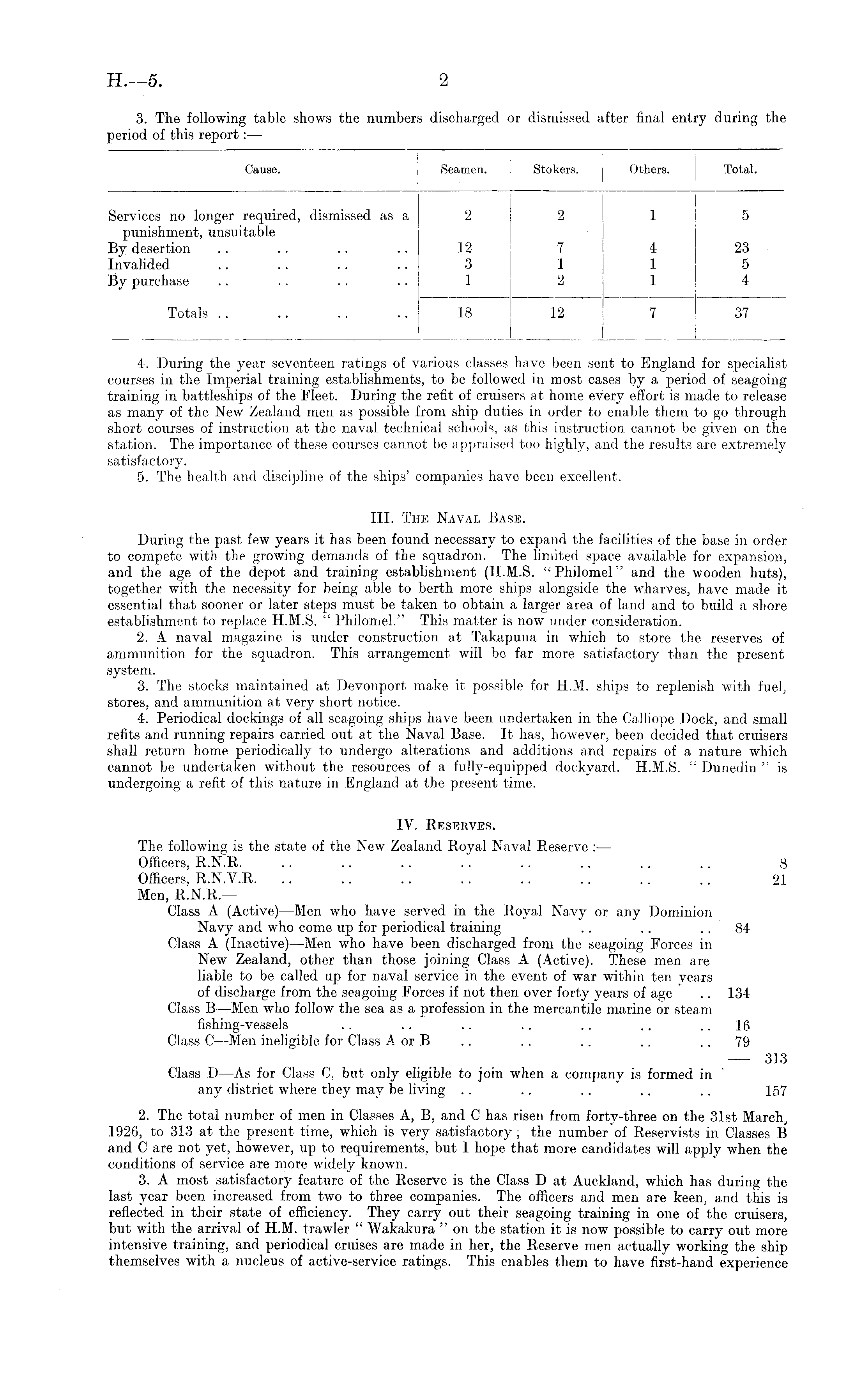 4. During the year seventeen ratings of various classes have been sent to England for specialist courses in the Imperial training establishments, to be followed in most cases by a period of seagoing training in battleships of the Fleet. During the refit of cruisers at home every effort is made to release as many of the New Zealand men as possible from ship duties in order to enable them to go through short courses of instruction at the naval technical schools, as this instruction cannot be given on the station. The importance of these courses cannot be appraised too highly, and the results are extremely satisfactory. 5. The health and discipline of the ships' companies have been excellent. 111. The Naval Base. During the past few years it has been found necessary to expand the facilities of the base in order to compete with the growing demands of the squadron. The limited space available for expansion, and the age of the depot and training establishment (H.M.S. "Philomel" and the wooden huts), together with the necessity for being able to berth more ships alongside the wharves, have made it essentia] that sooner or later steps must be taken to obtain a larger area of land and to build a shore establishment to replace H.M.S. " Philomel." This matter is now under consideration. 2. A naval magazine is under construction at Takapuna in which to store the reserves of ammunition for the squadron. This arrangement will be far more satisfactory than the present system. 3. The stocks maintained at Devonport make it possible for H.M. ships to replenish with fuel, stores, and ammunition at very short notice. 4. Periodical dockings of all seagoing ships have been undertaken in the Calliope Dock, and small refits and running repairs carried out at the Naval Base. It has, however, been decided that cruisers shall return home periodically to undergo alterations and additions and repairs of a nature which cannot be undertaken without the resources of a fully-equipped dockyard. H.M.S. " Dunedin " is undergoing a refit of this nature in England at the present time. IV. Beserves. The following is the state of the New Zealand Boyal Naval Beserve : — Officers, 8.N.8. . . .. .. .. .. .. .. .. 8 Officers. 8.N.V.8. .. .. .. .. .. .. .. .. 21 Men, 8N.8.— Class A (Active) —Men who have served in the Boyal Navy or any Dominion Navy and who come up for periodical training .. .. 84 Class A (Inactive) —Men who have been discharged from the seagoing Forces in New Zealand, other than those joining Class A (Active). These men are liable to be called up for naval service, in the event of war within ten years of discharge from the seagoing Forces if not then over forty years of age .. 134 Class B —Men who follow the sea as a profession in the mercantile marine or steam fishing-vessels .. .. .. .. .. .. 16 Class C —Men ineligible for Class A or B .. .. .. .. 79 313 Class D —As for Class C, but only eligible to join when a company is formed in any district where they may be living .. .. .. .. .. 157 2. The total number of men in Classes A, B, and C has risen from forty-three on the 31st March, 1926, to 313 at the present time, which is very satisfactory ; the number of Beservists in Classes B and C are not yet, however, up to requirements, but I hope that more candidates will apply when the conditions of service are more widely known. 3. A most satisfactory feature of the Beserve is the Class D at Auckland, which has during the last year been increased from two to three companies. The officers and men are keen, and this is reflected in their state of efficiency. They carry out their seagoing training in one of the cruisers, but with the arrival of H.M. trawler " Wakakura " on the station it is now possible to carry out more intensive training, and periodical cruises are made in her, the Reserve men actually working the ship themselves with a nucleus of active-service ratings. This enables them to have first-hand experience